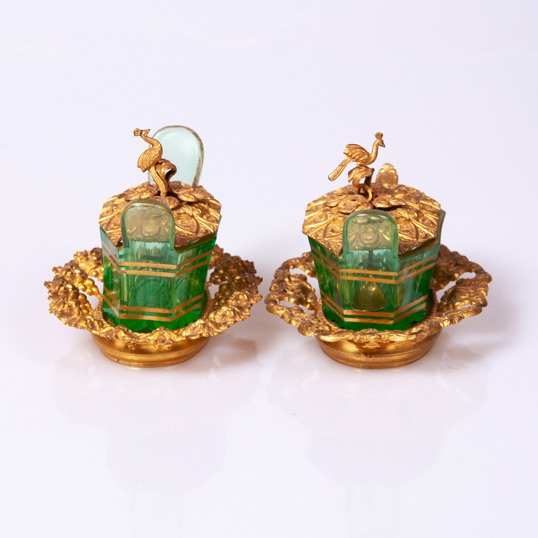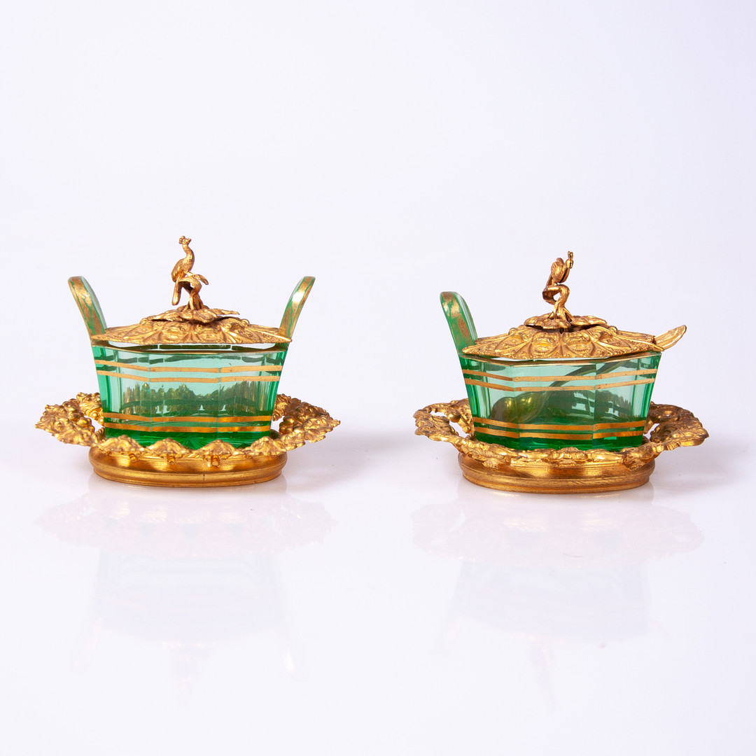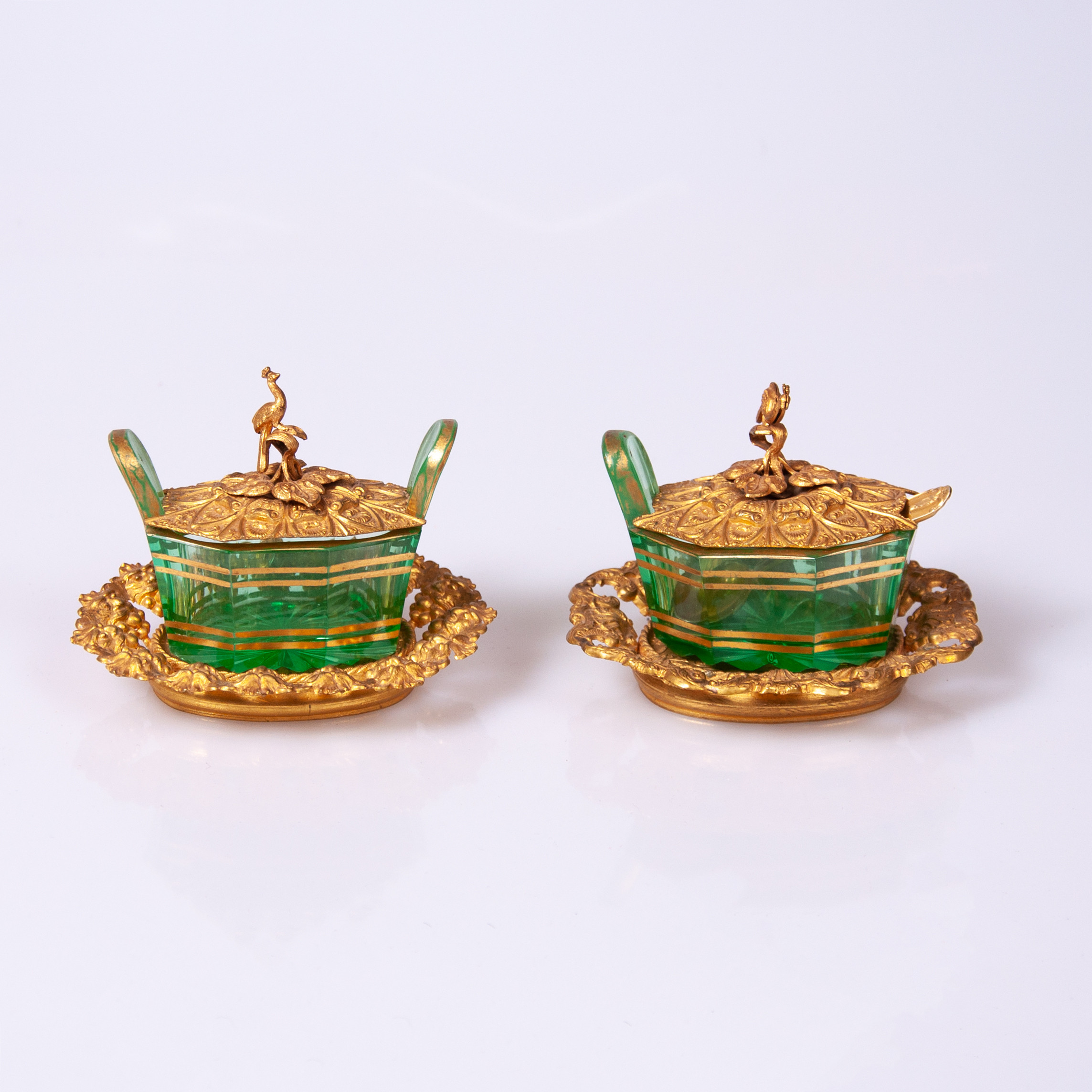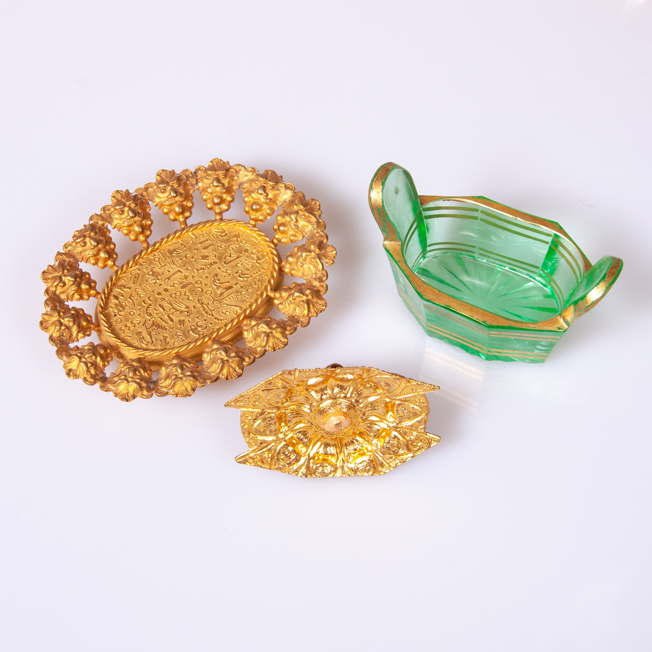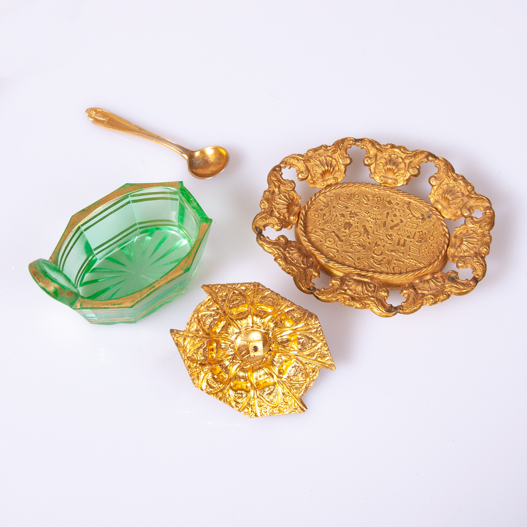 1652380. SALZTÖPFE. 3 Teile, Messing und Glas.