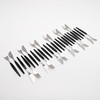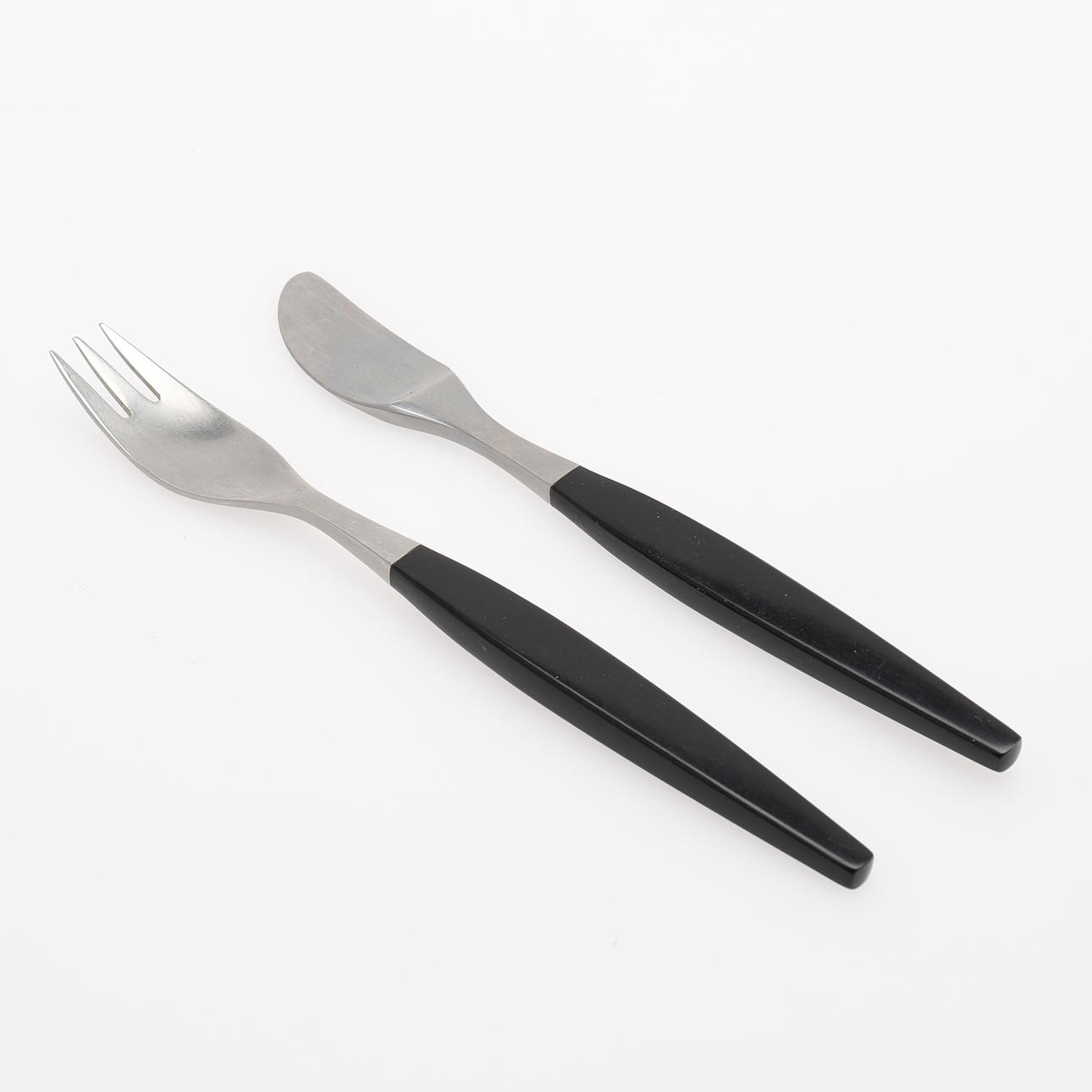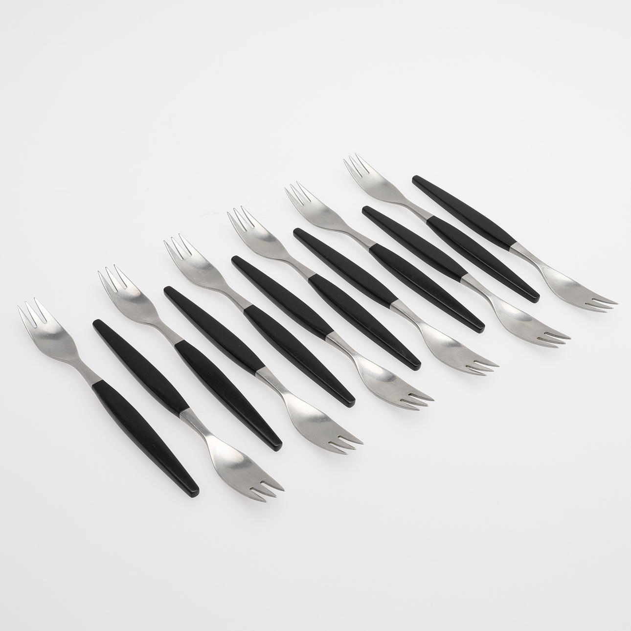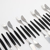 Edelstahl und schwarzer Kunststoff, 12 Messer Länge ca. 17 cm, 12 Gabeln Länge ca. 17 cm.