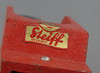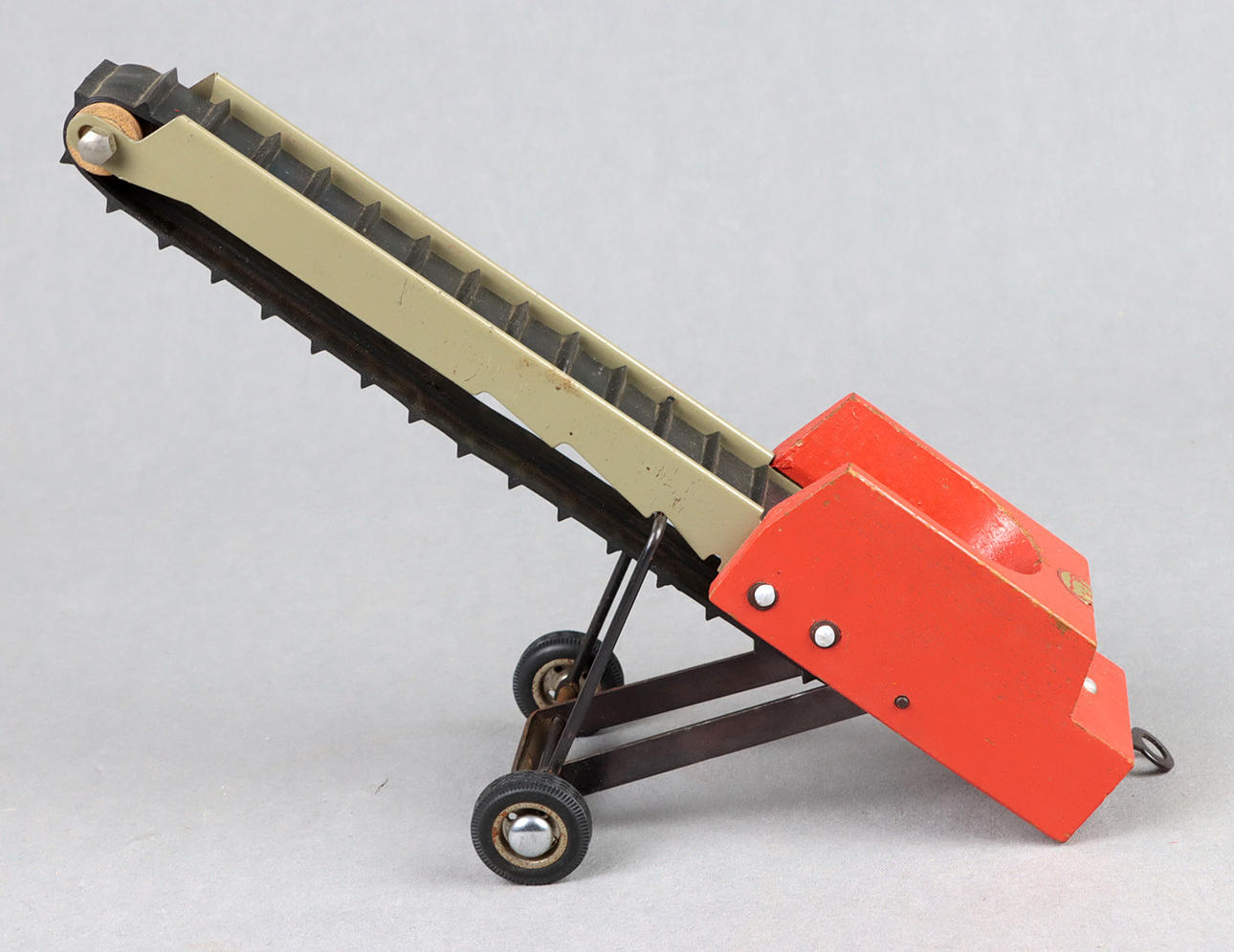Förderband farbiges Blech, Holz und Gummi, Förderband mit seitlicher Kurbel auf 2 gummibereiften Rädern, L ca. 28 cm, Klebeetikett Steiff.