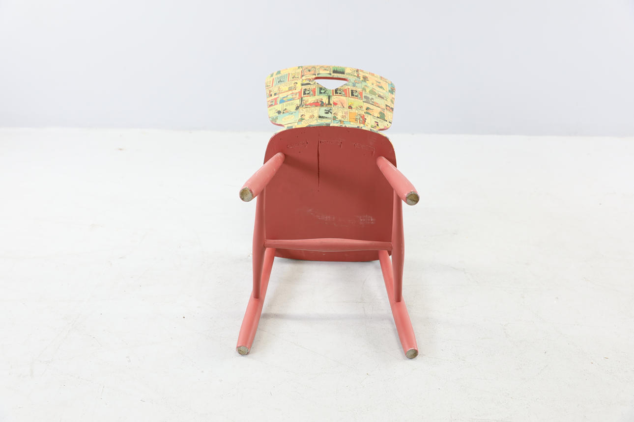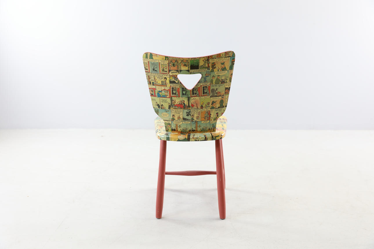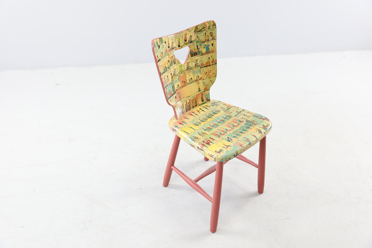 Holzstuhl verziert mit Comicstrips, Decoupage.