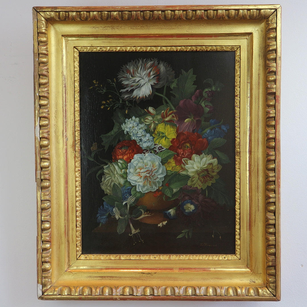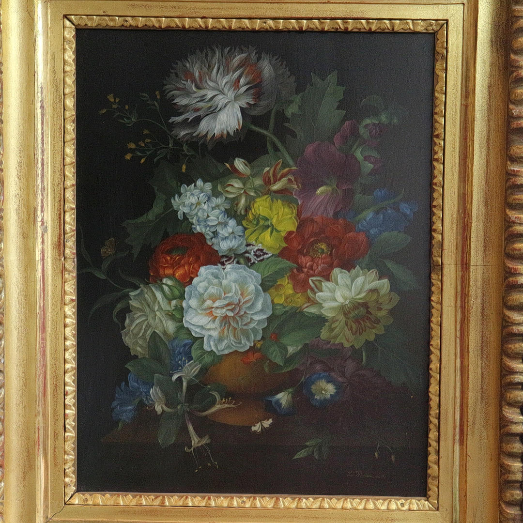 Öl auf Holz, Bildmaße: 40 x 31 cm, Rahmenmaße: 54 x 44 cm, nach altmeisterlichem Vorbild der holländischen Malerei des 17. Jahrhundert, in Biedermeier Ochsenaugenrahmen.