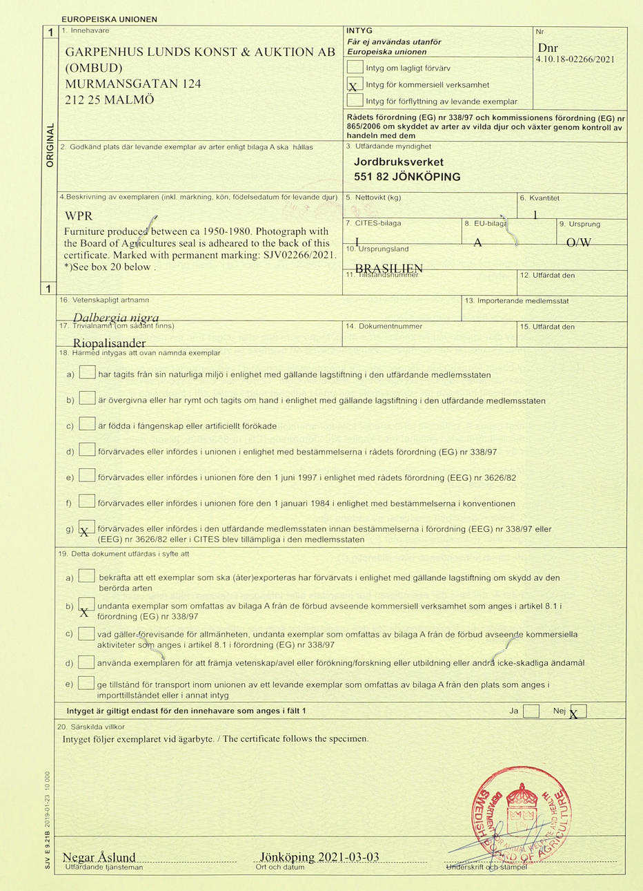 CITES-Bescheinigung liegt bei. Ausfuhrgenehmigung für Ausfuhren außerhalb der EU erforderlich.