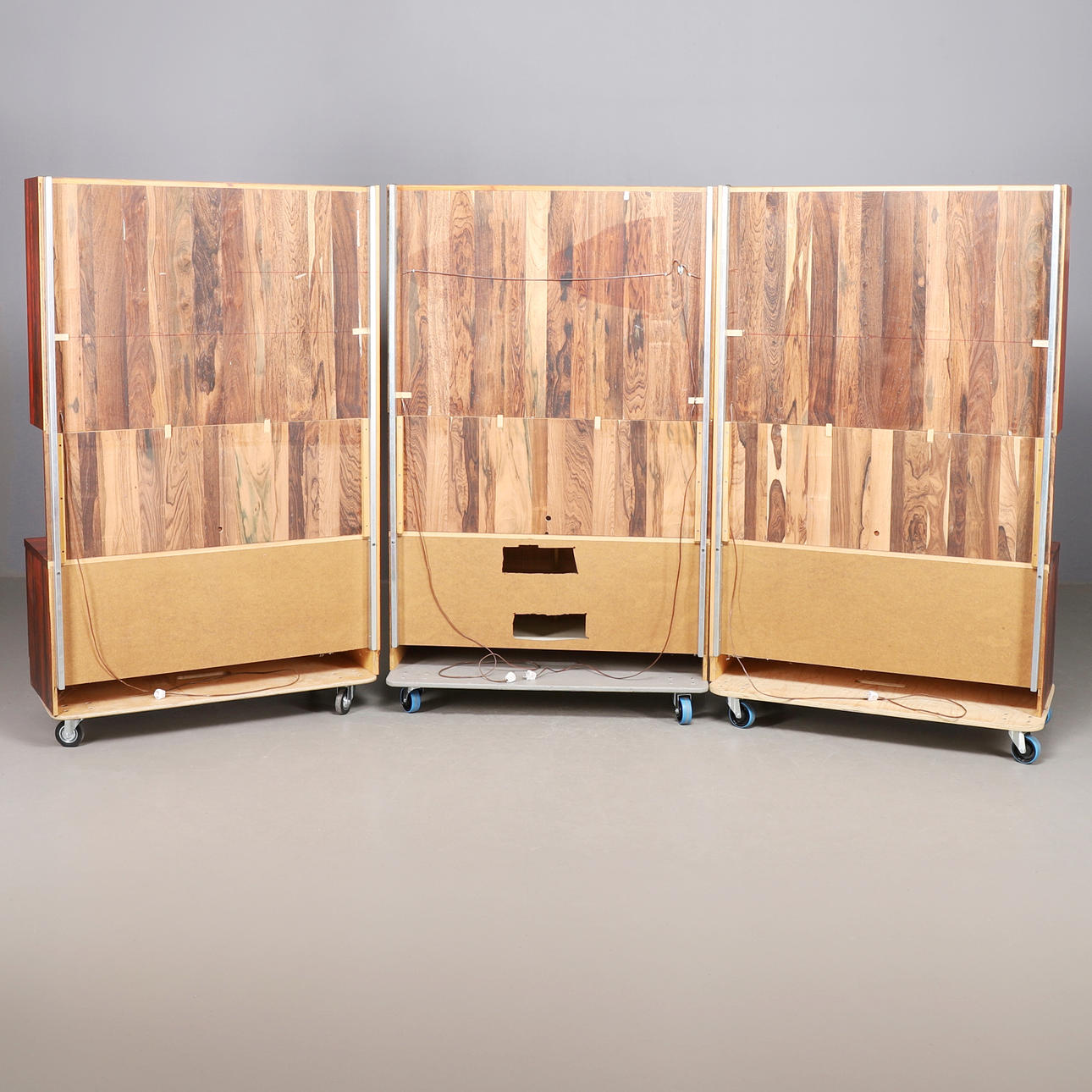 Regalsystem in drei Teilen, Stahltragrahmen, Oberteile mit Regalen und Vitrinen mit integrierter Beleuchtung, zwei Unterschränke mit Regalen und einer mit Aktenaufhängern. Zwischen oberer und unterer Dekorplatte mit einer Höhe von 44 cm.
