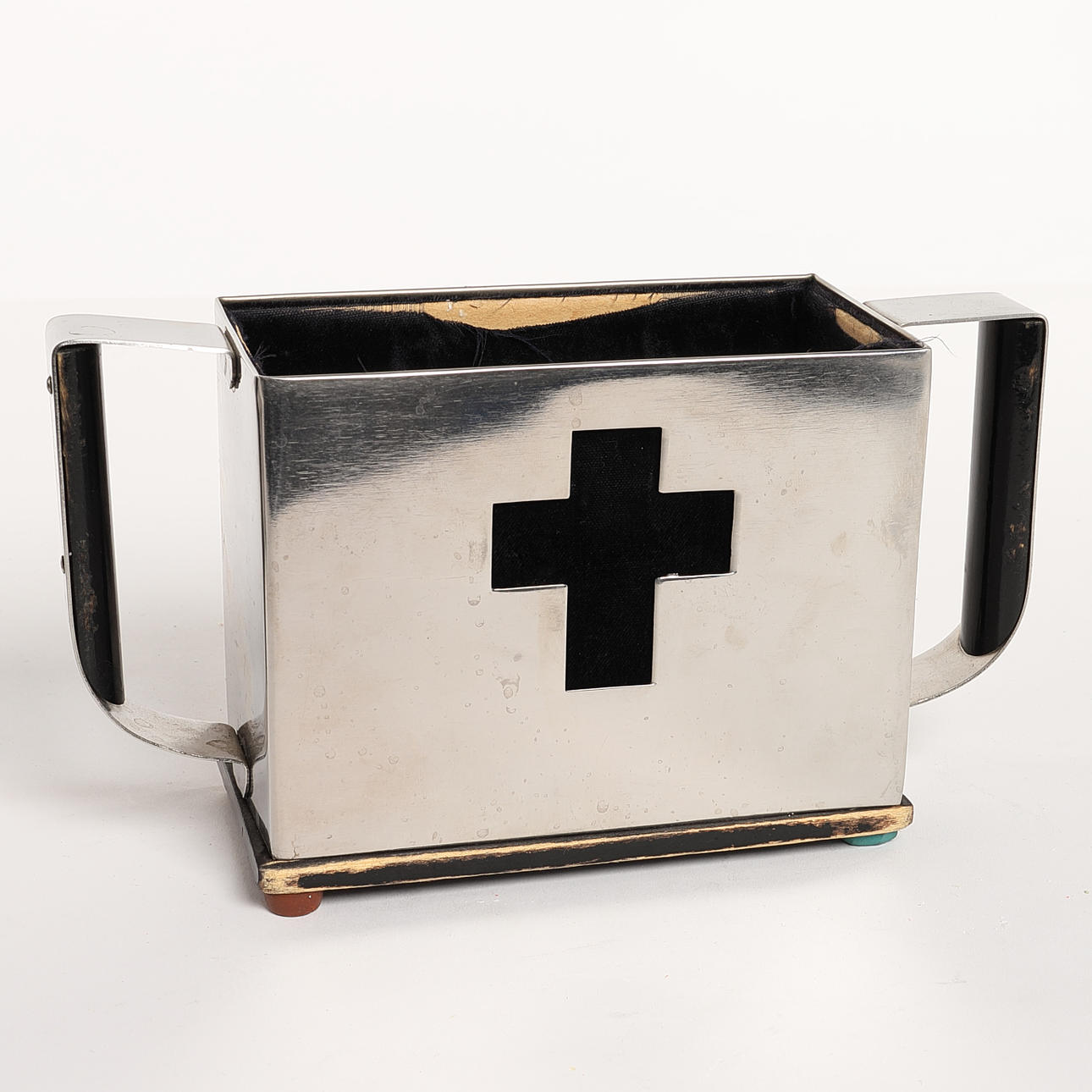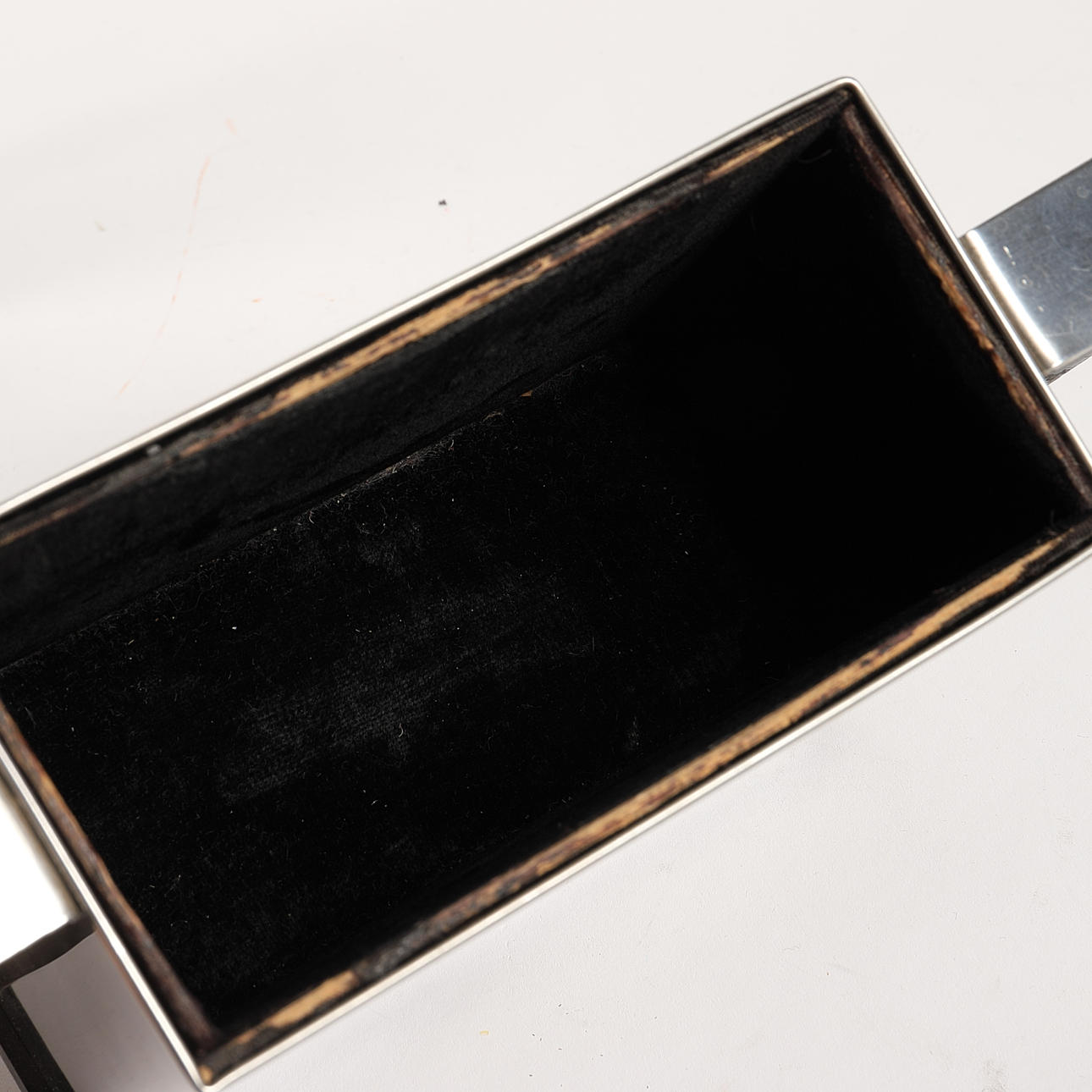 abgenutztes Samtfutter und Holzsockel, ein Gummifuß wurde ersetzt, wahrscheinlich mit Suddi-Gummi.