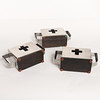 3 Sammeldosen aus silberfarbenem Metall und braunem Holz, Details und Innenfutter aus schwarzem Samt, Höhe 12,5, Gesamtbreite 23x7,5 cm.
