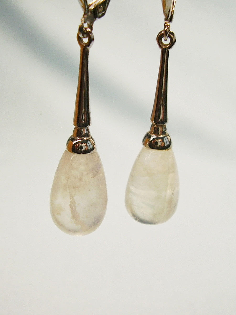 An langgestreckten Abhängungen sind polierte silberblau irisierende Mondstein-Tropfen beweglich abgehängt.