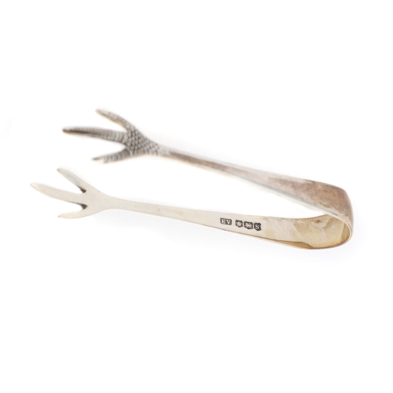 Gourdel, Vales & Co, Birmingham 1904, Blattranke um Schildkartusche graviert, mit Initialen eingeritzt, 2,8 x 2,3 cm, mit Ringansatz, schlichter runder silberner Serviettenring, Birmingham 1922, Herstellermarke berieben, 4,5 cm Durchmesser, Paar aus silberner Zuckerzange mit Klauenenden, Emile Viner, Sheffield 1935, 8cm lang, einem silbernen Löffel zur Erinnerung an die Krönung Mai 1937, Birmingham 1936, 9,7cm und einem Paar silberner dreizackiger Gabeln, Emile Viner, Sheffield 1937, mit Mutter aus Perlenkapitellen, 9,2 cm, 51,4 g, 1,64 Unzen (6) Das Eigentum eines Verstorbenen, verkauft im Auftrag der Testamentsvollstrecker.