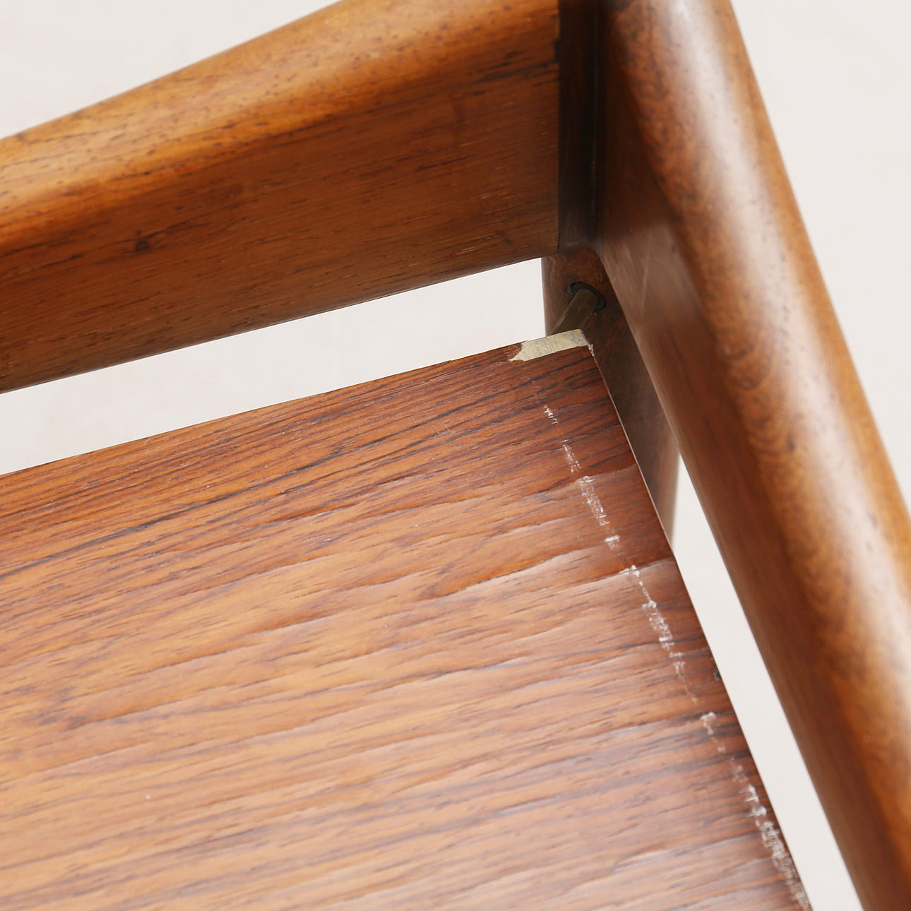 Das Jacaranda-Imitat auf dem Brett hat Risse sowie Flecken und minimalen Furnierabrieb.