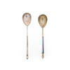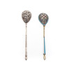 Moskau, Herstellermarke AT, der sich verjüngende Stiel türkis und weiß emailliert, die Rückseite der birnenförmigen Kuppa verschiedenfarbig emailliert, 10,5 cm lang und eine weitere, Herstellermarke undeutlich, mit gedrehtem Stiel, die Kuppa rückseitig schwarz emailliert Rankenwerk, 11 cm lang, 27 g, 0,86 Unzen (2).