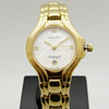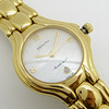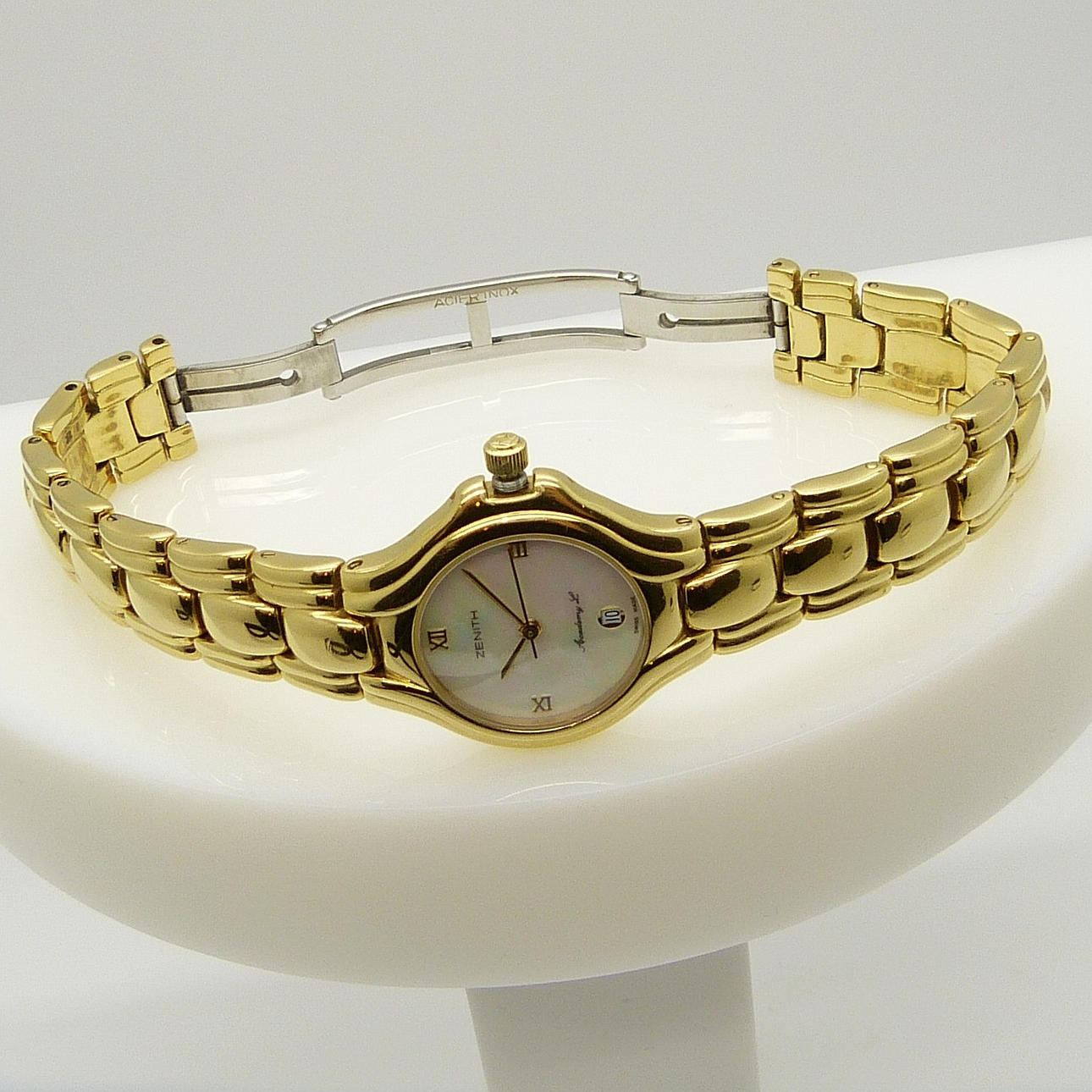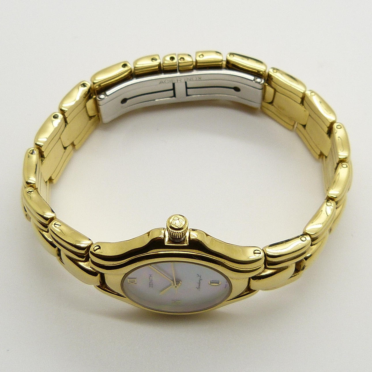 Diese Zenith-Uhr hat ein perlmuttfarbenes, schillerndes Zifferblatt, ein goldfarbenes Zifferblatt und ein Datumsfenster.