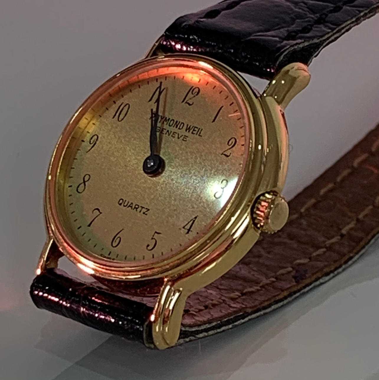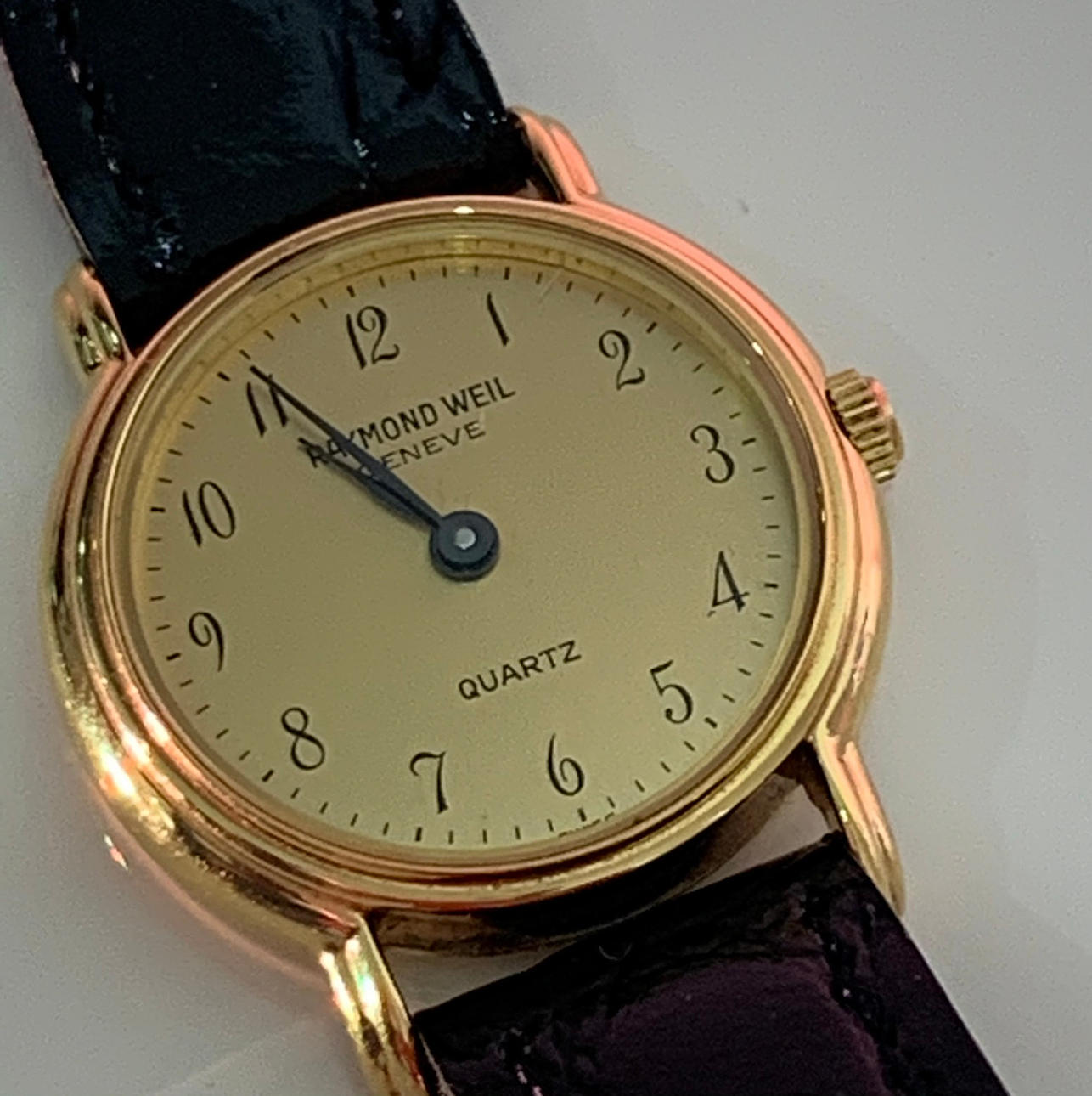 Dies ist eine in der Schweiz hergestellte Armbanduhr von Raymond Weil Geneve. Diese Raymond Weil Uhr ist mit 18 Karat Gold galvanisiert.