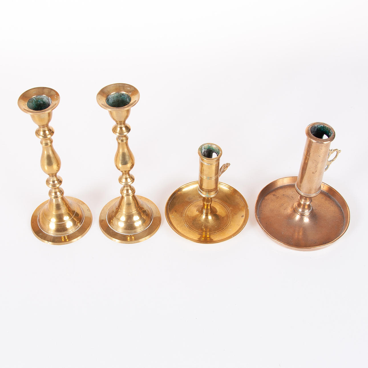 2 Nachttischleuchter, Höhe 14 und 11 cm. Paar Messingleuchter, Höhe 19 cm.