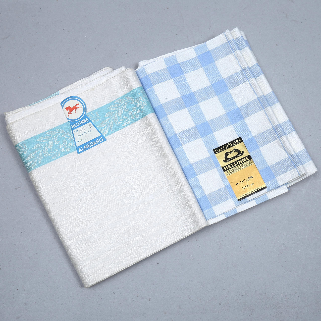 2 unbeschnittene Blätter mit je 3 Handtüchern, Leinen, Almedahls.