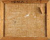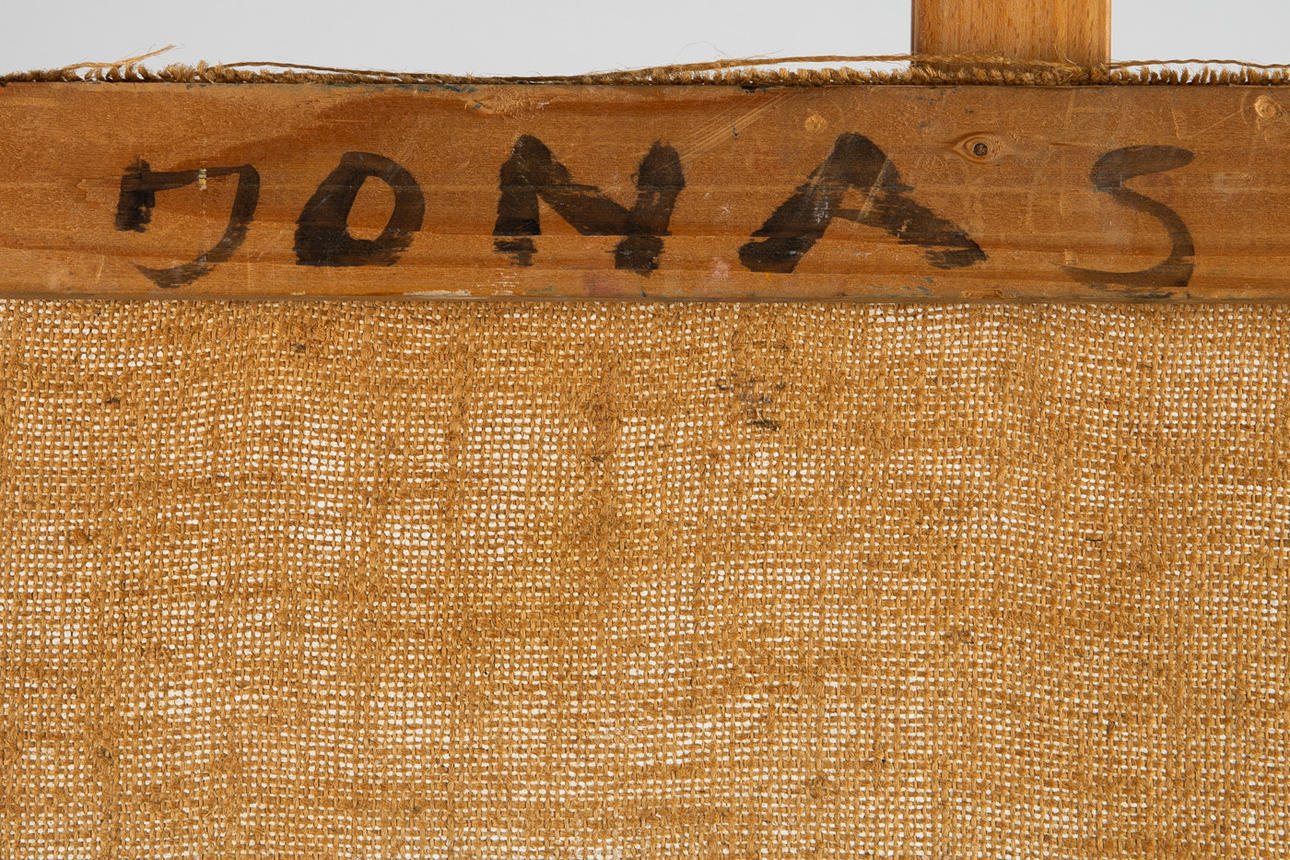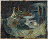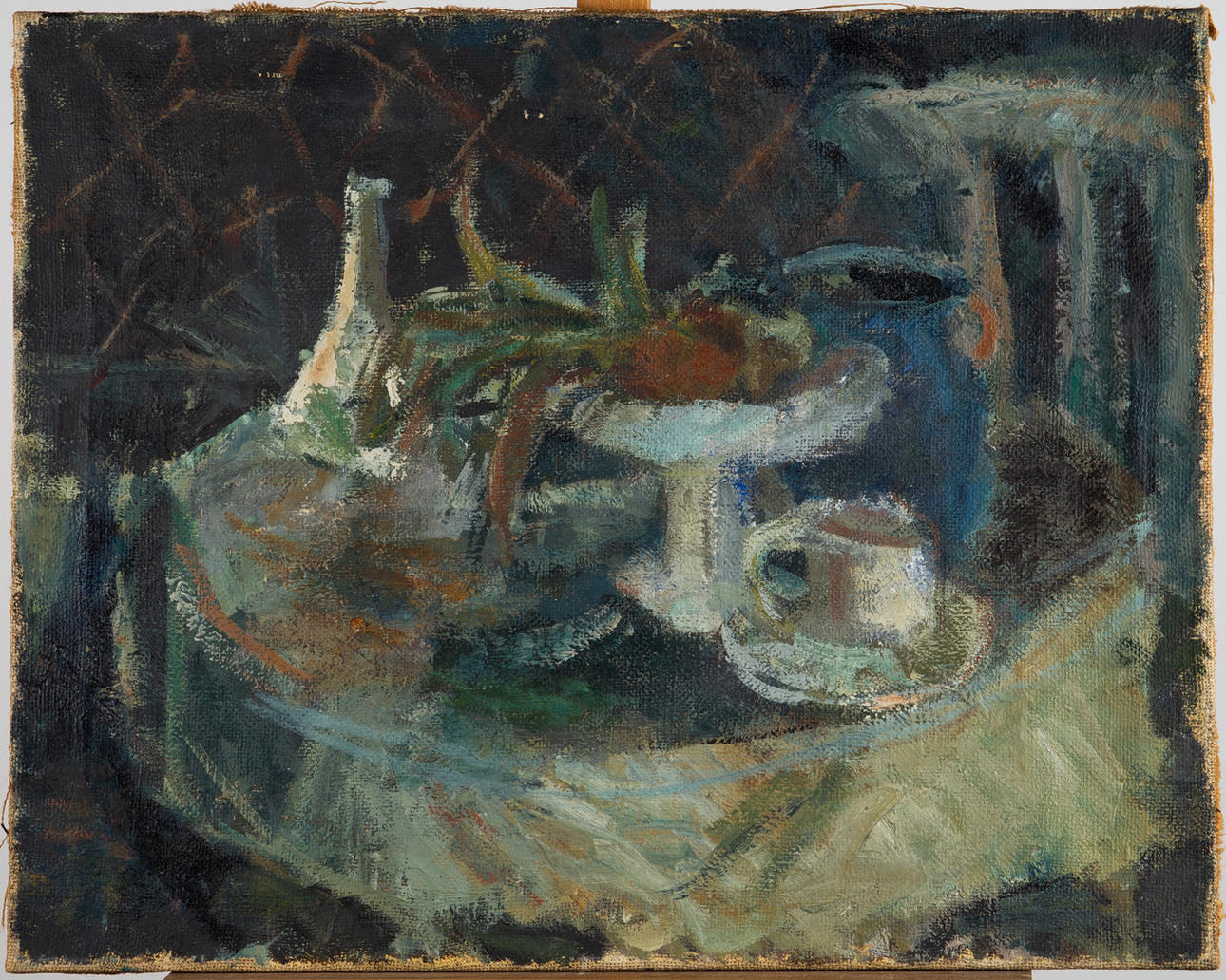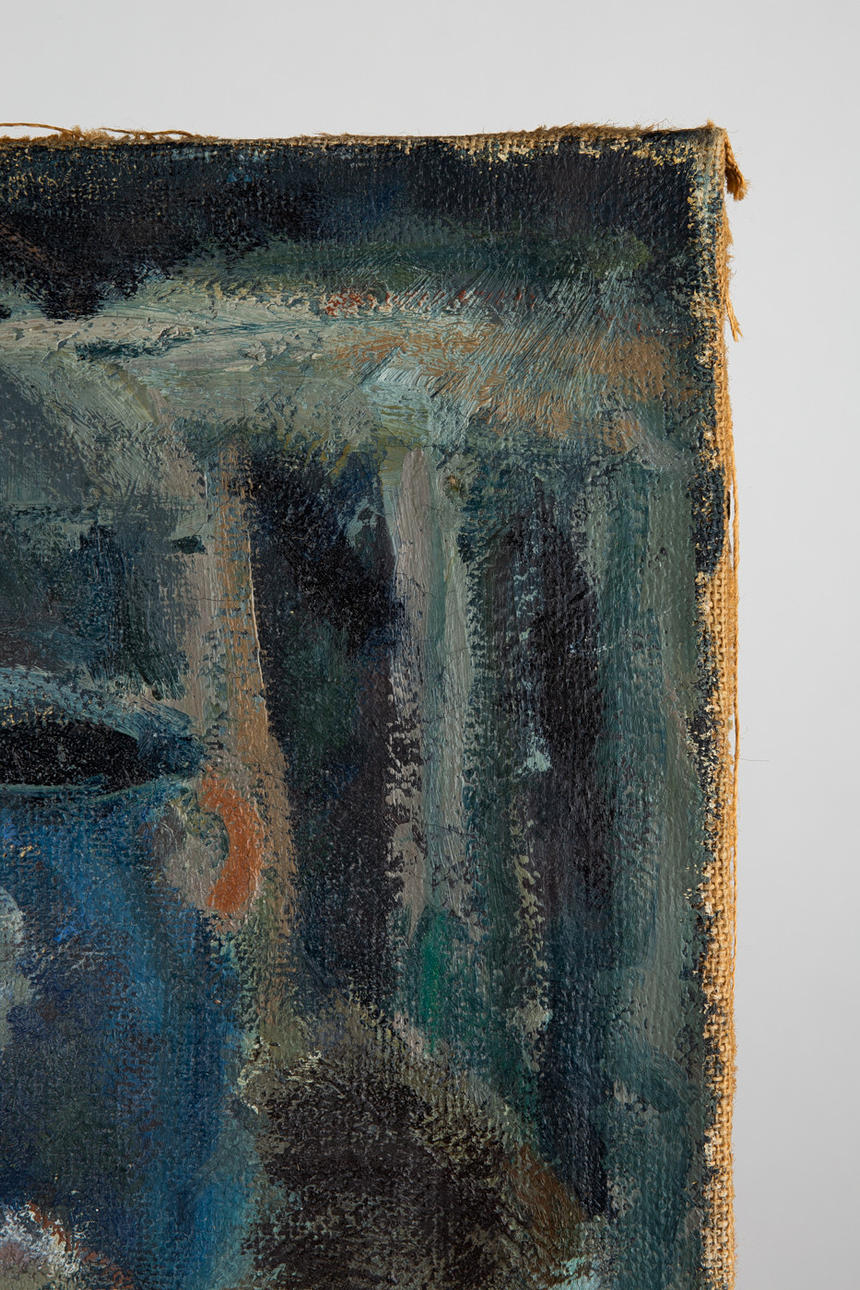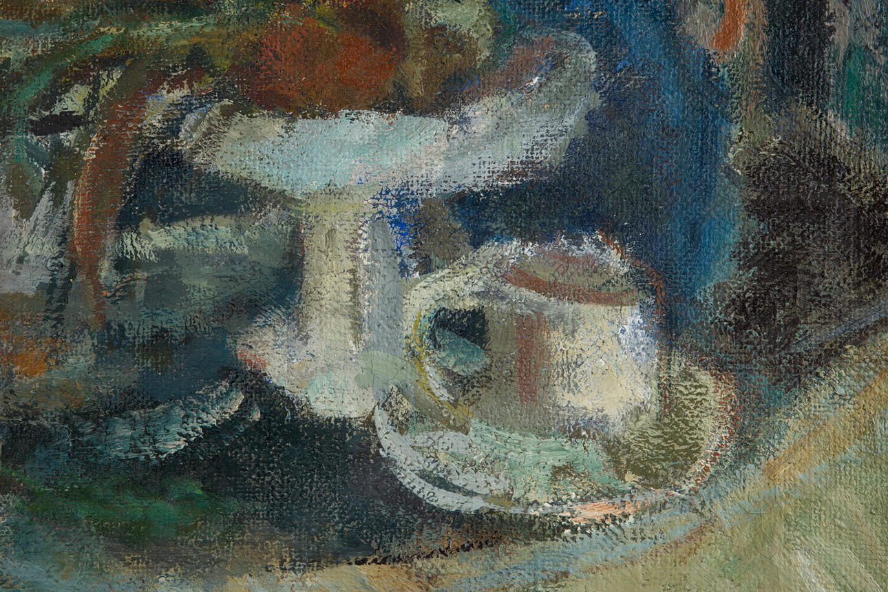 Unbekannter Künstler, Gemälde, Stillleben mit Obstschale, Öl auf Leinwand. Darstellung eines abstrakten Stilllebens mit Obstschale und Tasse in Blau, rückseitig am Rahmen mit 'Jonas' bezeichnet, 56x69cm.