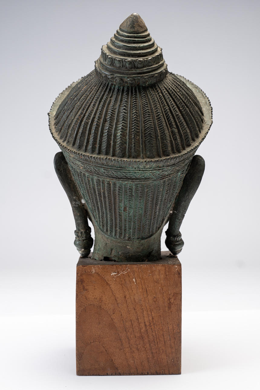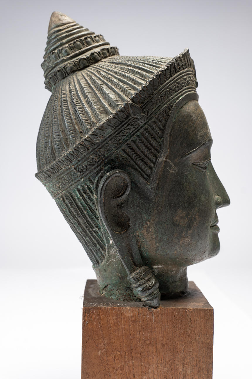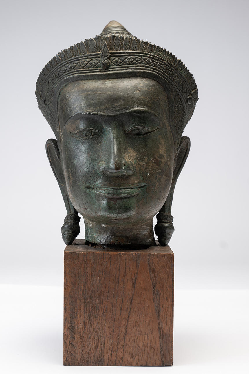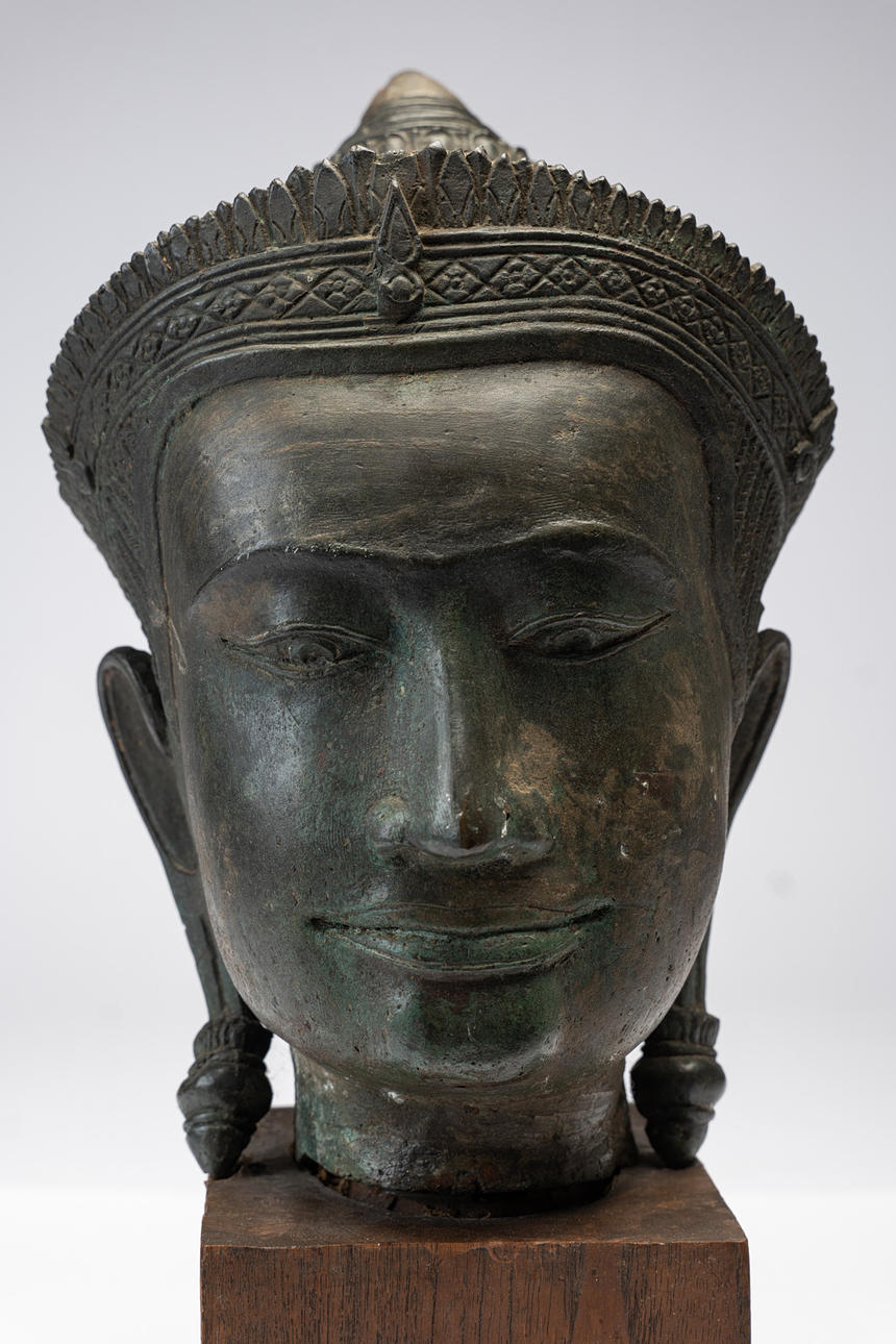 Büste, Messing, Holz, Asien. Asiatische Büste aus Messing mit Kopf- und Ohrenschmuck, auf Holzsockel montiert, H.42cm, B.22cm, T.21cm.