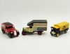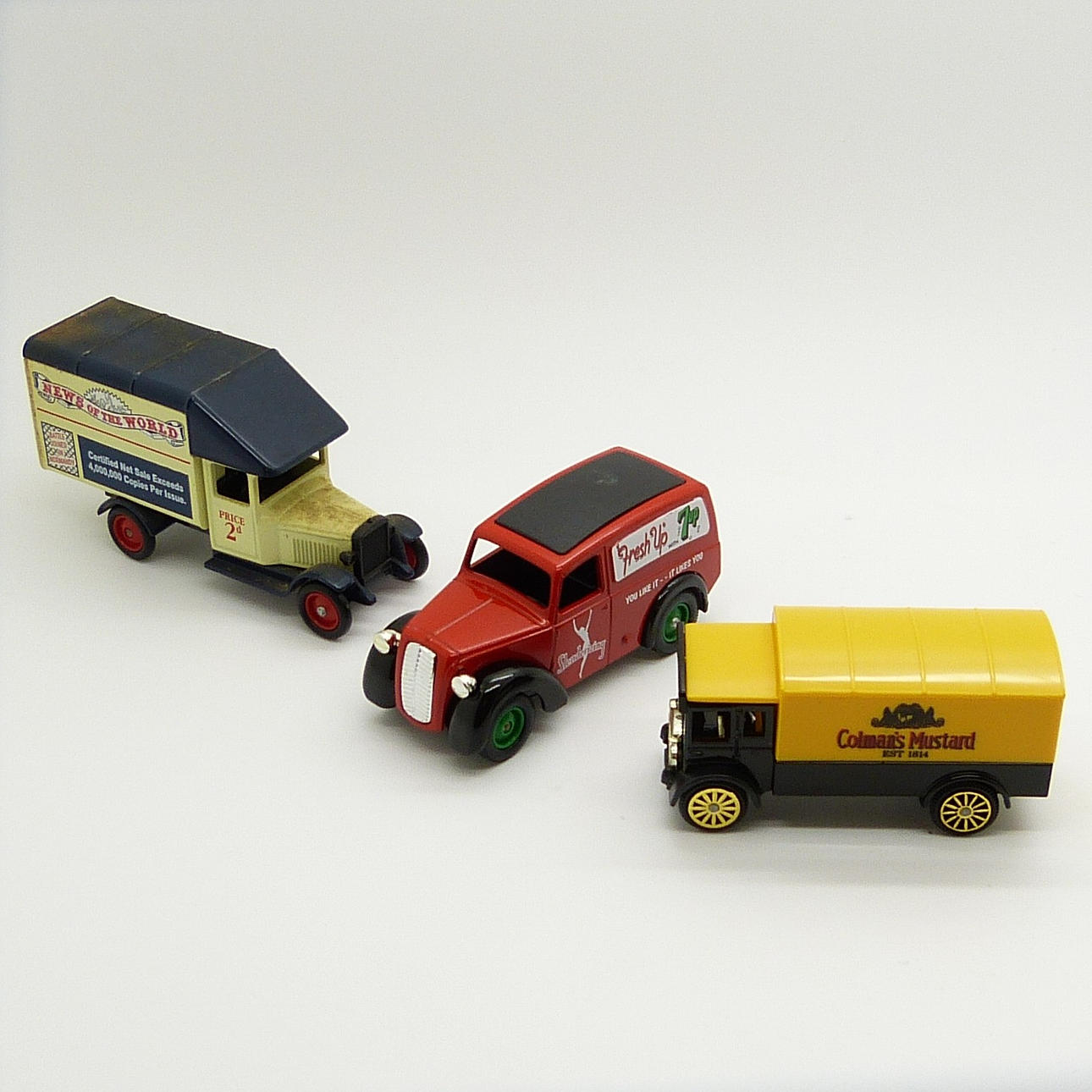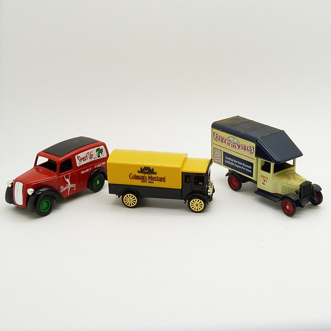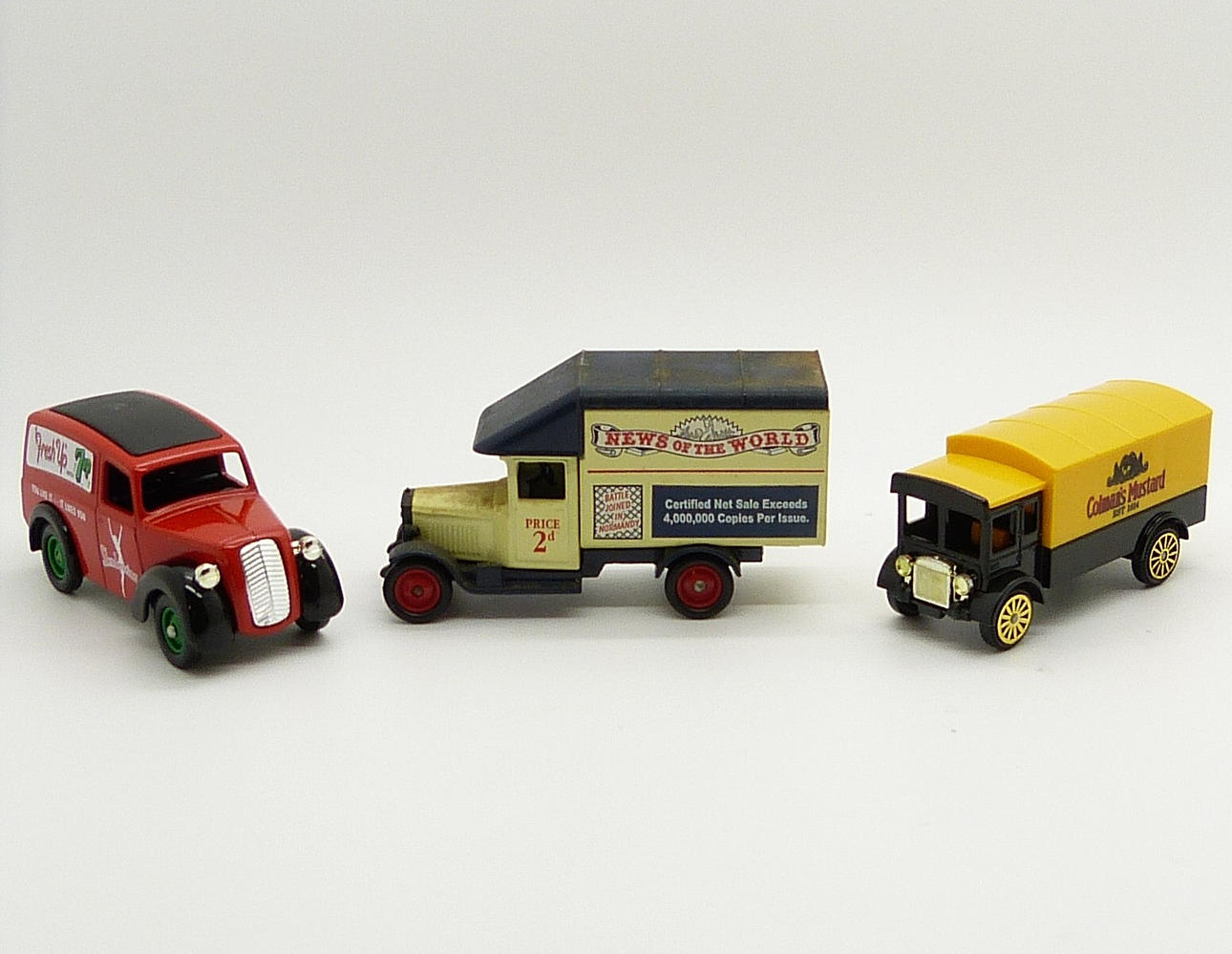 Diese Auswahl umfasst: • Ein Lieferwagen von ProMotors News Of The World aus Druckguss in den Farben Creme und Marineblau, hergestellt von Lledo Plc. 144,0g • Ein 7Up „Fresh Up“ Days Gone Druckguss Van Morris Z mit rotem Fahrgestell, schwarzem Dach, grünen Rädern und einem silberfarbenen Kühlergrill. 108,5 g • Ein „Vintage Collection“ Colman's Mustard Corgi AEC Van in den traditionellen Markenfarben Senf und Schwarz. 54,9 g Alle 3 Dinky Toys sind verpackt.