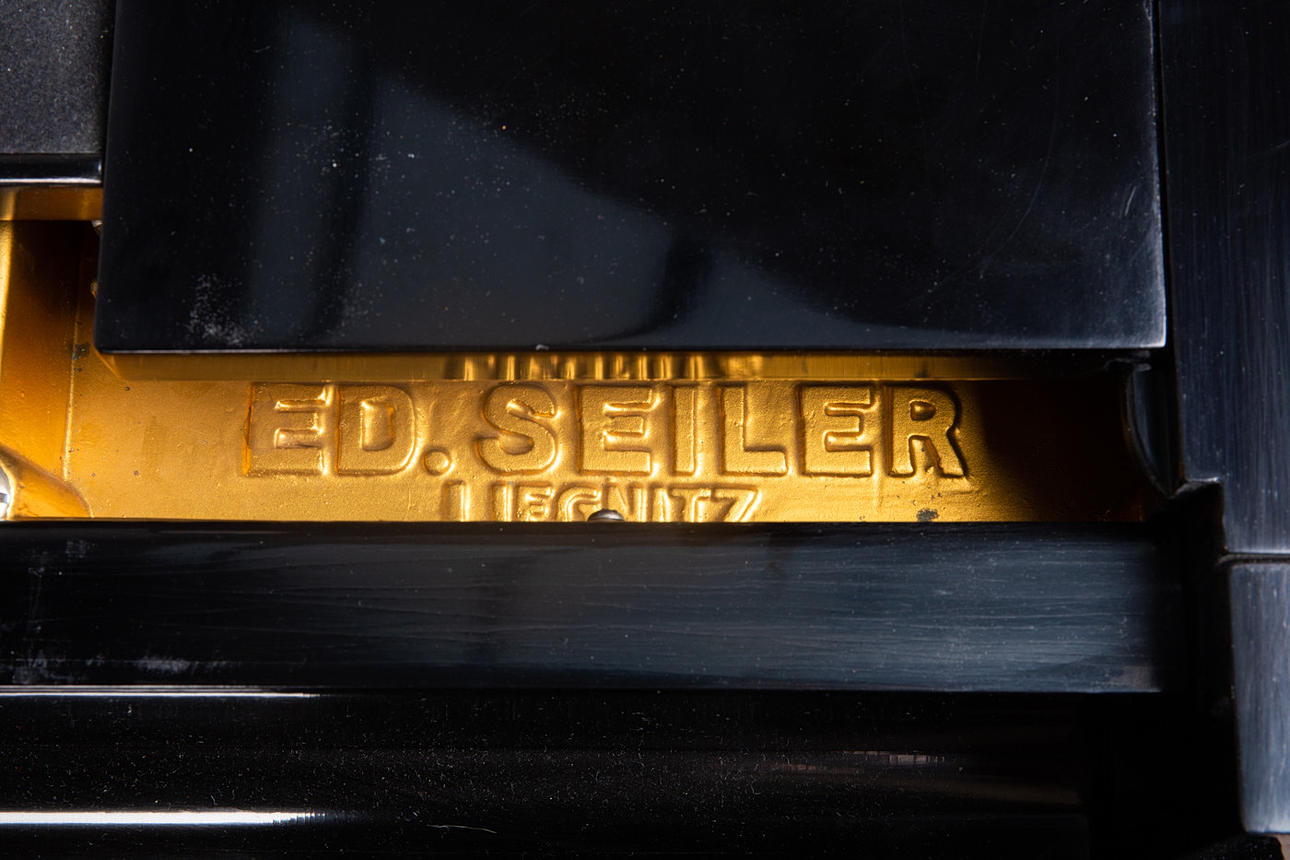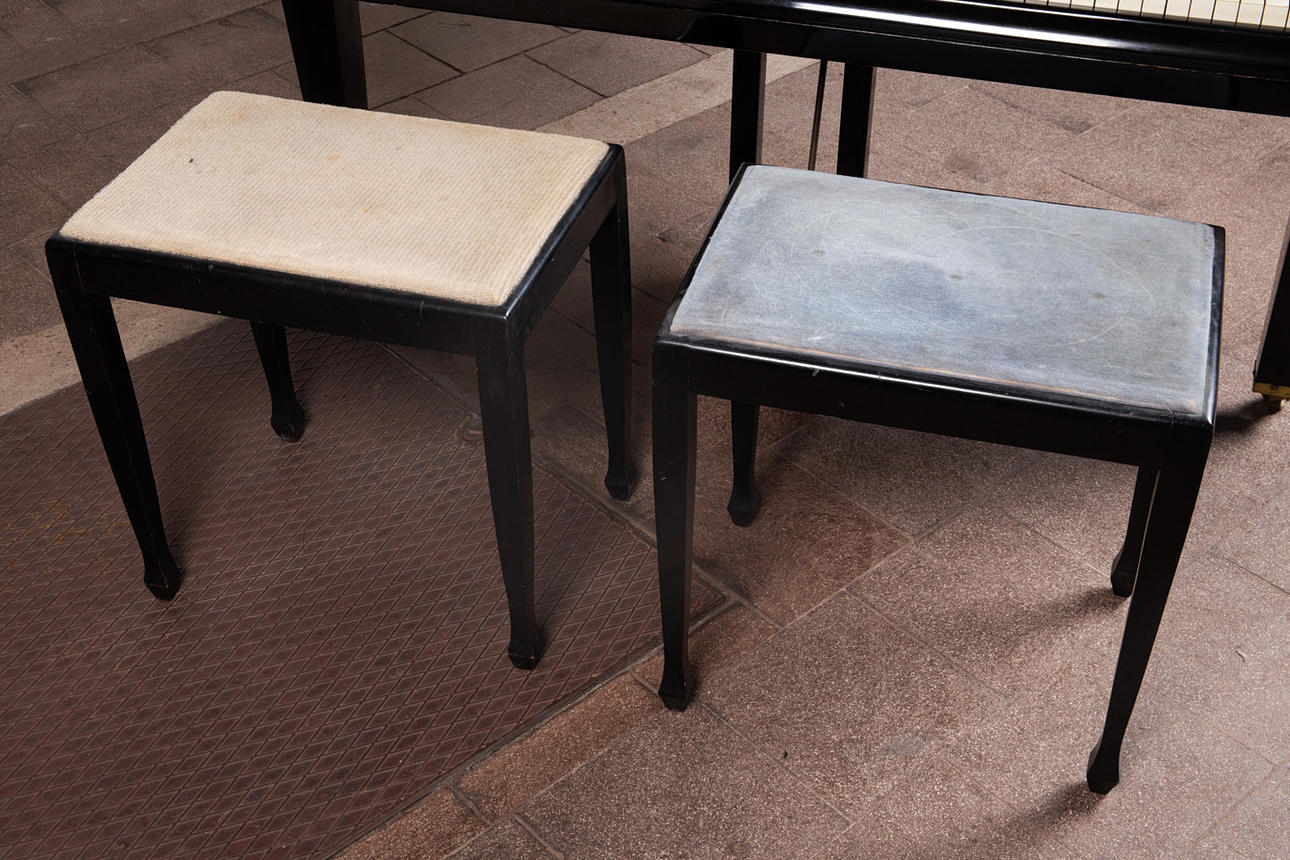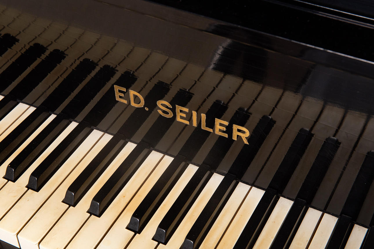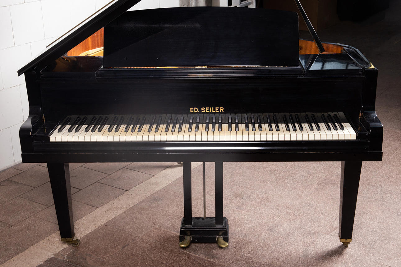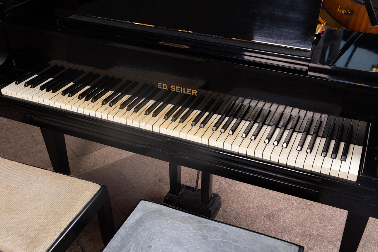 Eduard Seiler Liegnitz, Flügel / Klavier, Modell '130'. Flügel mit einem schwarz lackierten Holzkorpus und einer Tastatur aus Holz mit einem Belag aus gefärbtem Acrylglas, sowie mit zwei Pedalen ausgestattet, prämiert mit der Goldmedaille 'Tokio 1922', die Tastatur ist größtenteils nachgedunkelt, der Resonanzboden aus Kirschbaum zeigt keine sichtbaren Risse und wurde restauriert, der Stimmbock ist in einem guten Zustand, die Regulation der Mechanik müsste überarbeitet und der Flügel selbst wahlweise gestimmt werden, Höhe: 91-174cm, L.133cm, B.144,5cm, anbei zwei Hocker mit Velourbezug, je: H.50cm, L.51cm, B.36cm.