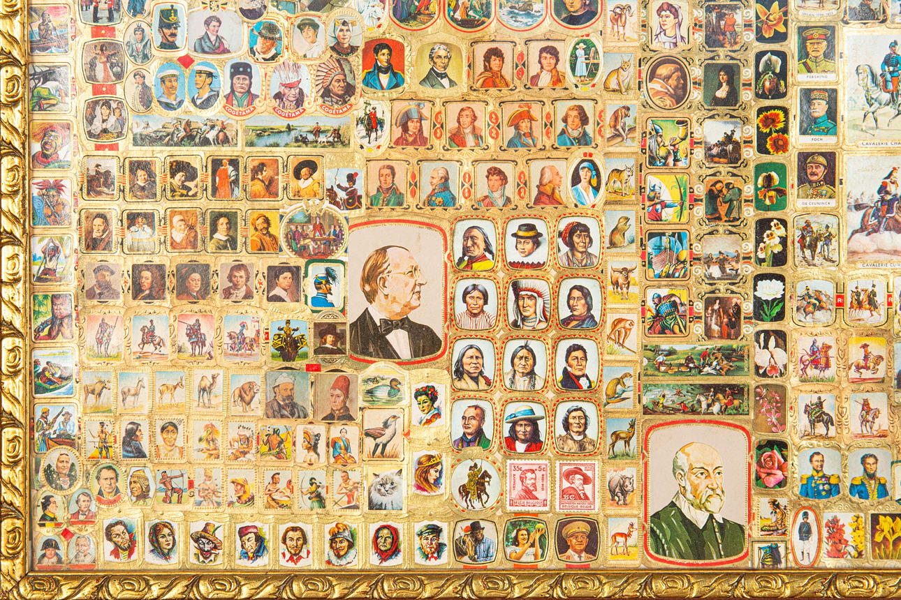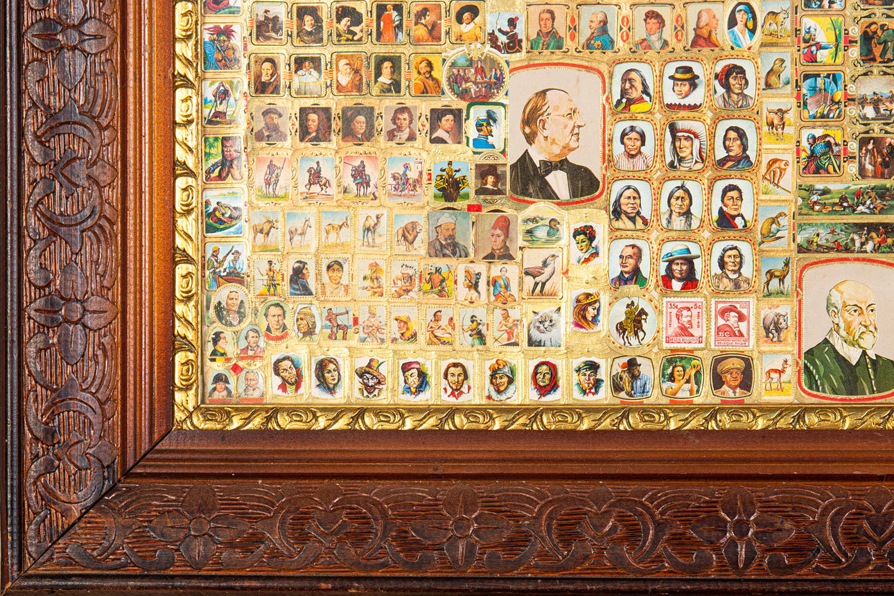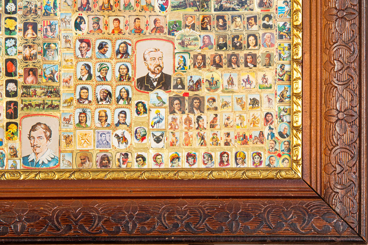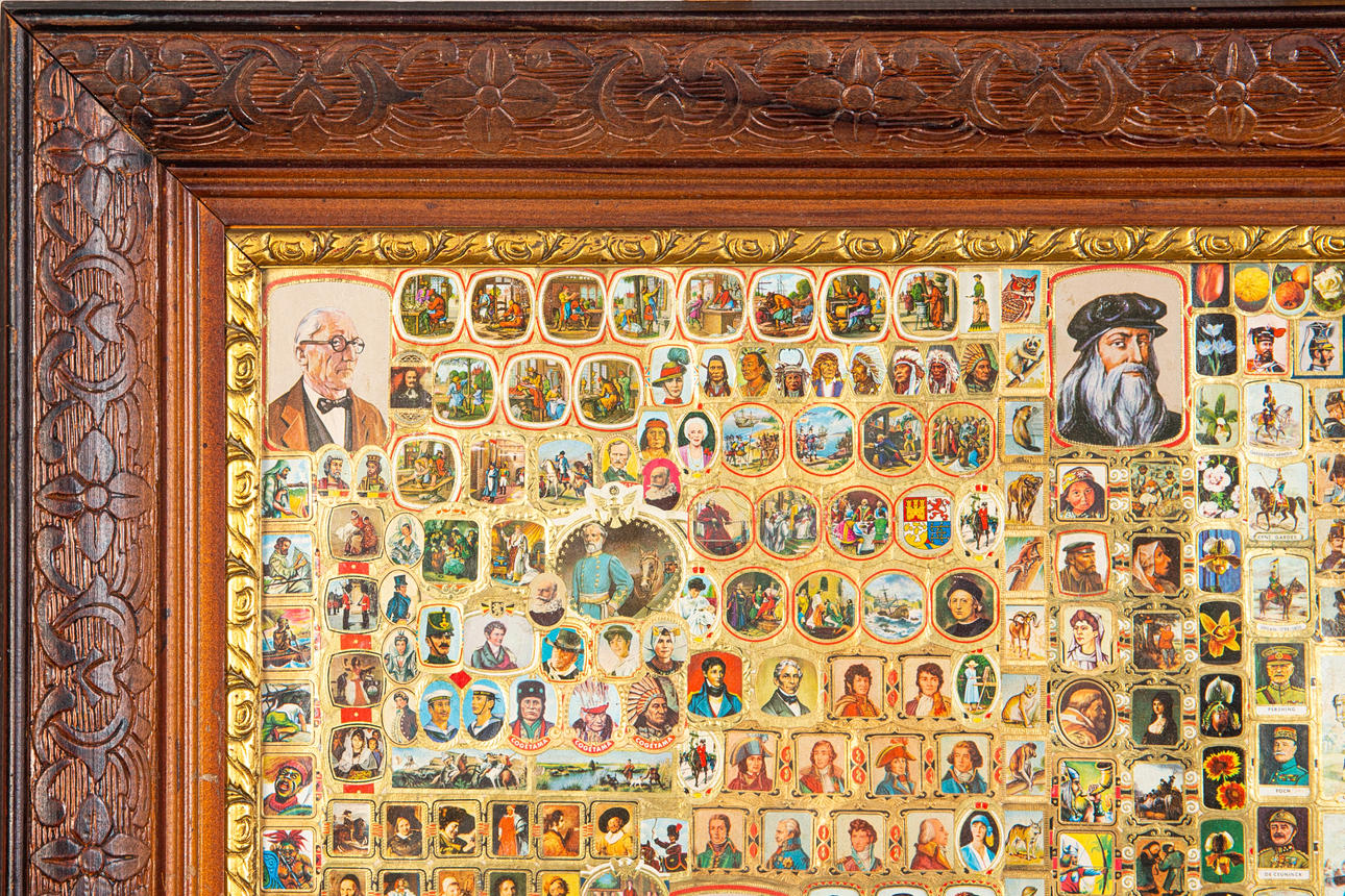 Zigarrenbanderolen-Sammlung, Papier, um 1900. Sammlung einer Vielzahl von Zigarrenbanderolen mit verschiedenen polychromen Motiven, darunter überwiegend Porträtdarstellungen historischer Persönlichkeiten, die Banderolen sind collagenartig auf einen gemeinsamen Untergrund geklebt, gerahmt und verglast, 35x73cm (50x91cm).