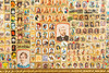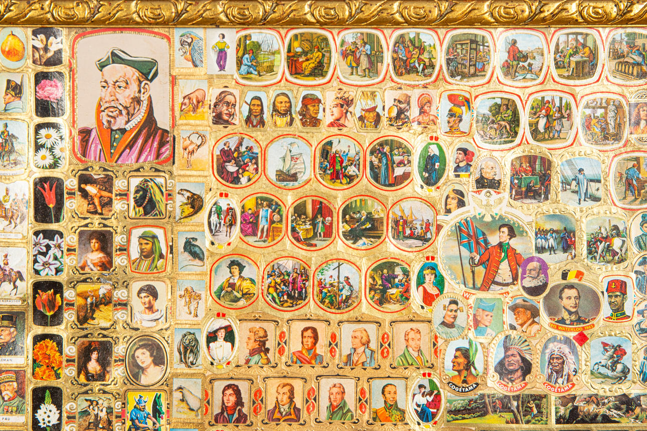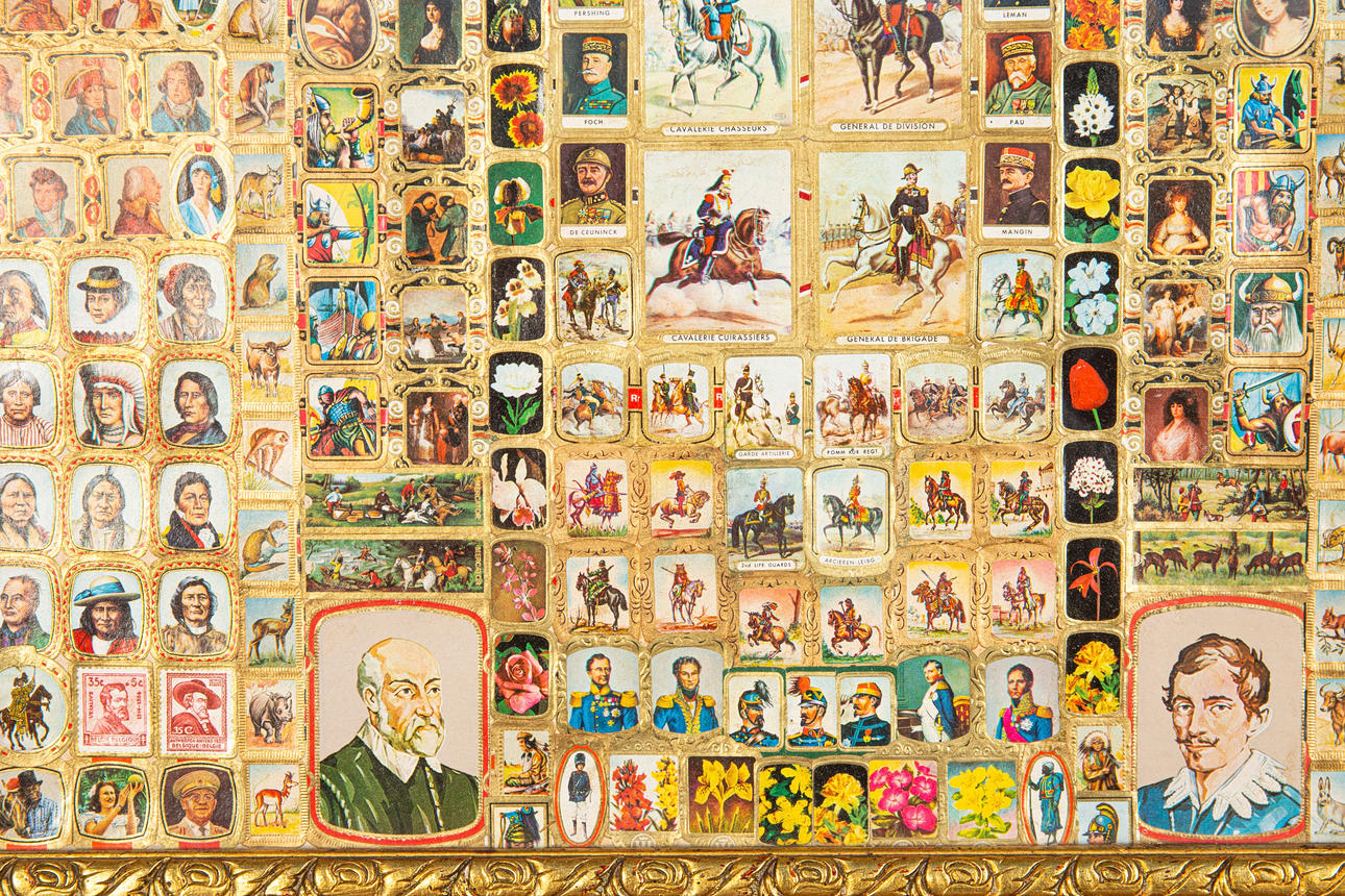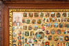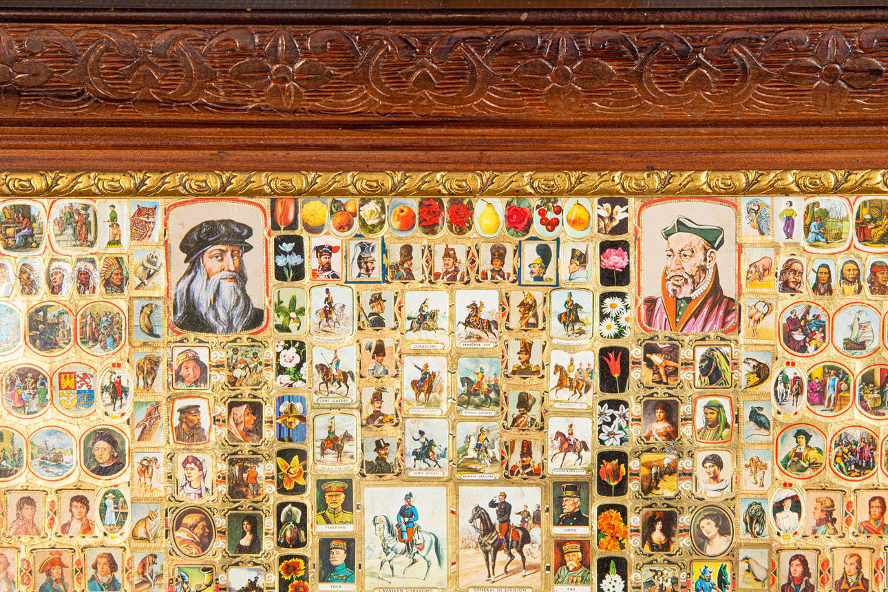 Zigarrenbanderolen-Sammlung, Papier, um 1900. Sammlung einer Vielzahl von Zigarrenbanderolen mit verschiedenen polychromen Motiven, darunter überwiegend Porträtdarstellungen historischer Persönlichkeiten, die Banderolen sind collagenartig auf einen gemeinsamen Untergrund geklebt, gerahmt und verglast, 35x73cm (50x91cm).