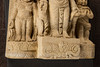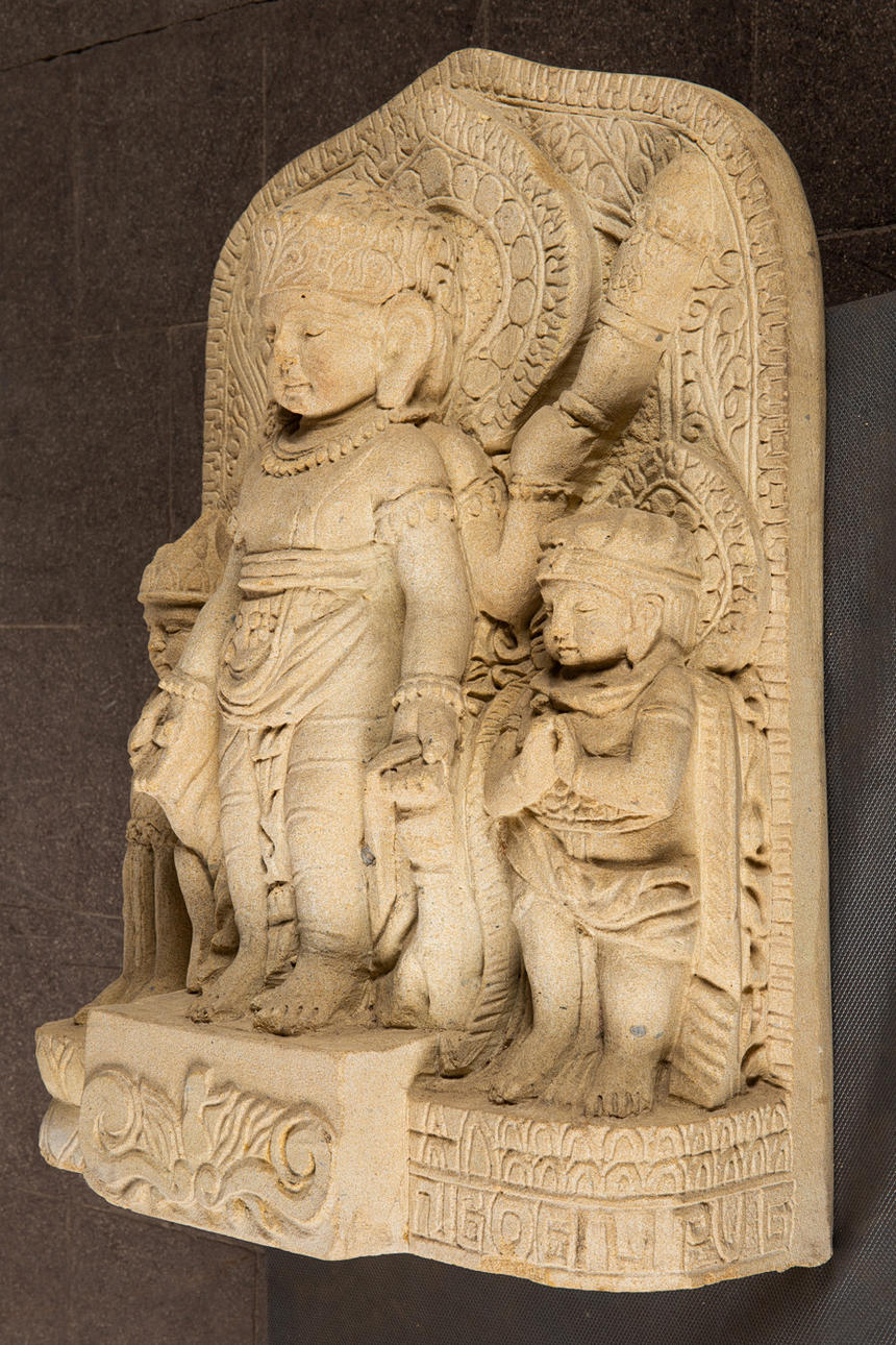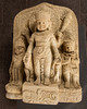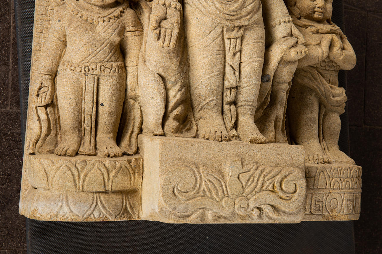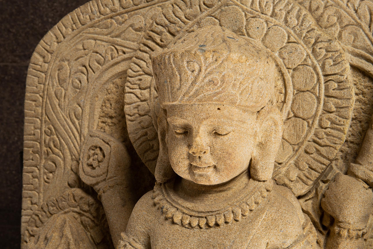 Skulptur, Trimurti / Trideva, Sandstein, Indien. Skulptur aus Sandsteingemisch mit der Darstellung des Gottes Brahma, flankiert von Vishnu und Shiva, H.74,5cm, B.51cm, T.26cm.