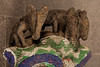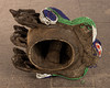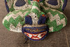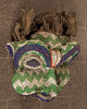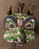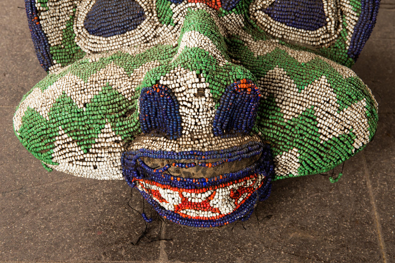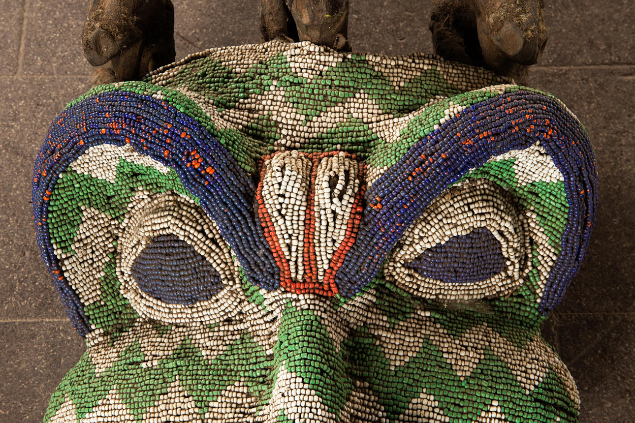 Maske, Holz, Perlen, Bamileke, Kamerun, Afrika. Perlenbestickte, hölzerne Maske in polychromer Farbgebung mit geometrischen Mustern, oberseitig mit drei aufgesetzten Tierfiguren versehen, H.54cm, B.48cm, T.31cm.