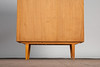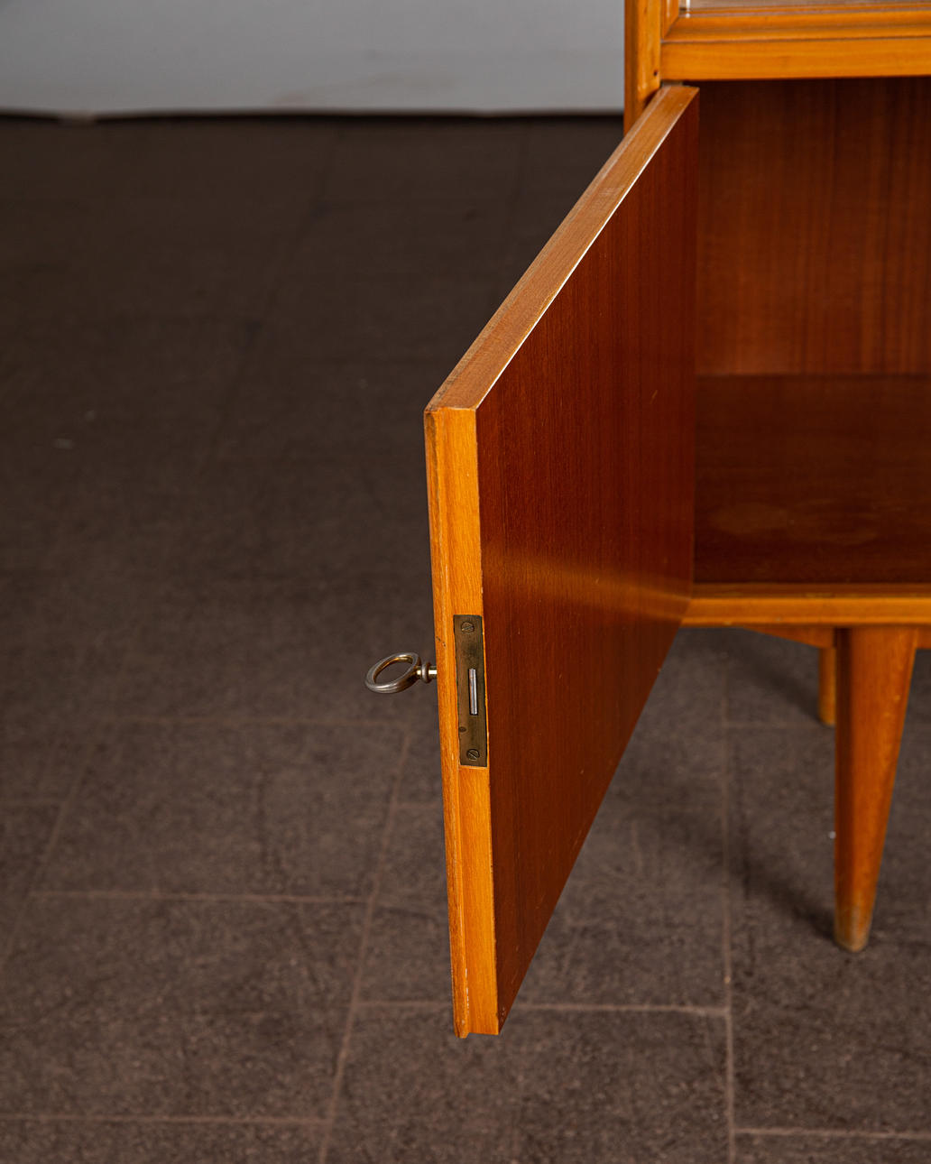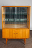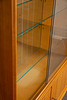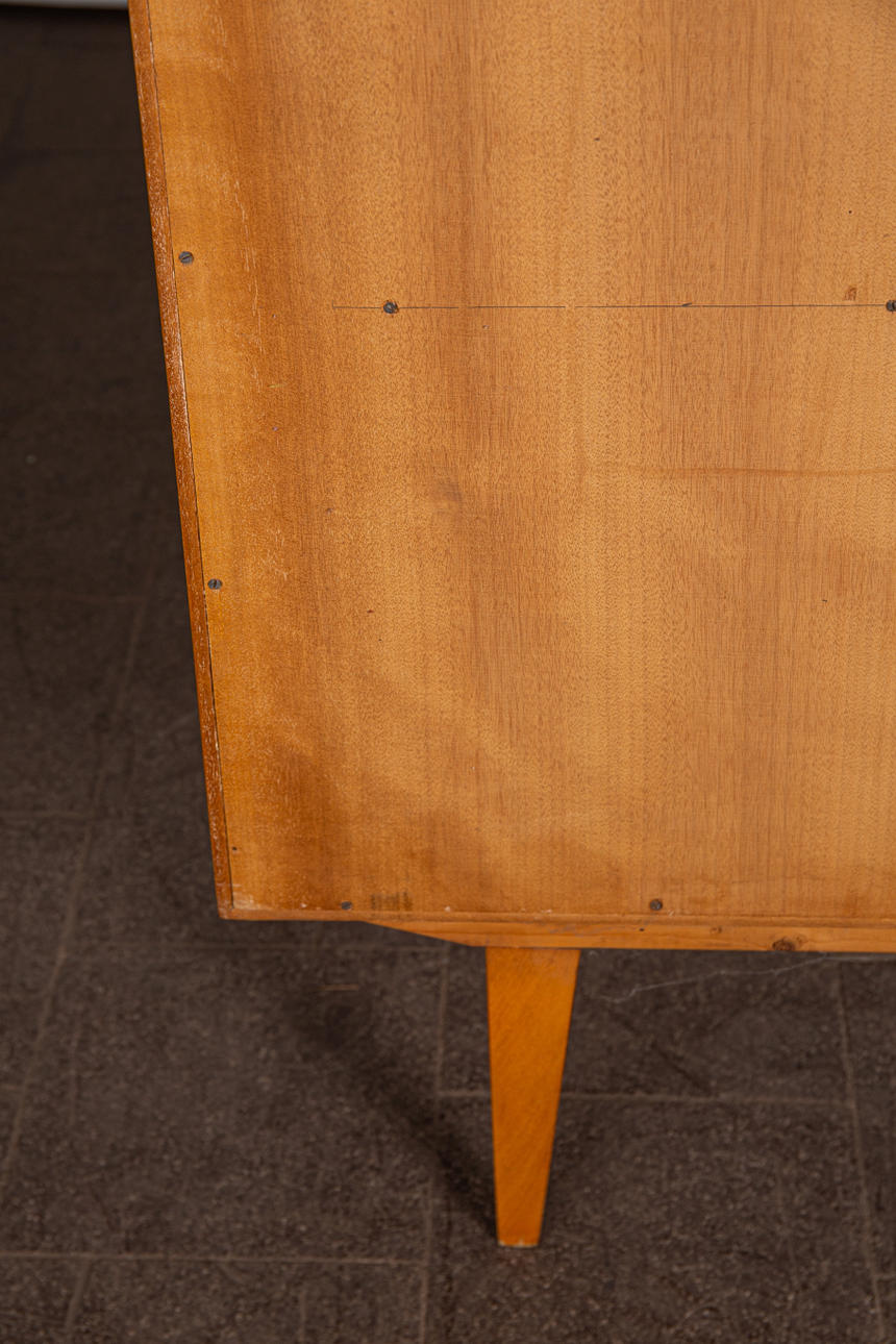 Vitrine / Vitrinenschrank, Kirschbaum, Glas, 1950er Jahre. Vitrinenschrank aus Kirschbaumholz mit vertikalen Holzintarsien, unten mit zwei verschließbaren Türen und oben mit zwei Schiebetüren aus Glas ausgestattet, innen mit zwei Einlegeböden aus Glas versehen, Rückwand verspiegelt, Schlüssel vorhanden, H.145cm, L.100cm, B.39cm.
