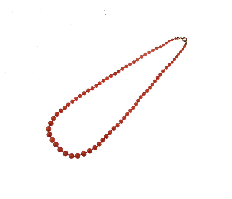 bestehend aus Armreif, Innenmaß ca. 5,5 x 4,7 cm, Korallenkette im Verlauf, Durchmesser ca. 3,8-6,8 mm, Länge ca. 48 cm, Ohrhänger mit 2 Korallenboutons ca. 7,7 mm.