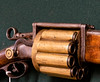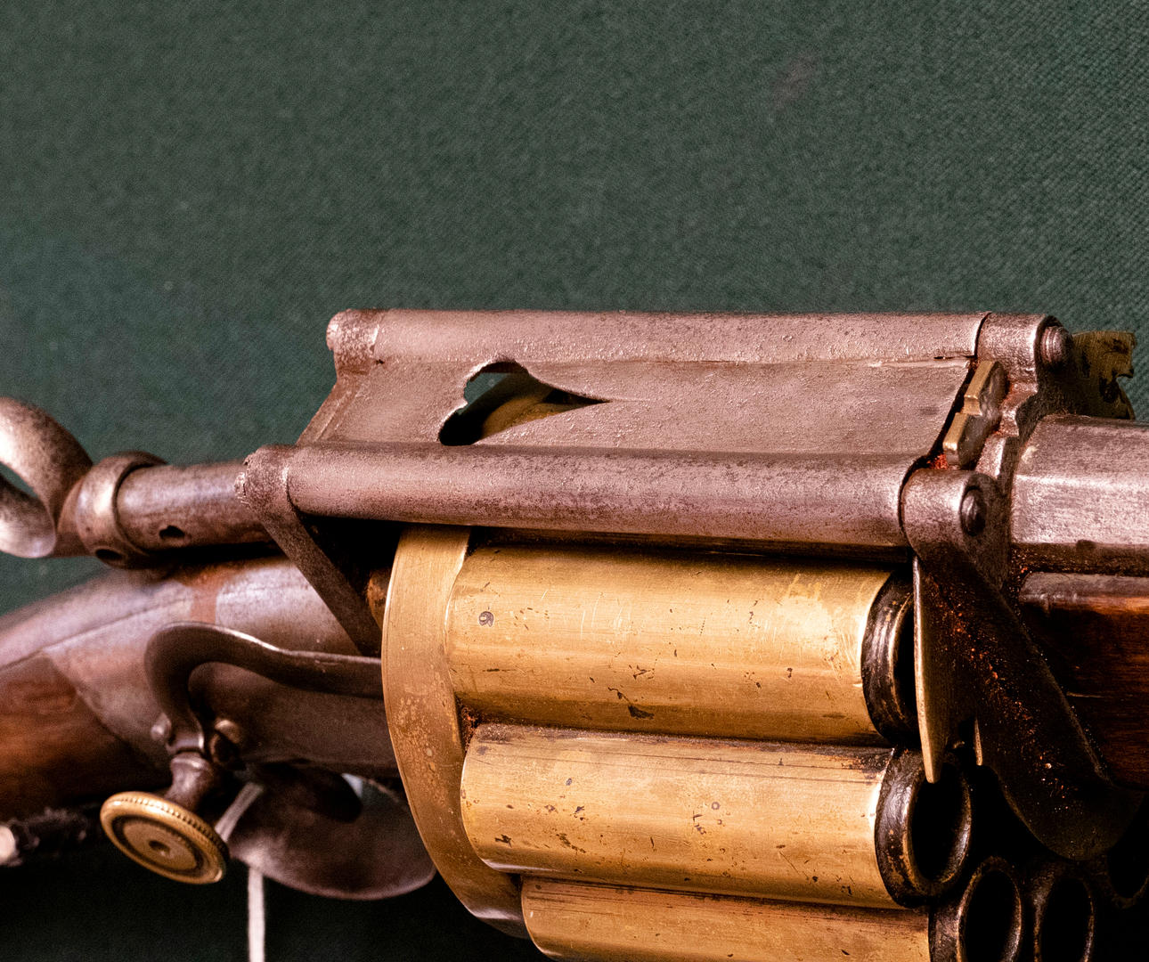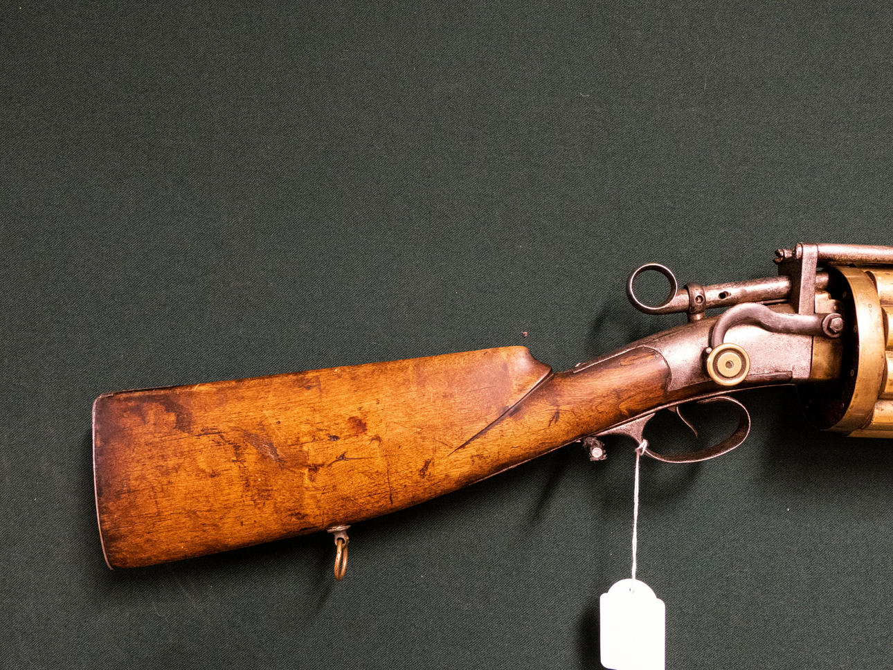 Gewehr Norwegisches Revolvergewehr. Machen Sie Rönning Caliber 15mm Impact Lock. Lauflänge 73cm. Rotierendes Bündel mit 10 Kartuschenpositionen aus Messing. Das Drehen erfolgt von Hand. Gasdichte Funktion. Handgekurbelter Schlagbolzen. Gerader Kolben mit Stahlkappe und schwacher Wangenauflage. Patronenlagerbündel gemarkt A. Rönning 1856.