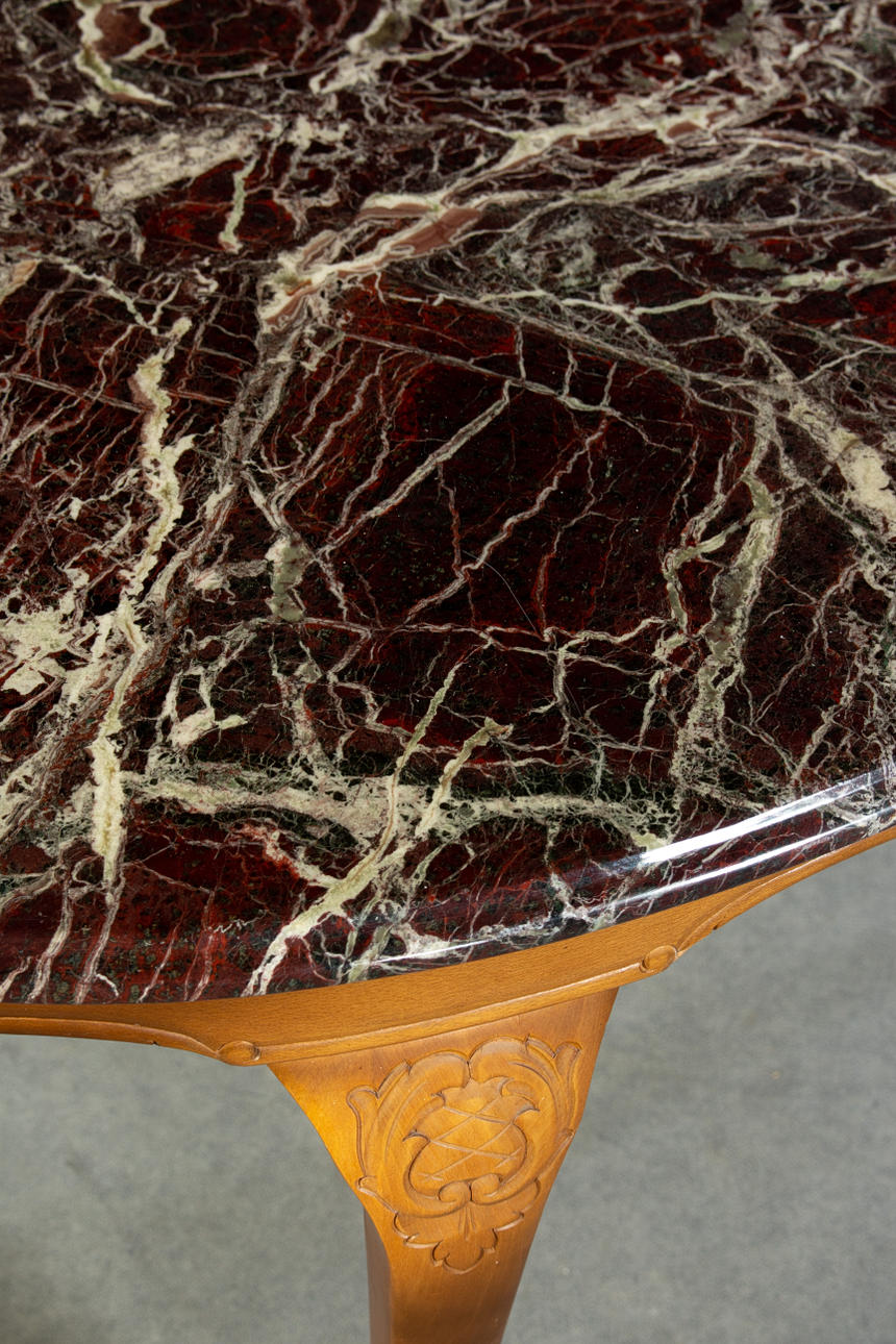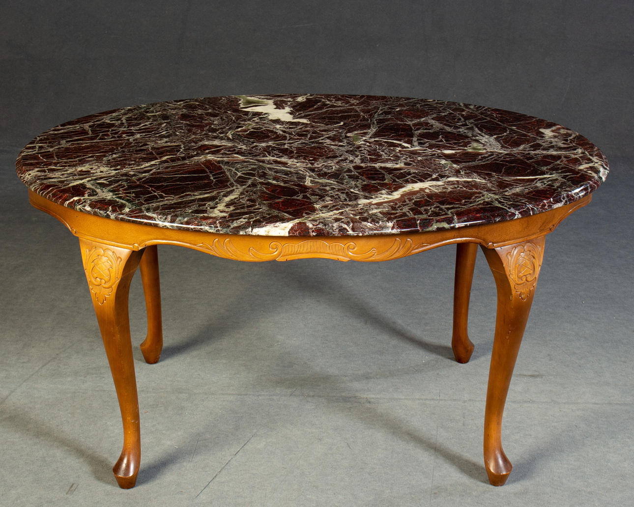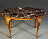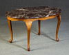 Tisch in Rokoko Manier mit Onyx-/Japsis-Platte. Ovale, geschweifte Zarge mit passigen vegetabilen Schnittdekoren und Rocaillen auf den Knien der geschwungenen Beine. Die ovale Platte am Plattenrand gekehlt. HxBxT: 61 x 116 x 80 cm.