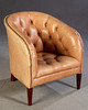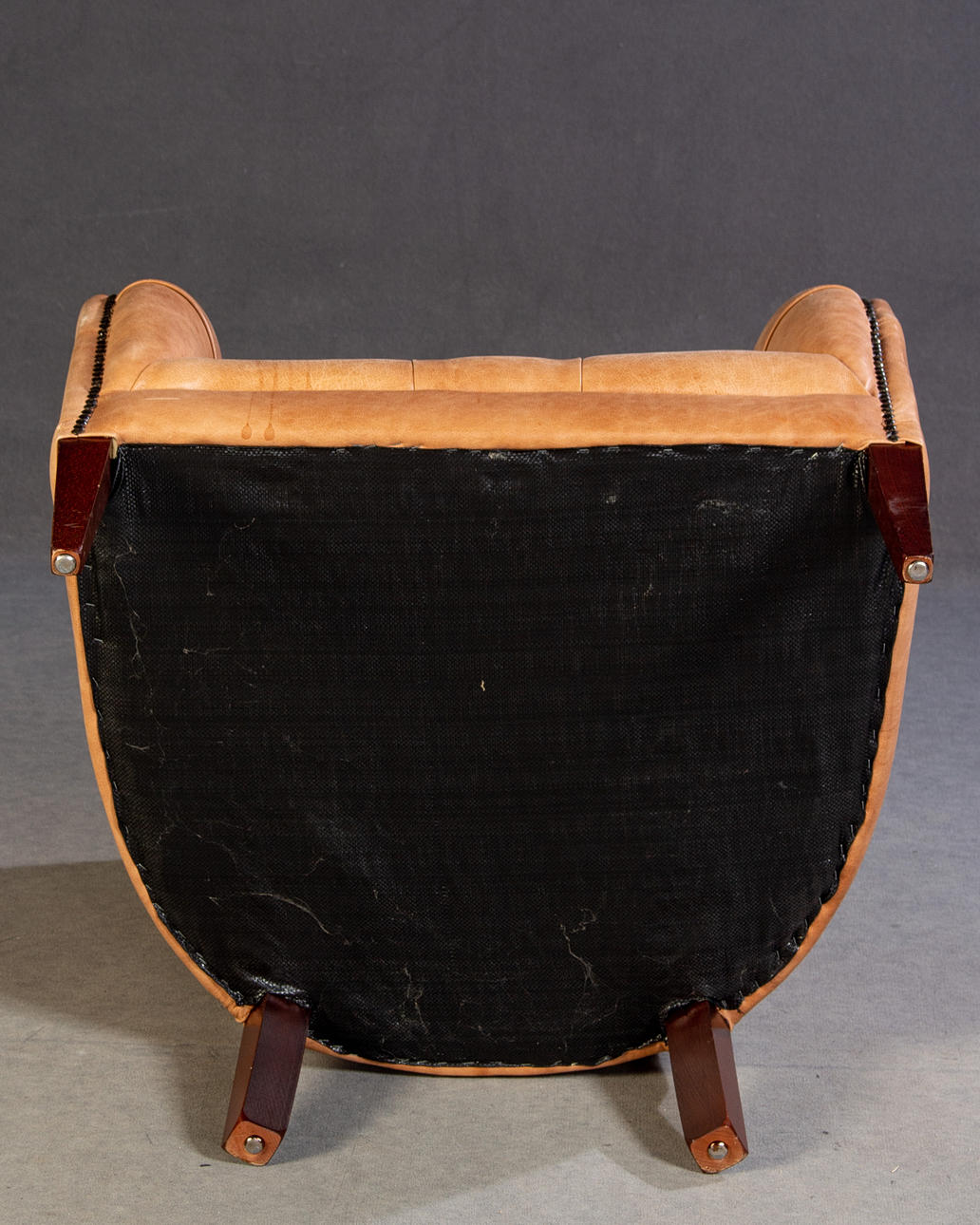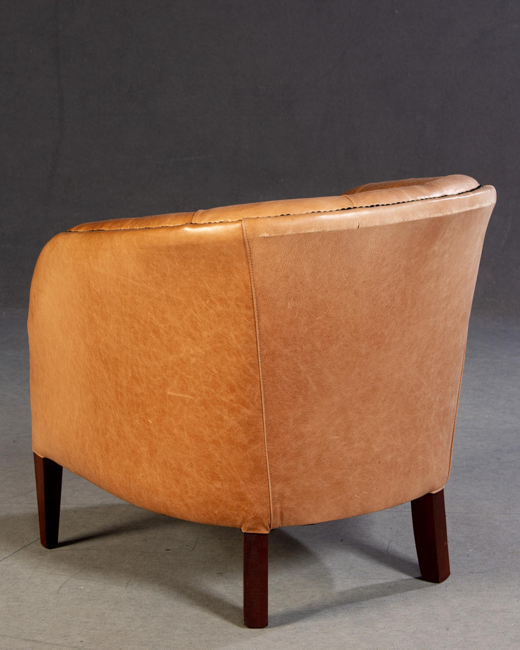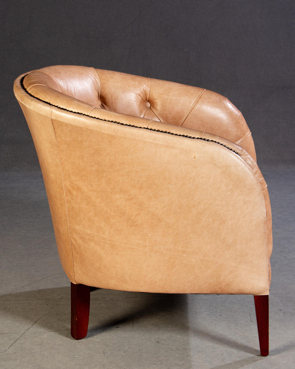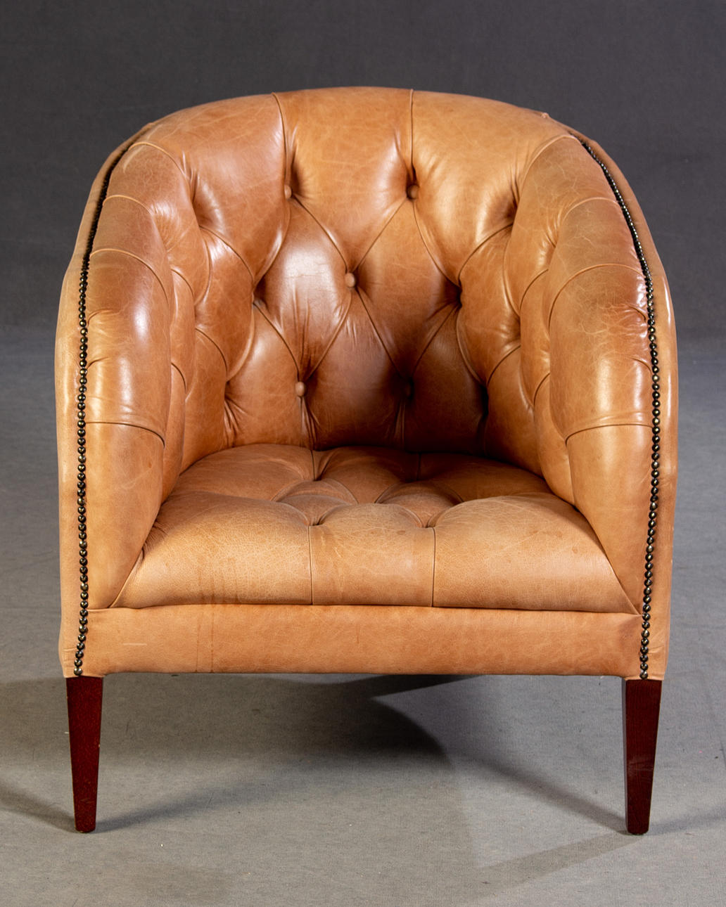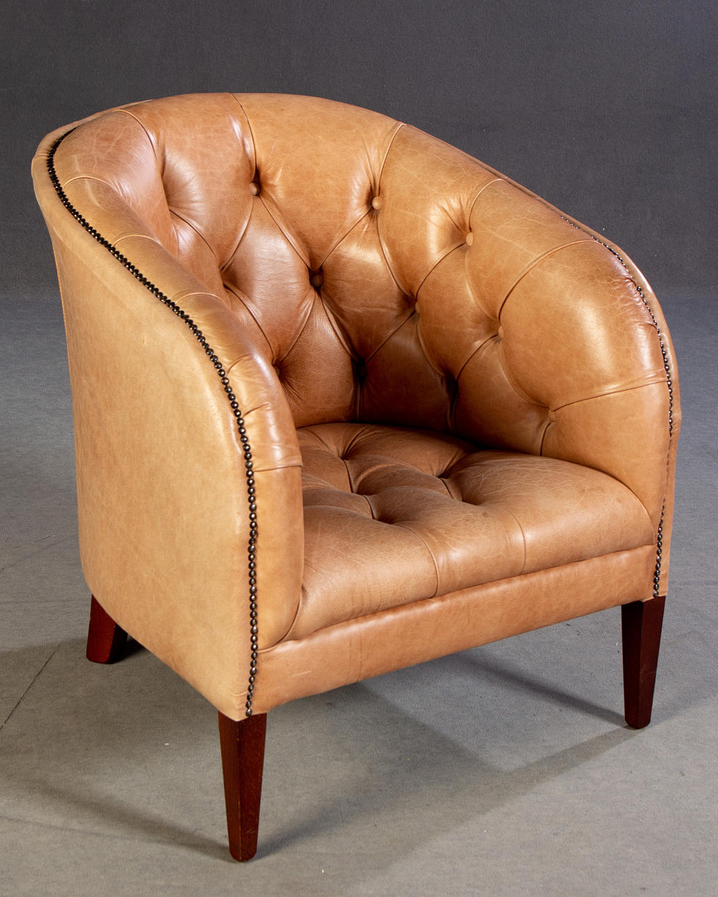 Chesterfield-Sessel, Leder (antikisiert)/Holz, 2000er Jahre. Sichelförmiger, durchgepolsterter Holzrahmen auf konischen Vierkantbeinen, mahagonifarben gebeizt. Sitz und Rückenlehne kapitoniert. Messingnieten, tlw. geschwärzt, umlaufend auf der Lehnenkante. HxShxBxT: 78 x 38 x 70 x 70 cm.