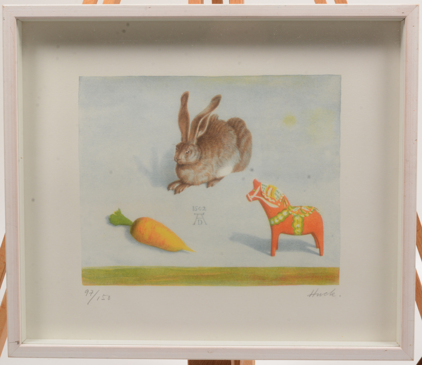 1715820. LARS HULTGREN. Hase, Karotte und Dalapferd. Lithographie.