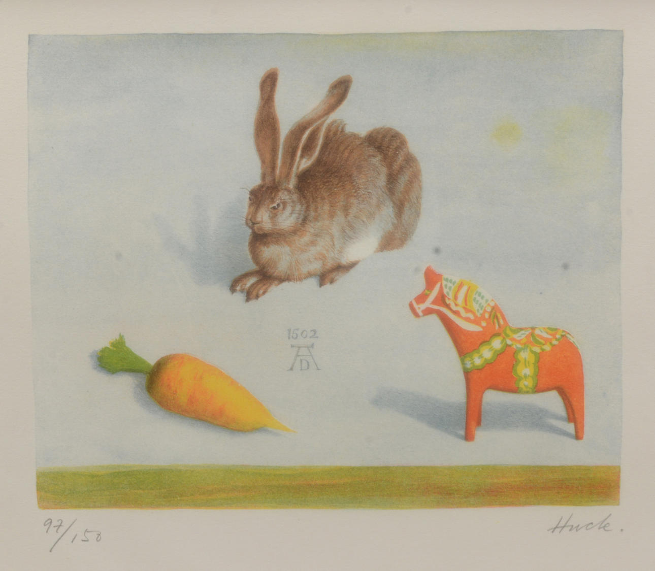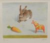 1715820. LARS HULTGREN. Hase, Karotte und Dalapferd. Lithographie.