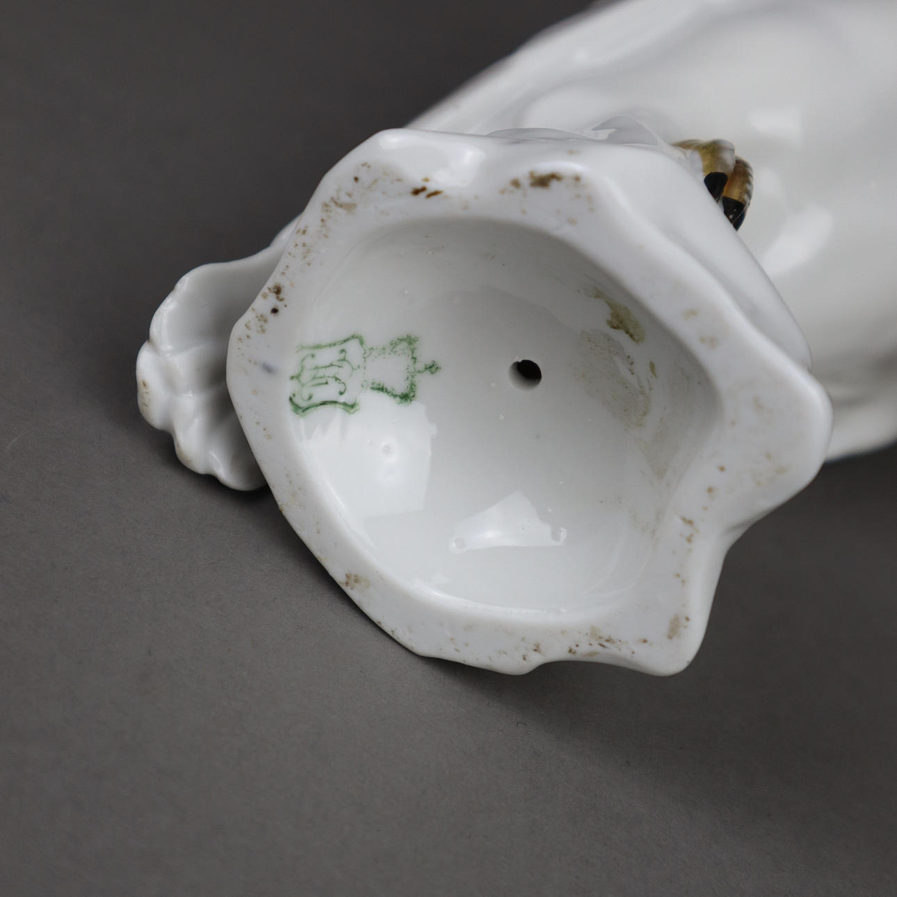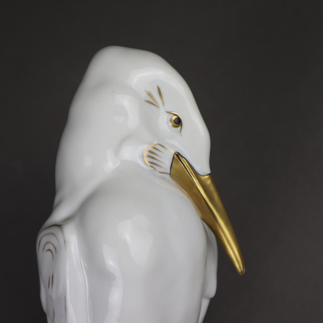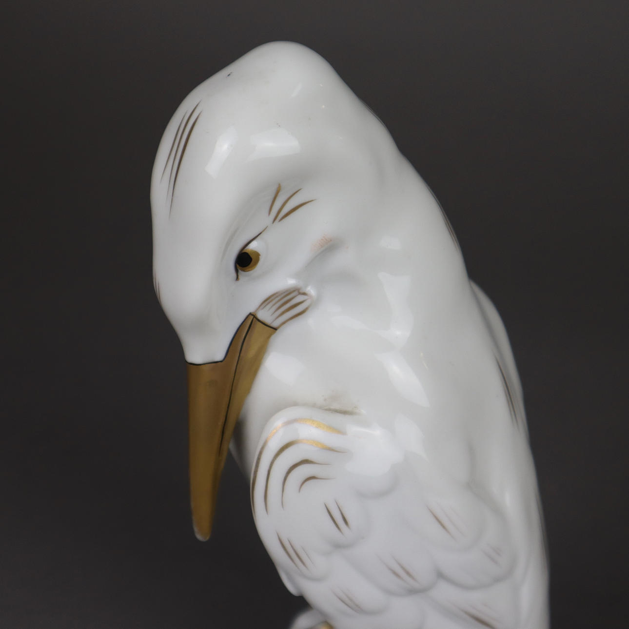 Weißporzellan, glasiert, partiell gold und schwarz staffiert, auf einem naturalistischem Felsensockel, im Boden grüne Manufakturmarke, H.ca.20cm.