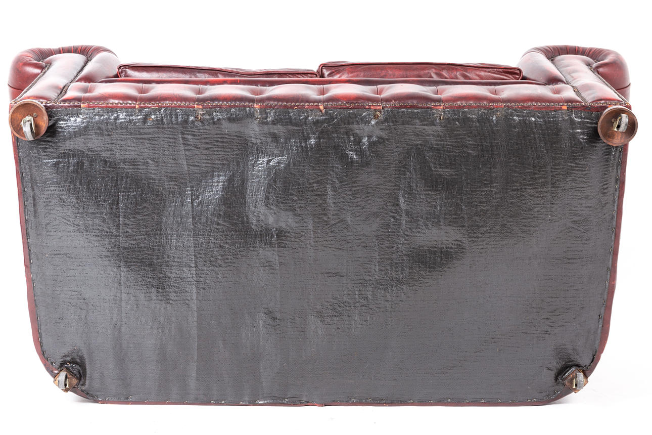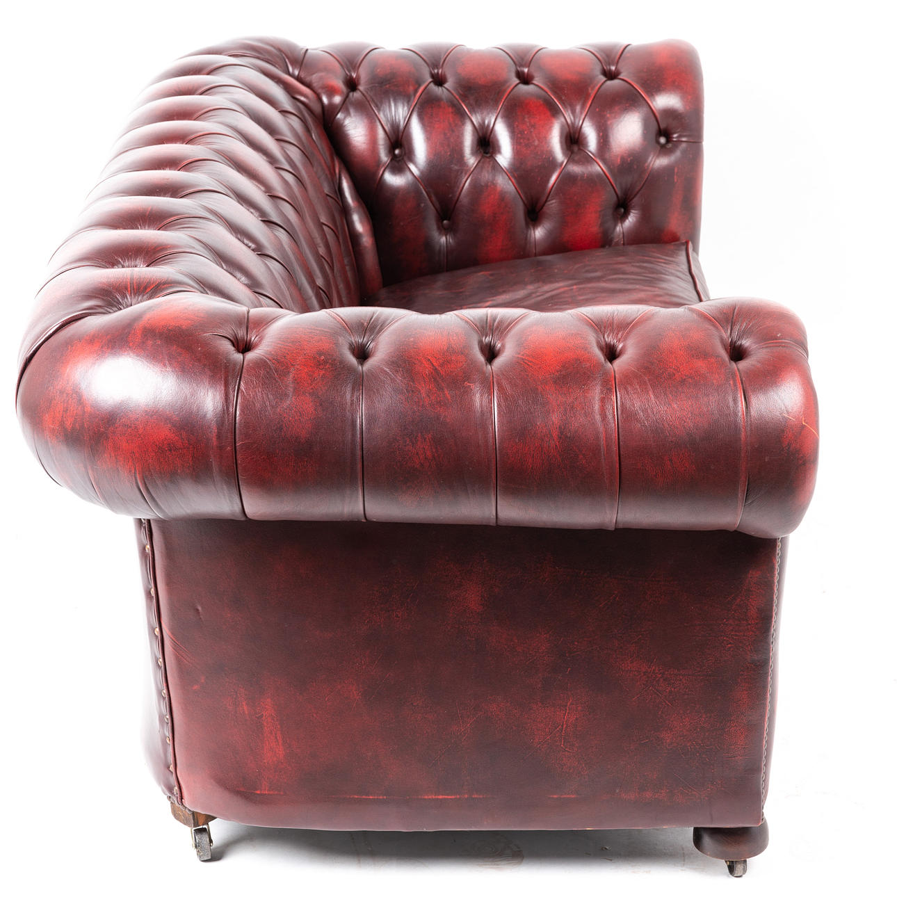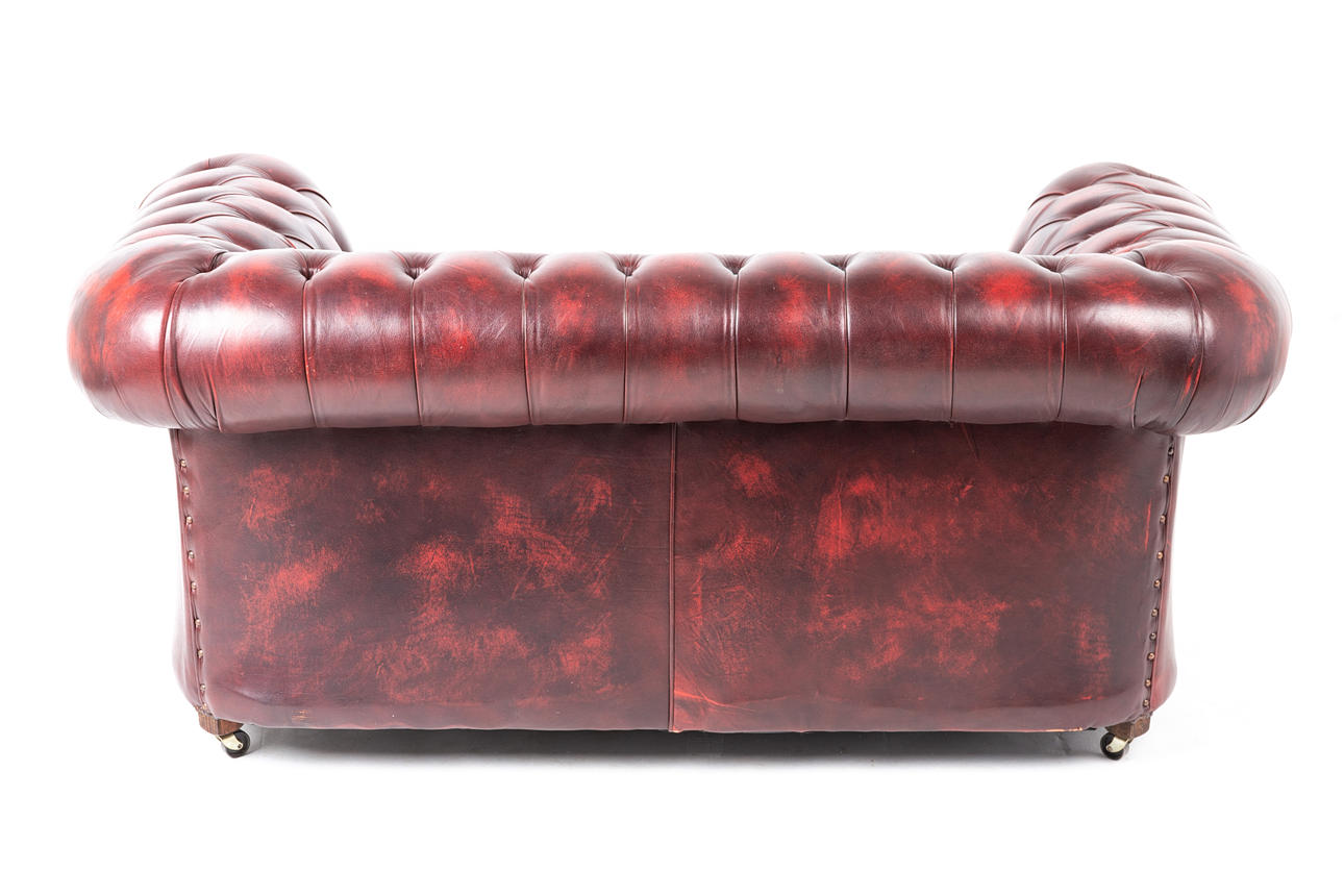 Chesterfield-Sofa / Couch, England, Leder. Zweisitzer-Sofa mit einem gesteppten Gestell mit Armlehnen aus rot gefärbtem Leder mit Knopfheftung und Rollen, mit zwei lose aufliegenden Sitzpolstern versehen, H.70cm, Sitzhöhe: 43cm, L.165cm, B.85cm.