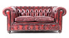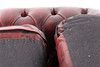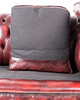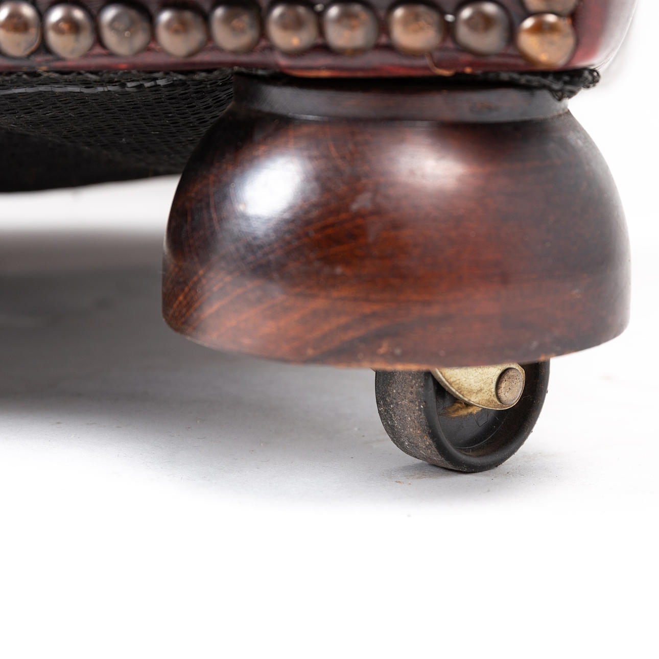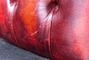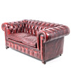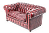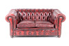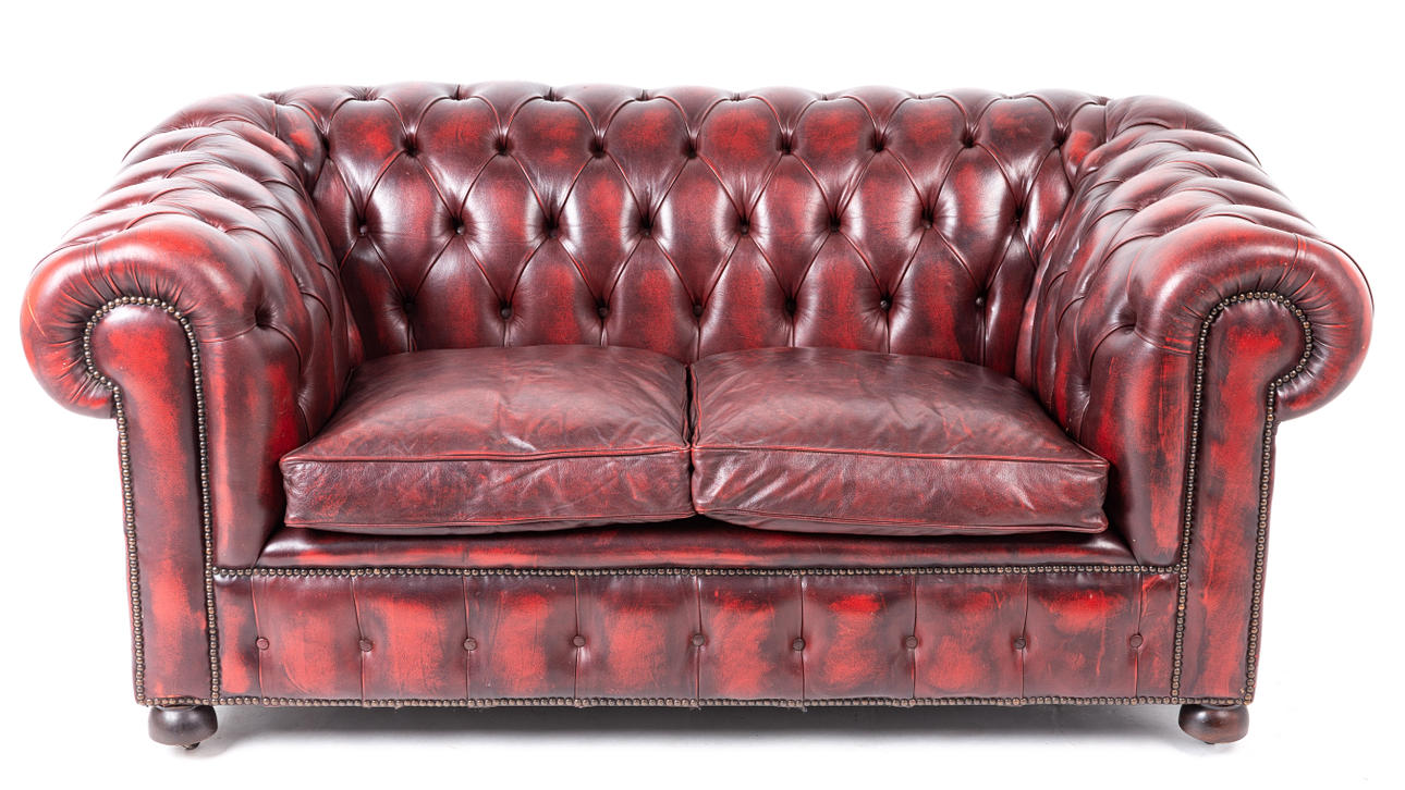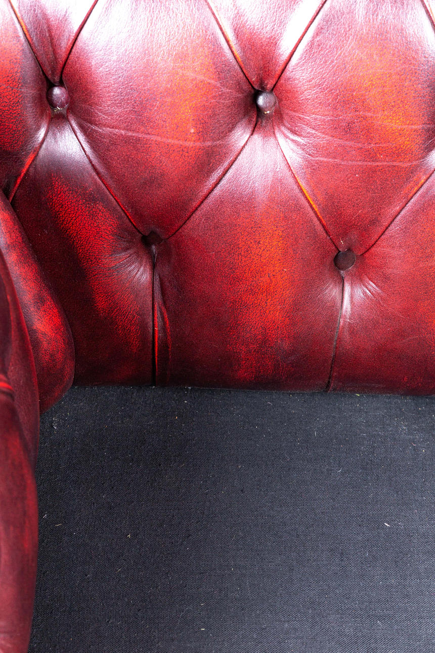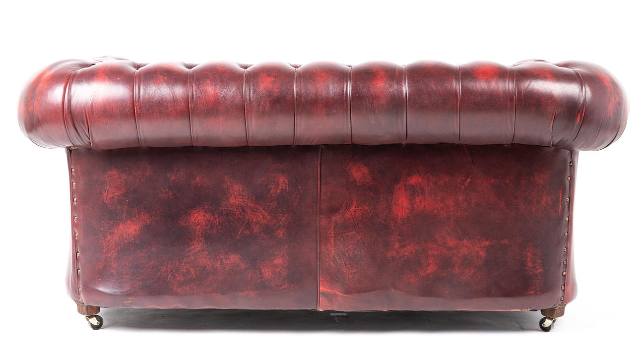 Chesterfield-Sofa / Couch, England, Leder. Zweisitzer-Sofa mit einem gesteppten Gestell mit Armlehnen aus rot gefärbtem Leder mit Knopfheftung und Rollen, mit zwei lose aufliegenden Sitzpolstern versehen, H.70cm, Sitzhöhe: 43cm, L.165cm, B.85cm.