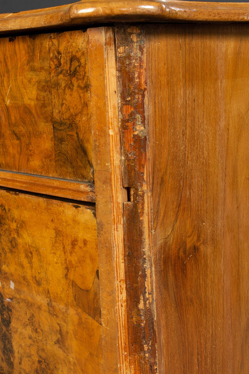 Wurzelfurnier auf Weichholz. Drei Schubladen in verschiedenen Größen. Geschweifte Deckplatte. HxBxT: 81 x 94 x 53 cm.