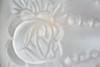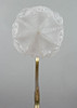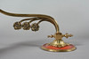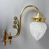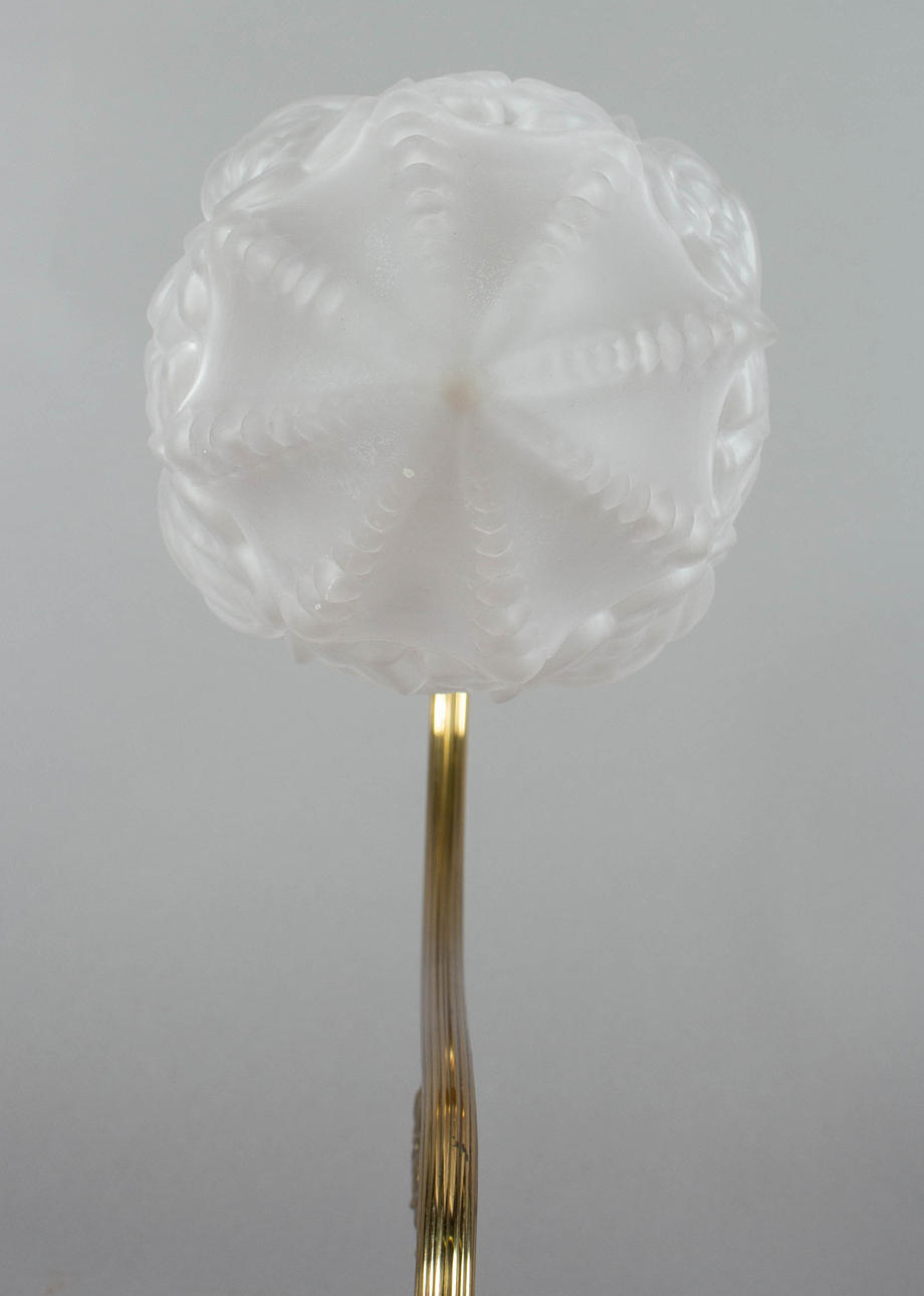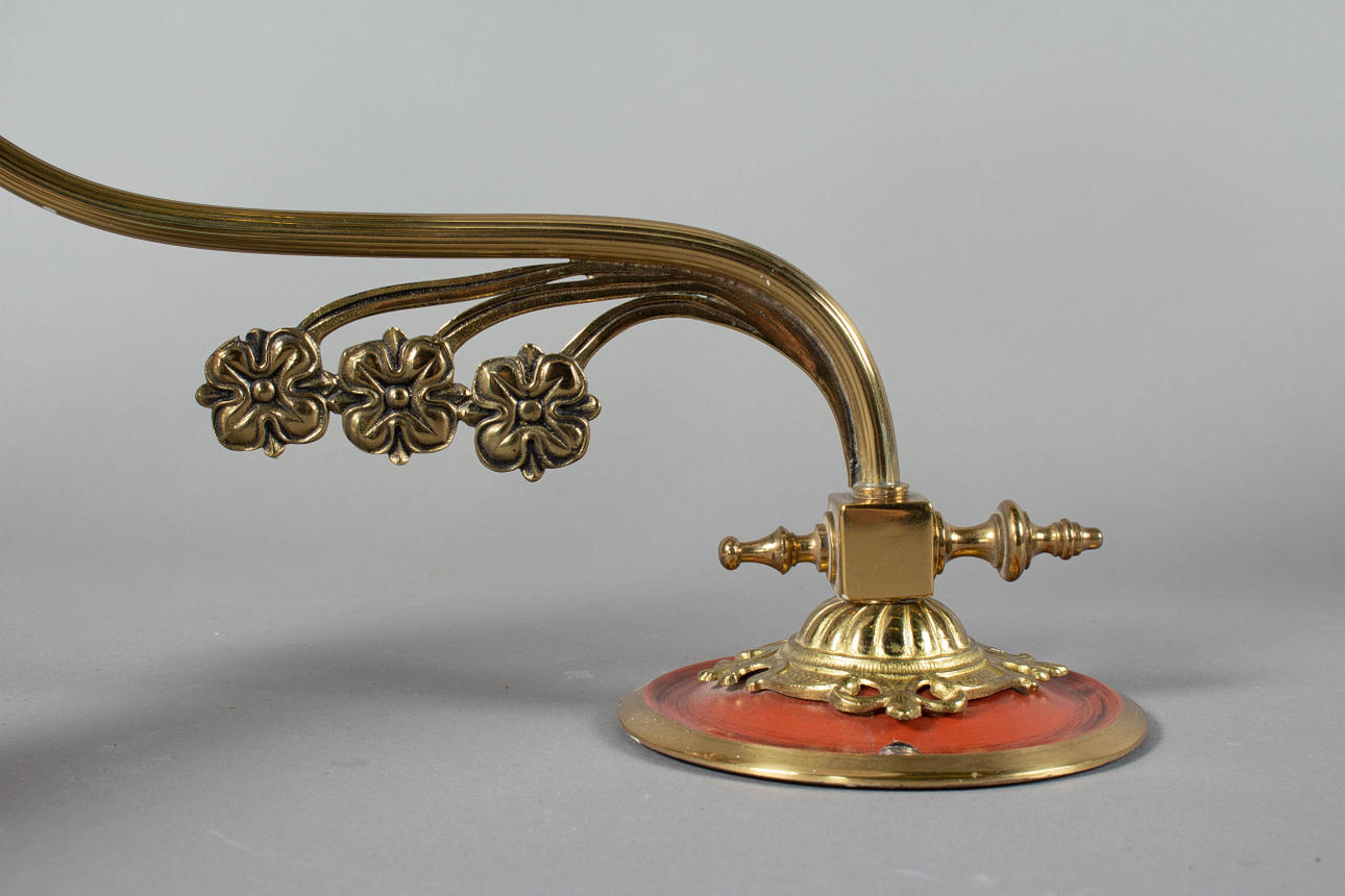 Gerillter, gebogener Leuchterarm, davon abgehend drei stilisierte Blumen. Auf Rundschild, eisenrot abgesetzt, mit schlagwerkartigem, godronierten Aufsatz montiert Konischer, ornamentierter Glasschirm, matt geätzt. HxBxT: ca. 30 x 12 x 29 cm.