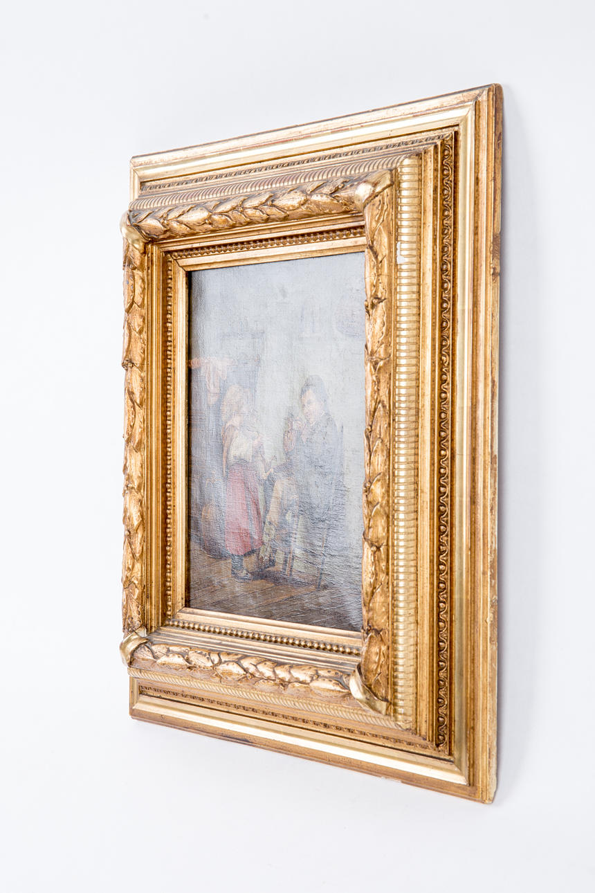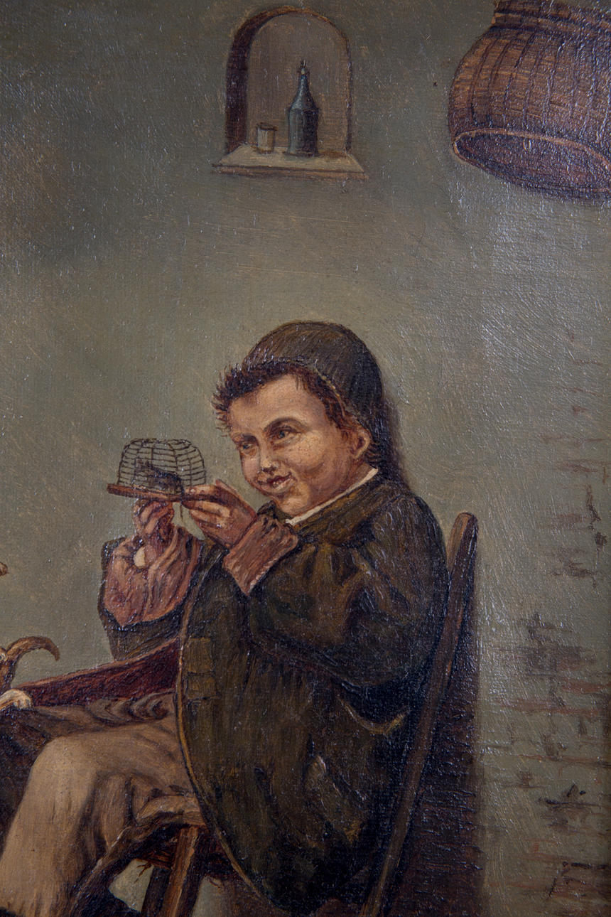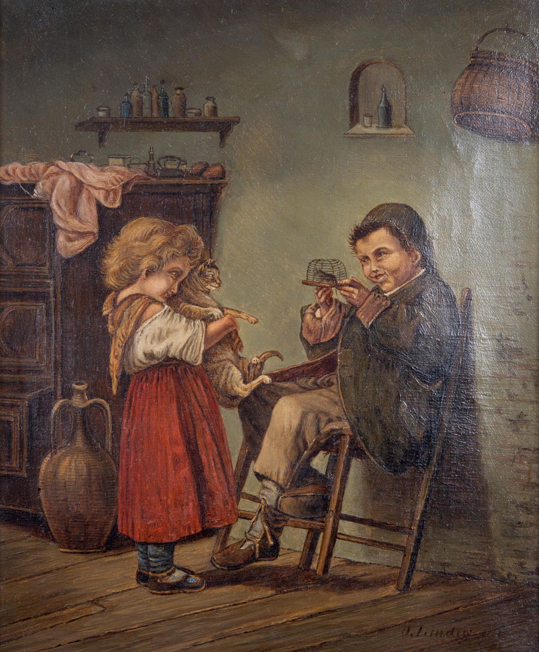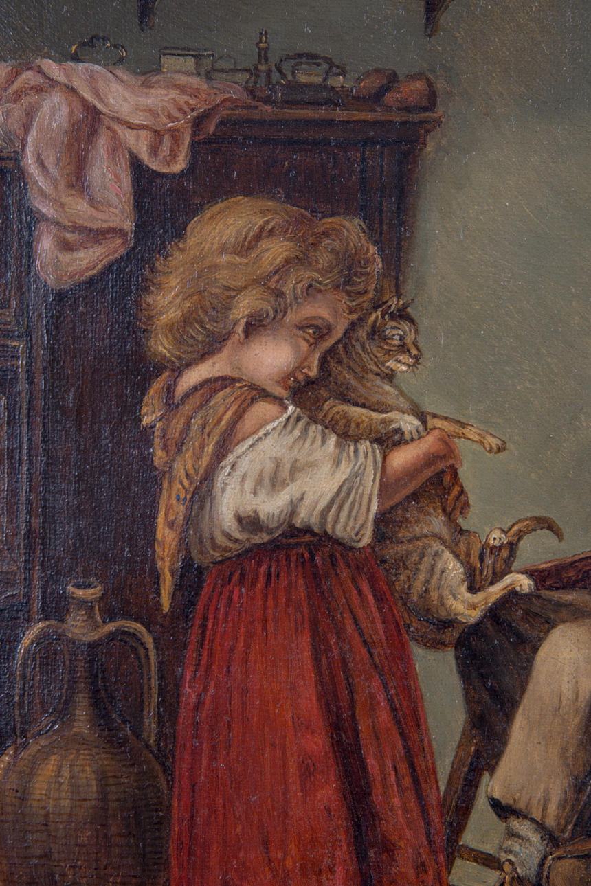 Unbekannter Künstler, Gemälde, Genreszene, Öl auf Leinwand. Darstellung zweier Kinder im Interieur mit Maus und Katze, unten rechts unleserlich signiert, 25x21cm (45x41cm).