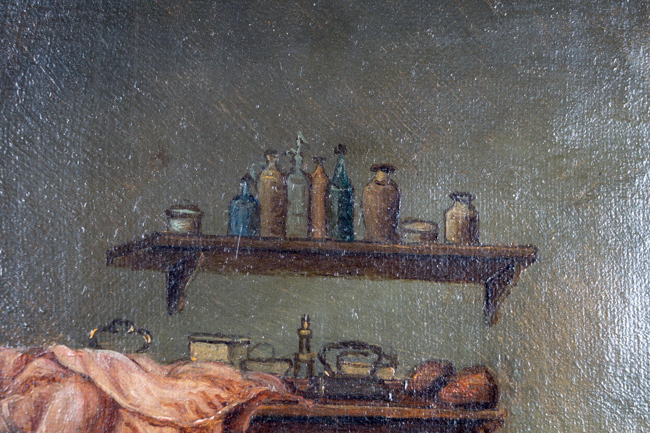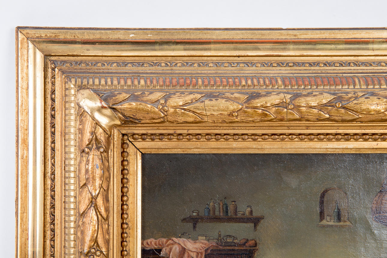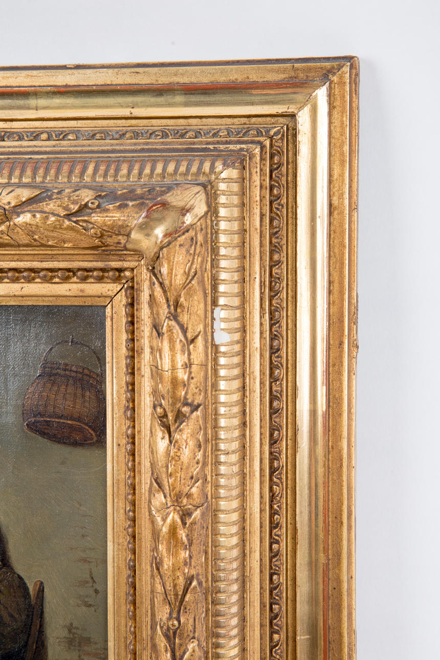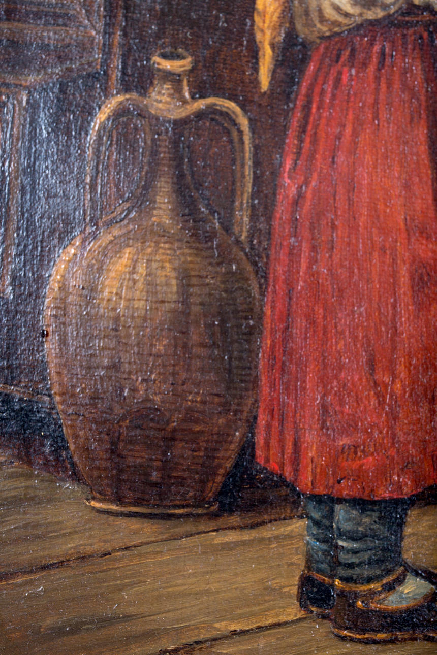Unbekannter Künstler, Gemälde, Genreszene, Öl auf Leinwand. Darstellung zweier Kinder im Interieur mit Maus und Katze, unten rechts unleserlich signiert, 25x21cm (45x41cm).