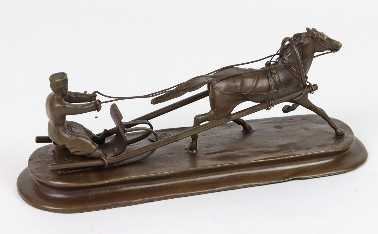 Bronze -Figur, Darstellung Pferdeschlitten mit Pferd auf Sockel,russischer Beschriftung und Plakette, Länge 22 cm, Breite 7,5 cm, Höhe 9 cm.
