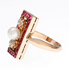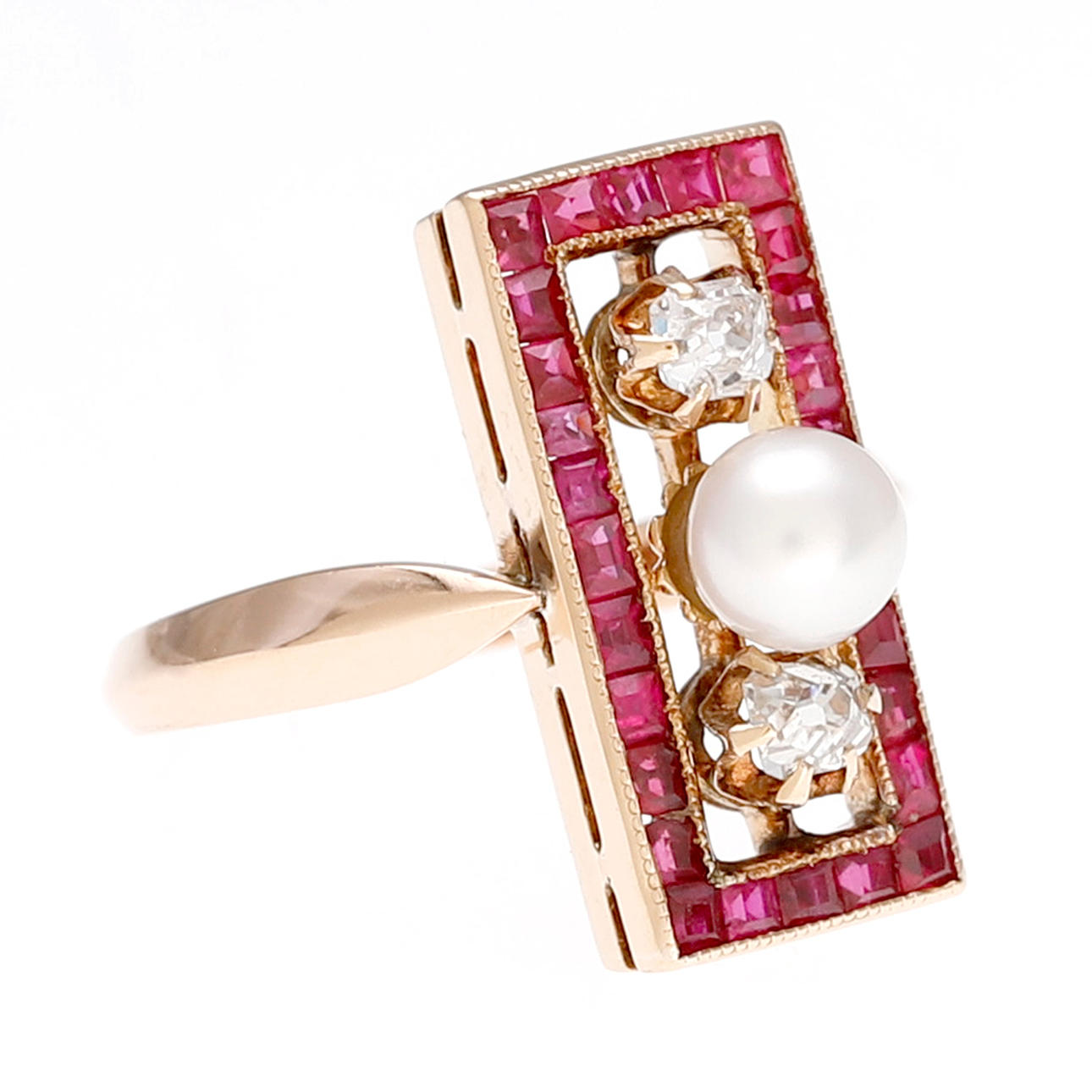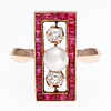 14 Karat Gold, alte Diamanten im Kissenschliff, ca. 0,30 ct, wahrscheinlich synthetische Rubine im Carré-Schliff und Zuchtperle mit 5 mm Durchmesser. Größe 14/54. 5,1 g.