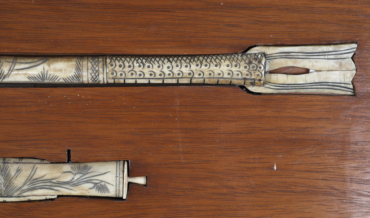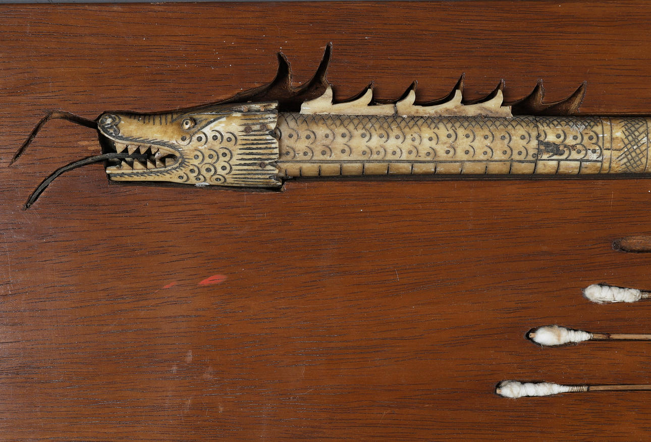 EIN INDONESISCHES SCHNITT-BLASROHR AUS KNOCHEN, MODELLIERT ALS DRACHE.