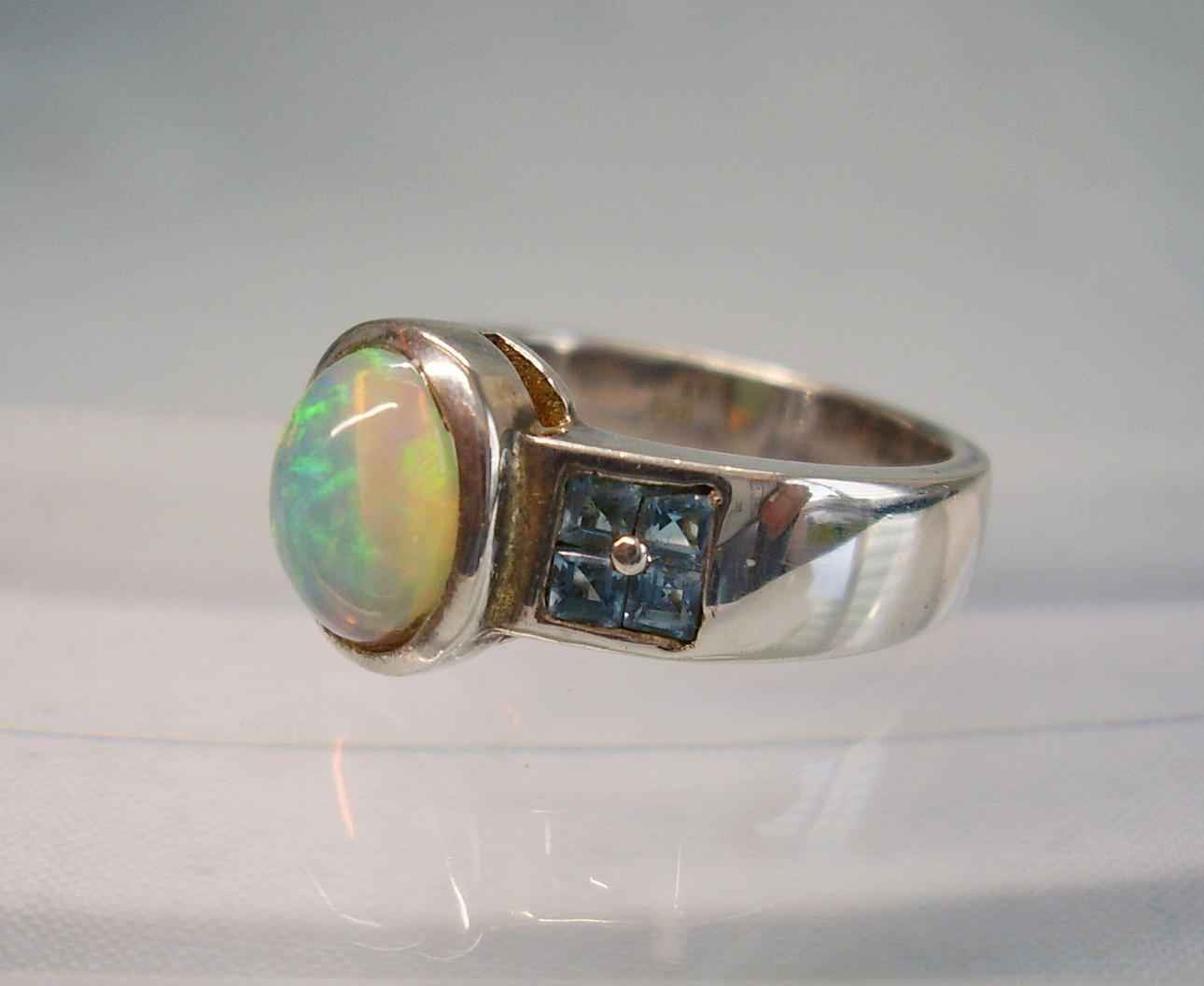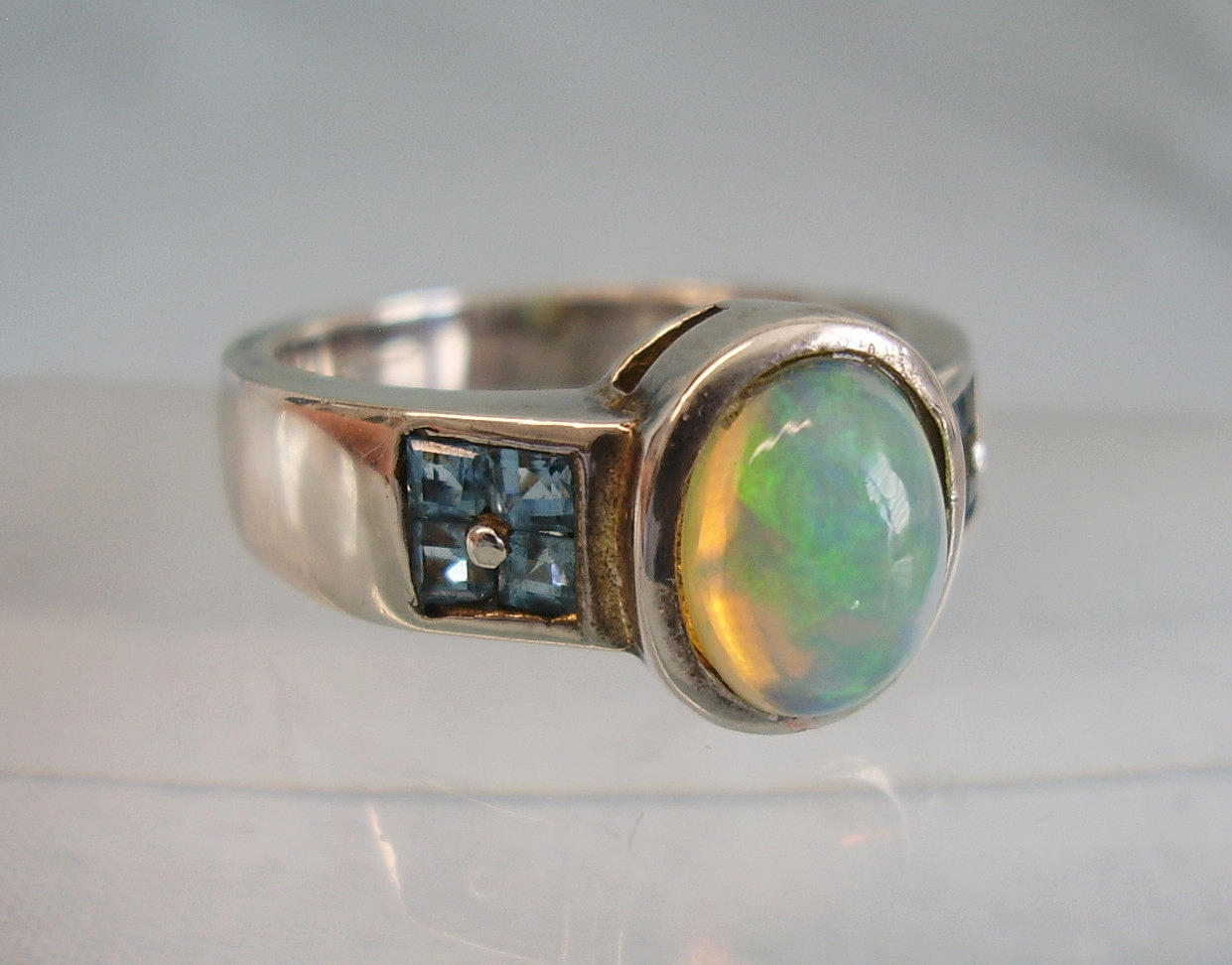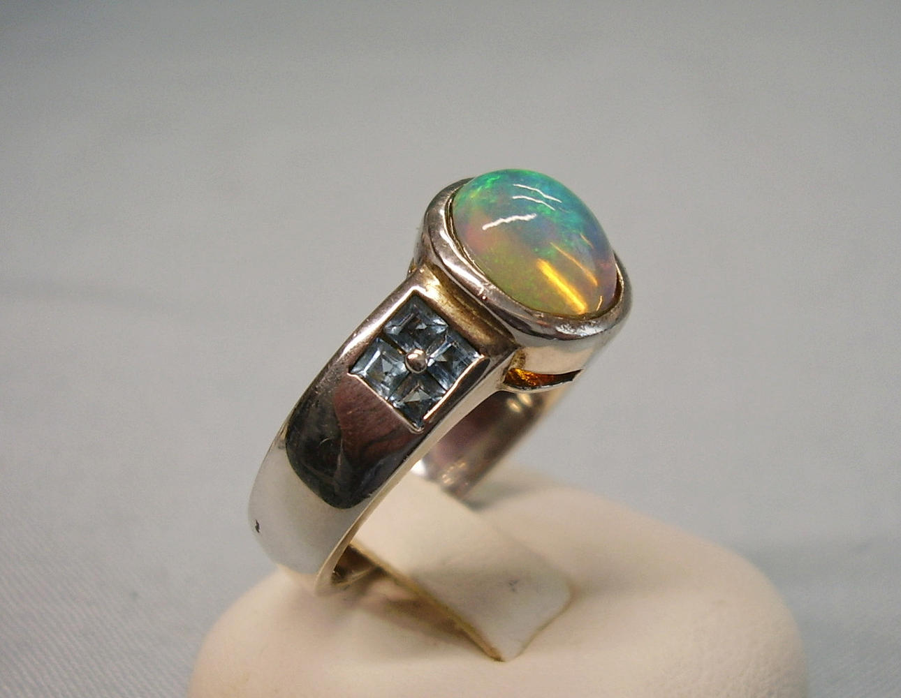 Er ist besetzt mit einem ovalen Voll-Opal in feurigem Farbenspiel irisierend. Er wird flankiert von jeweils vier facettierten hellen Blautopasen im Karée-Schliff.