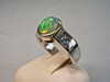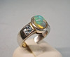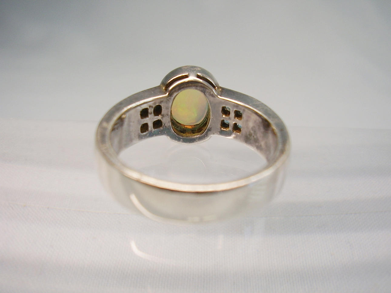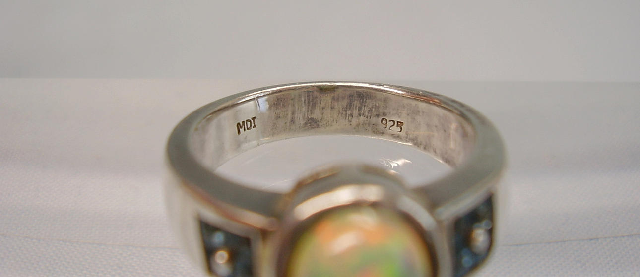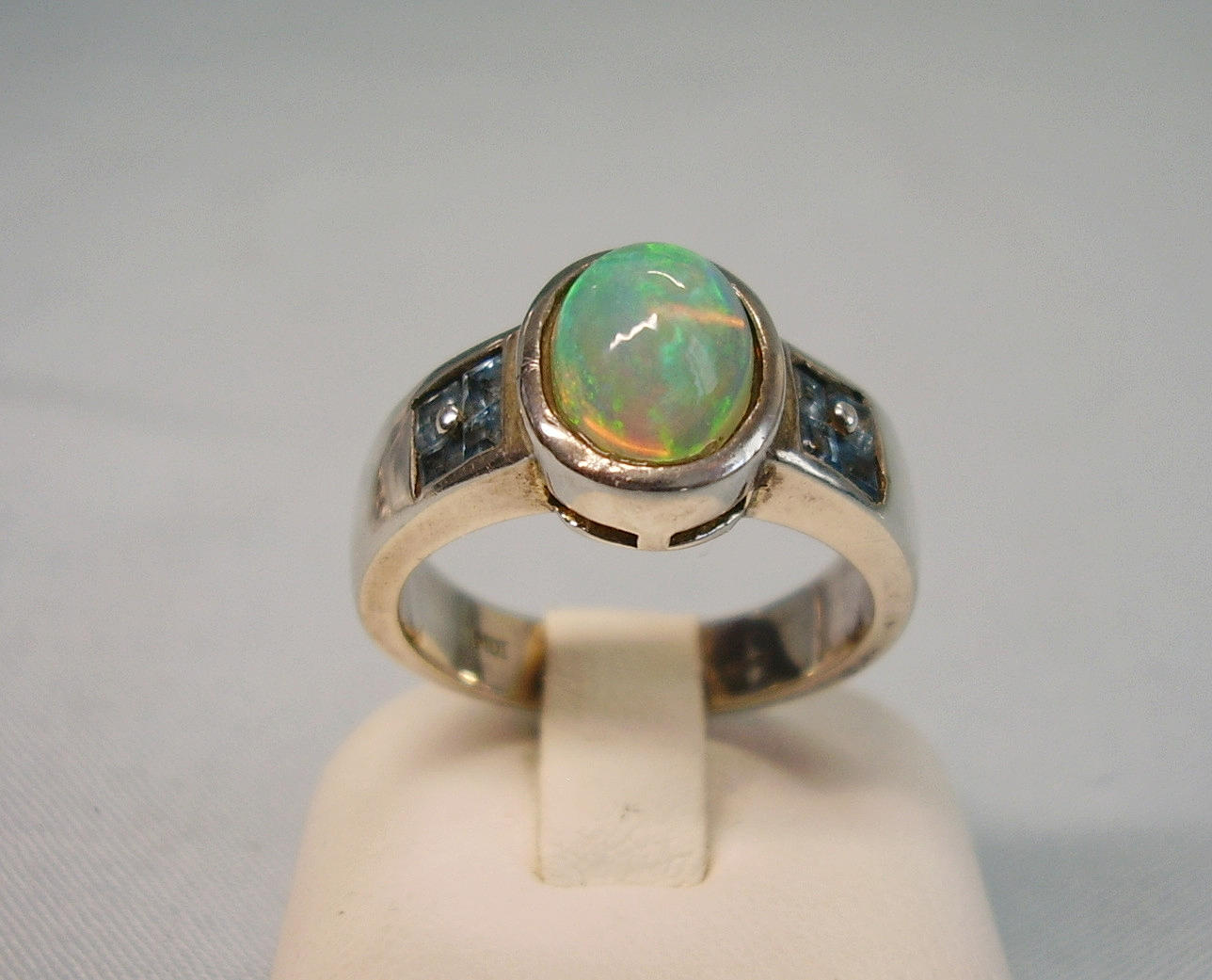 Er ist besetzt mit einem ovalen Voll-Opal in feurigem Farbenspiel irisierend. Er wird flankiert von jeweils vier facettierten hellen Blautopasen im Karée-Schliff.