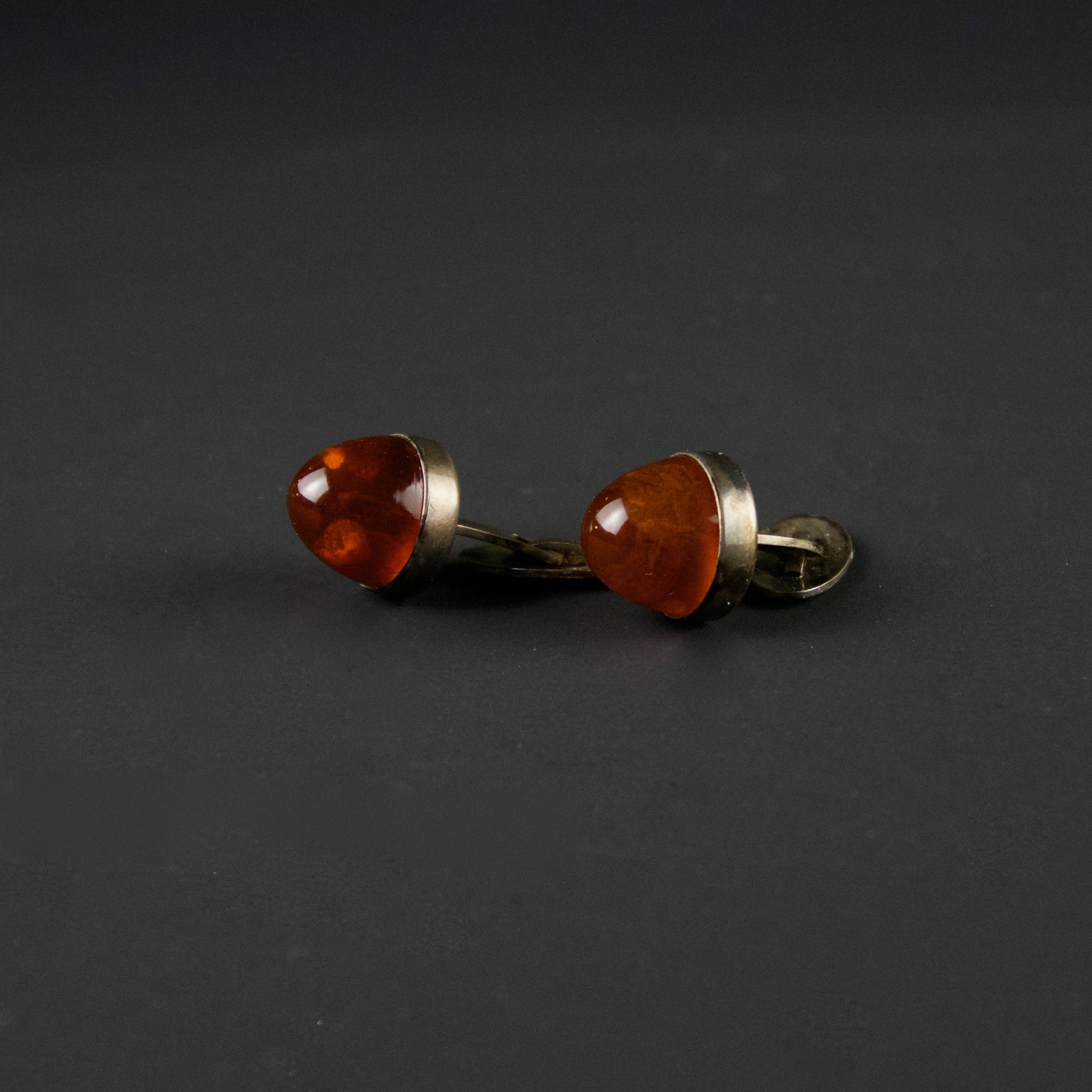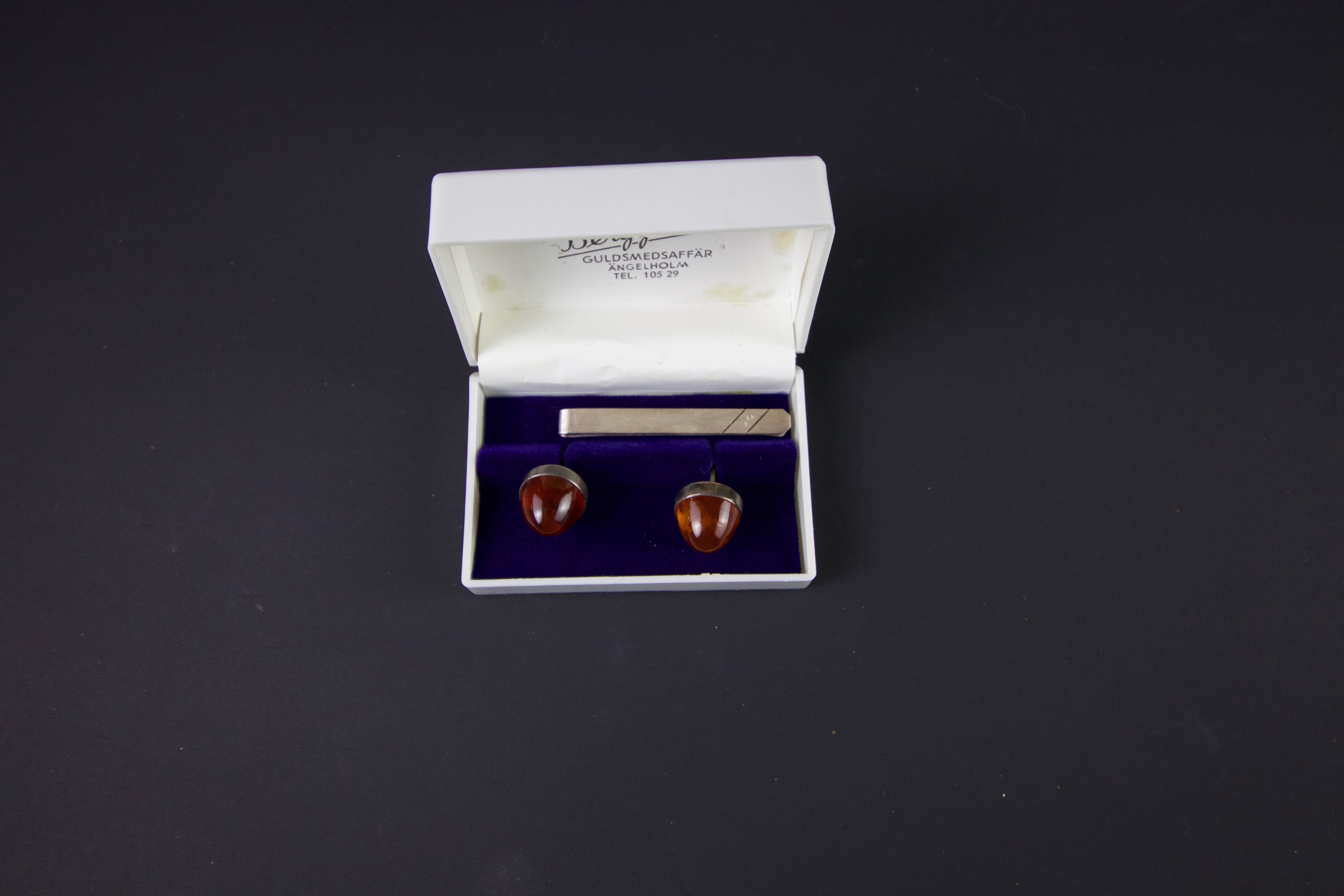 1745290. KRAWATTENNADEL und MANSCHETTENKNÖPFE, Silber und Bernstein.
