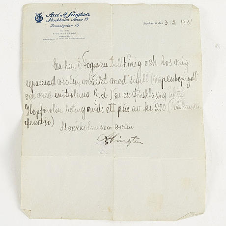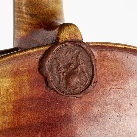 mit Bogen, sowie Koffer, Länge der Geige ca. 60 cm Begleitendes Zertifikat ausgestellt von Axel A. Lington, Geigenbauer, datiert 12.03.1931, mit folgendem Text: Eine Violine von Mr. Fogman und repariert von mich, gekennzeichnet mit einem Siegel (gepanzert und mit den Initialen GL) ist eine erstklassige echte Hopfvioline zum Preis von SEK 250 (zweihundertfünfzig), Stockholm wie oben, A.Lington.