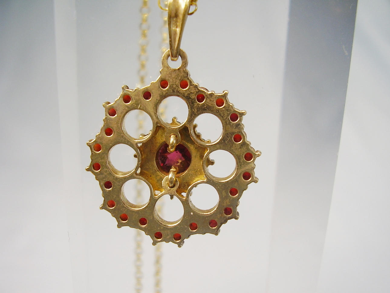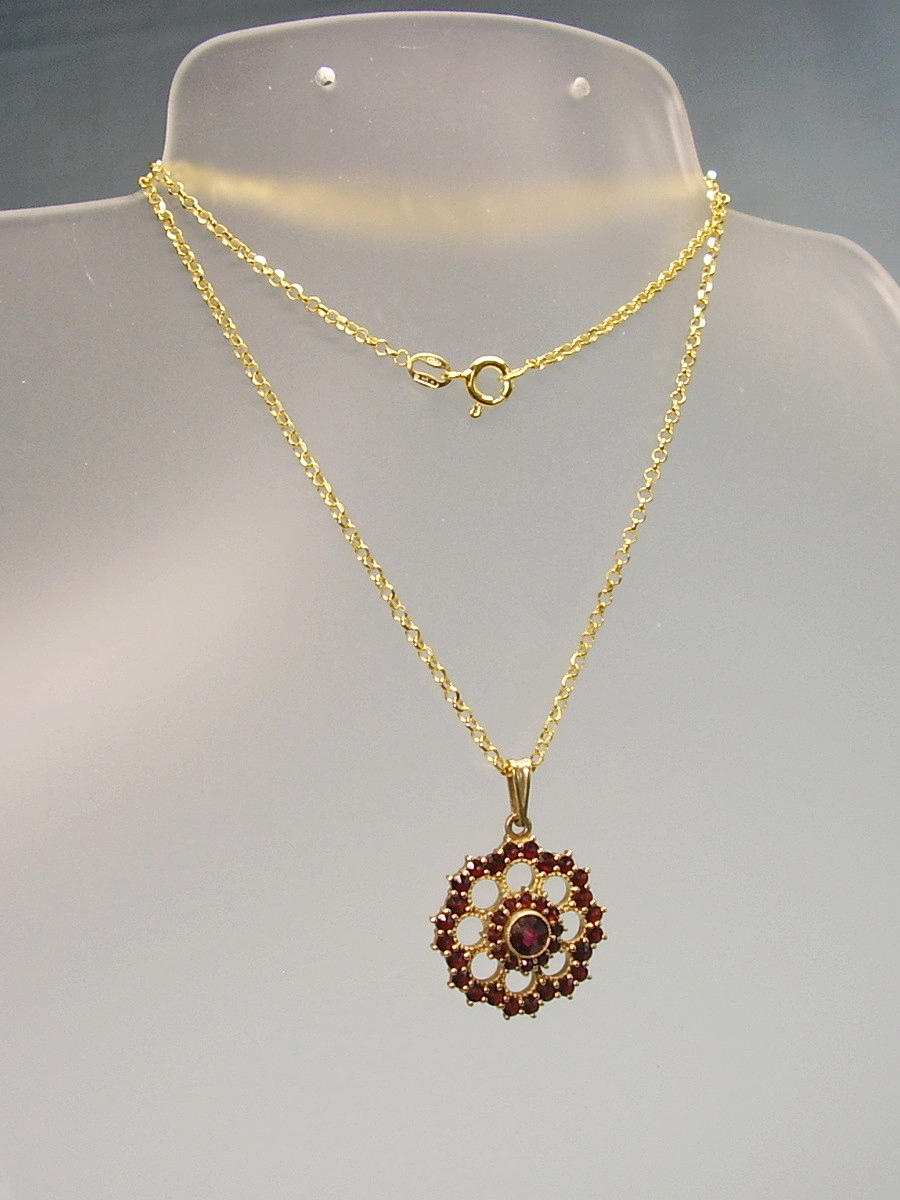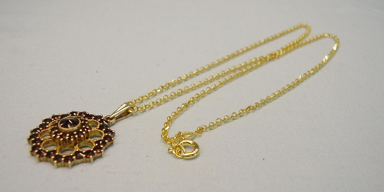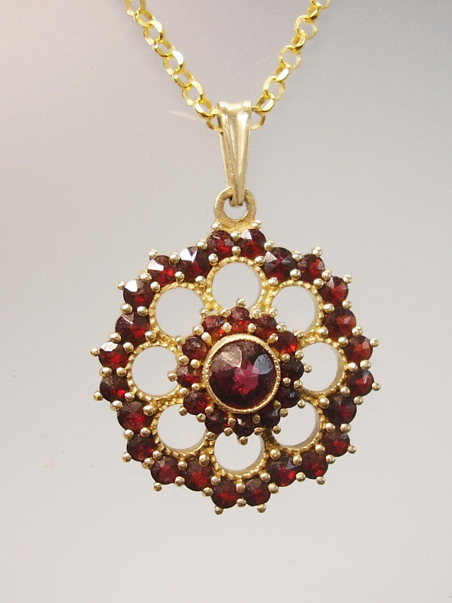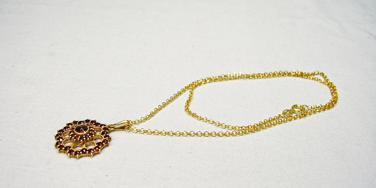 Er ist als Blütenrosette ausgeführt und mit rund facettierten, natürlichen Granaten im antiken Rosenschliff besetzt.