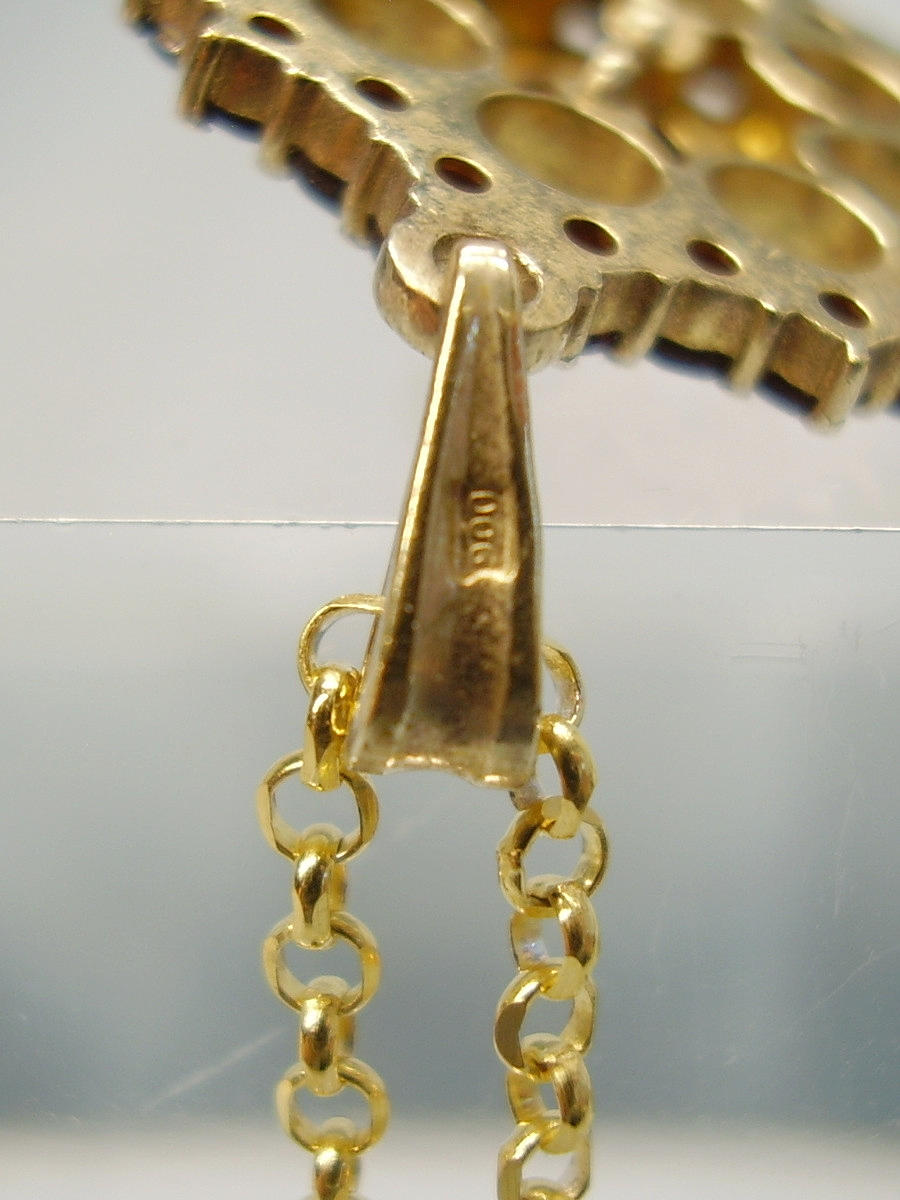 Der antike Anhänger ist in Silber 900 gearbeitet und punziert, dazu ist er komplett in Gelbgold 14 Karat vergoldet.