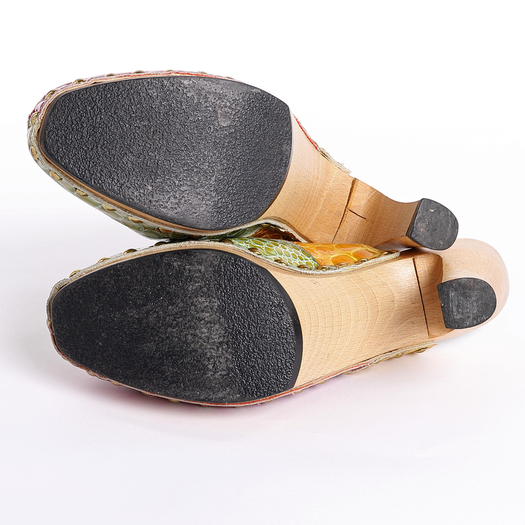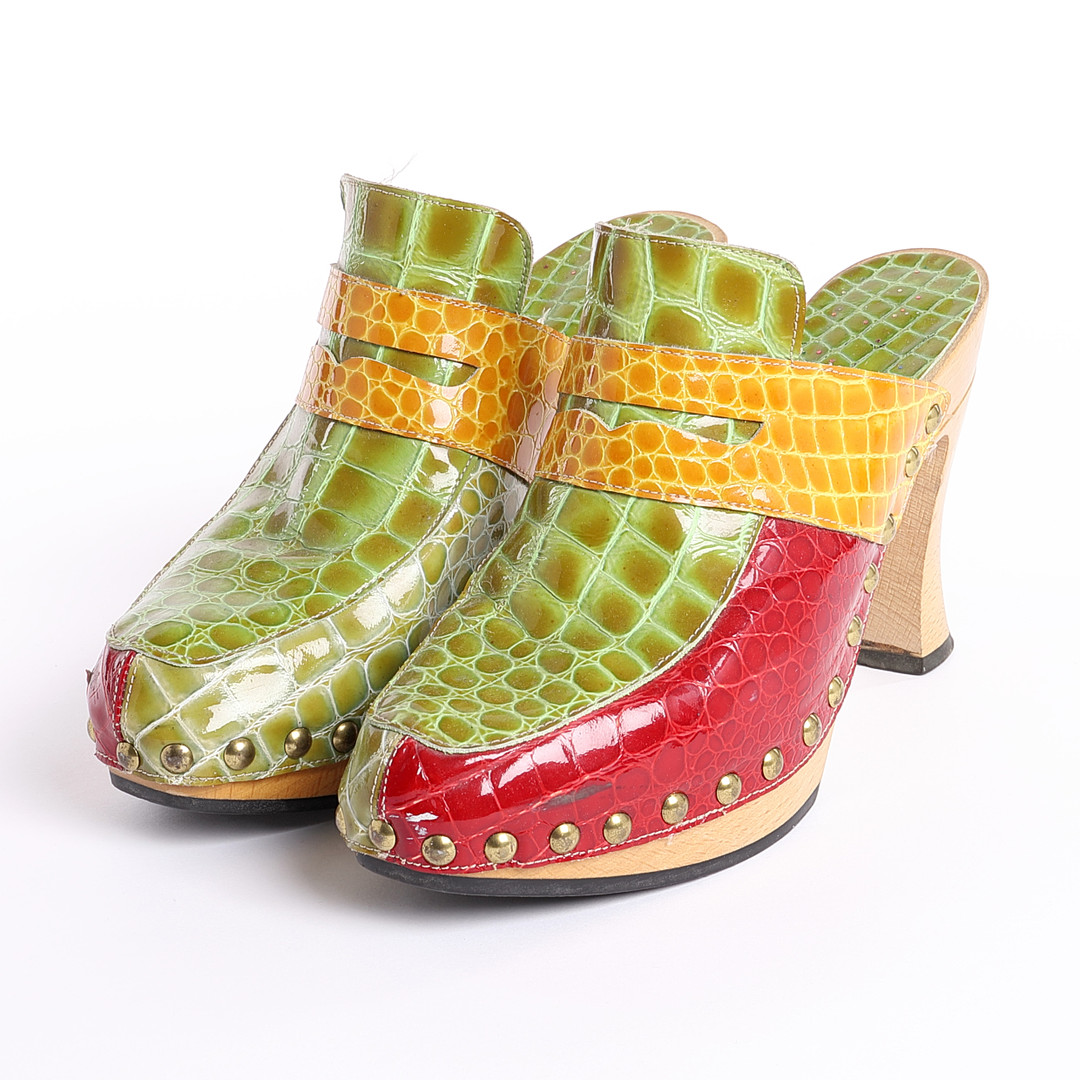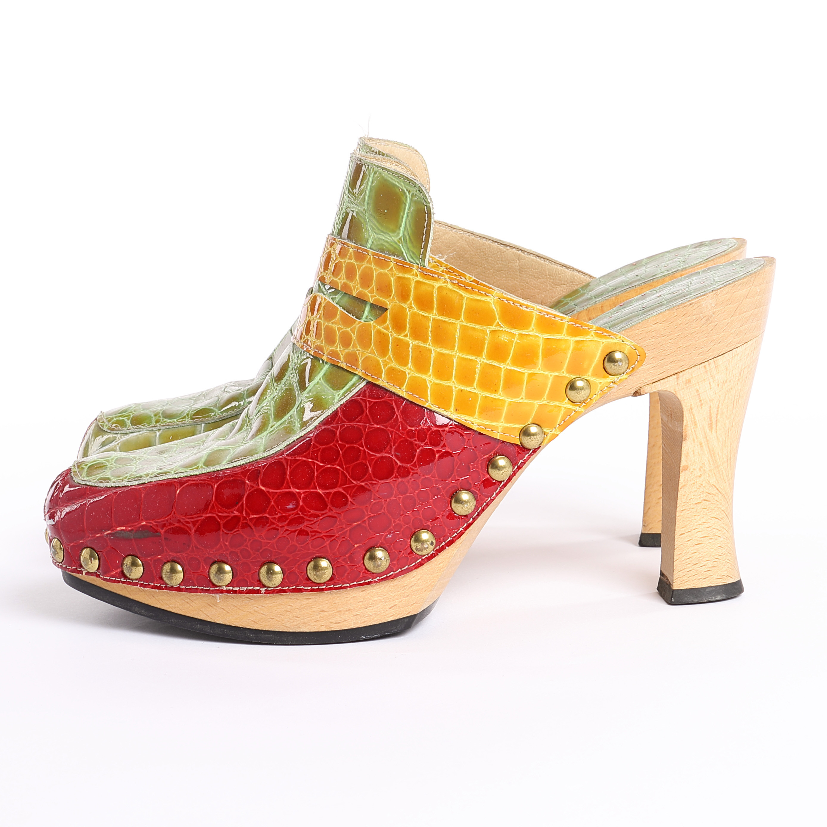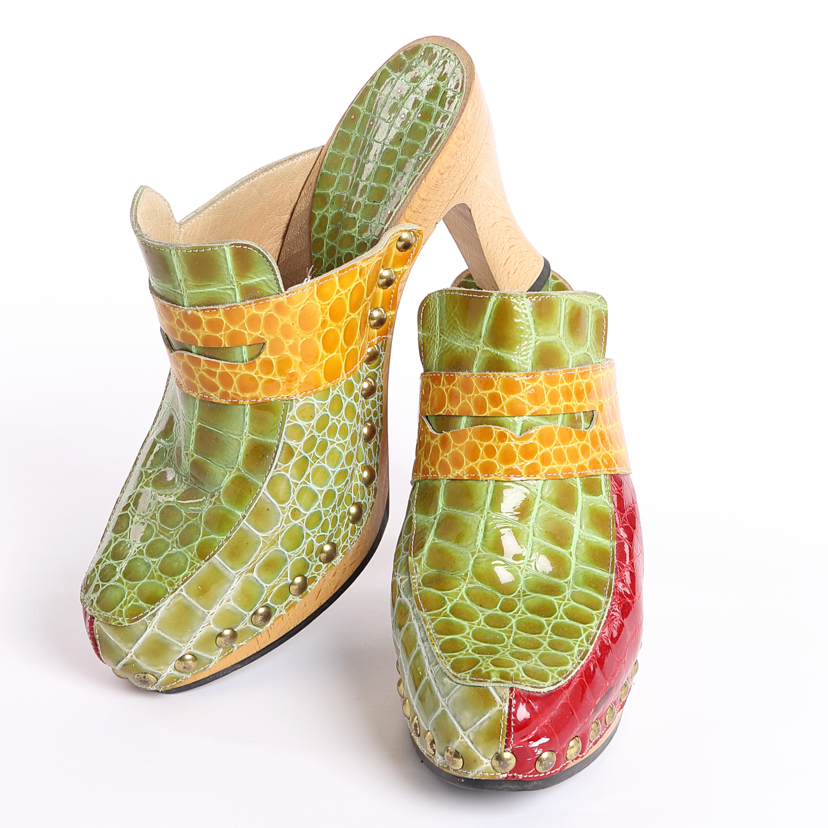 1753409. Clogs MIT ABSATZ, Krokolack und Leder, 90er Jahre.