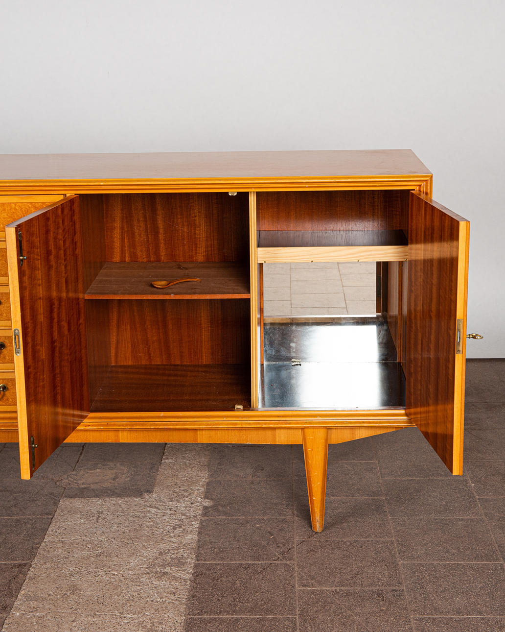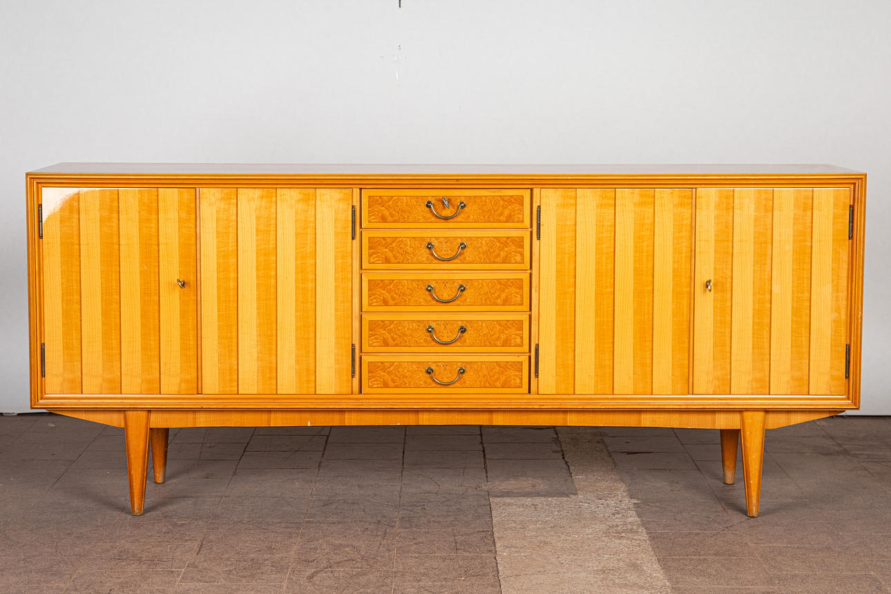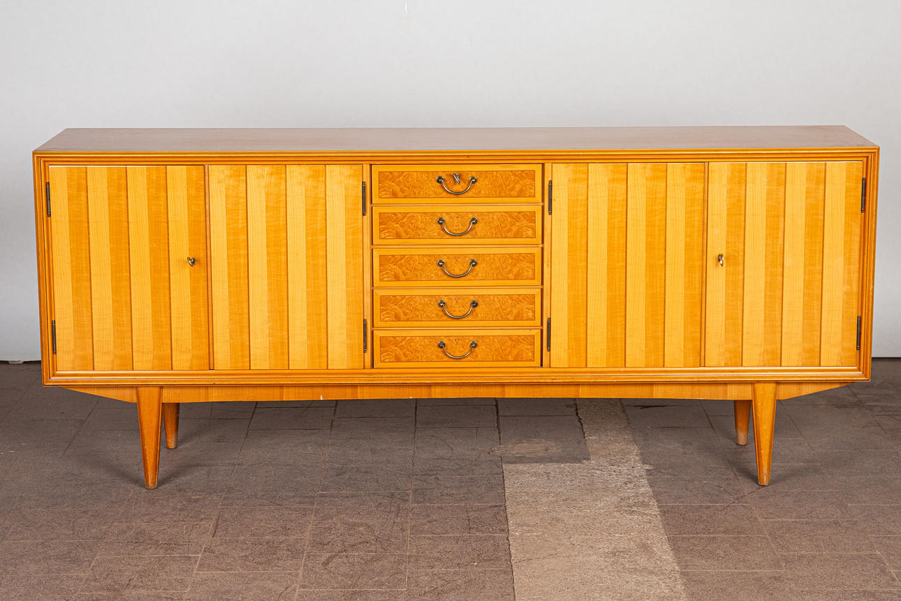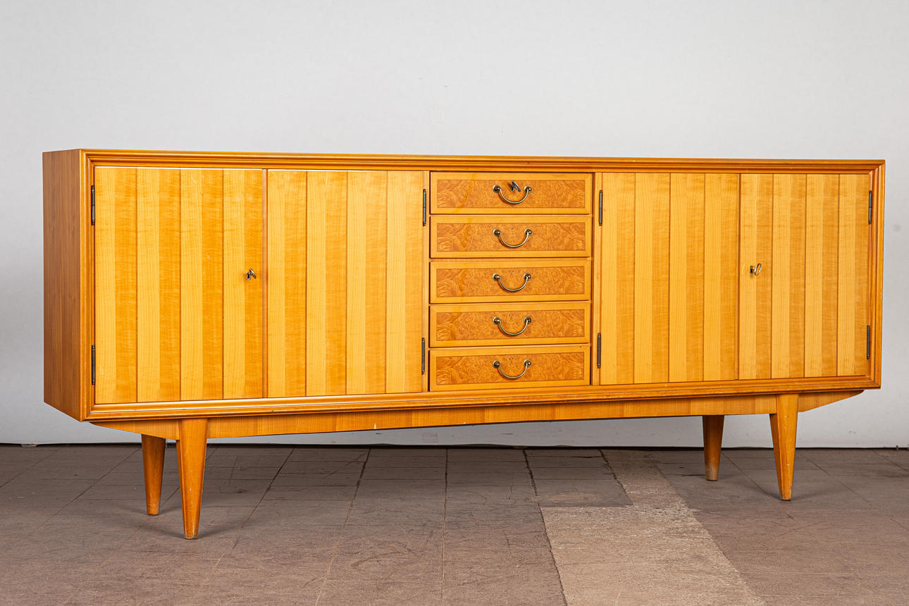 Sideboard, Kirschbaum, Messing, 1950er Jahre. Sideboard mit einem kastenförmigen Korpus aus Kirschbaumholz mit Holzintarsien, rechts und links jeweils mit einer verschließbaren Doppeltür versehen, sowie mittig mit fünf Schüben mit Messinggriffen, oberster Schub verschließbar, zwei Schübe mit grünen Besteckeinlagen versehen, innen mit Einlegeböden ausgestattet, Schlüssel vorhanden, H.93cm, L.220cm, B.48cm.